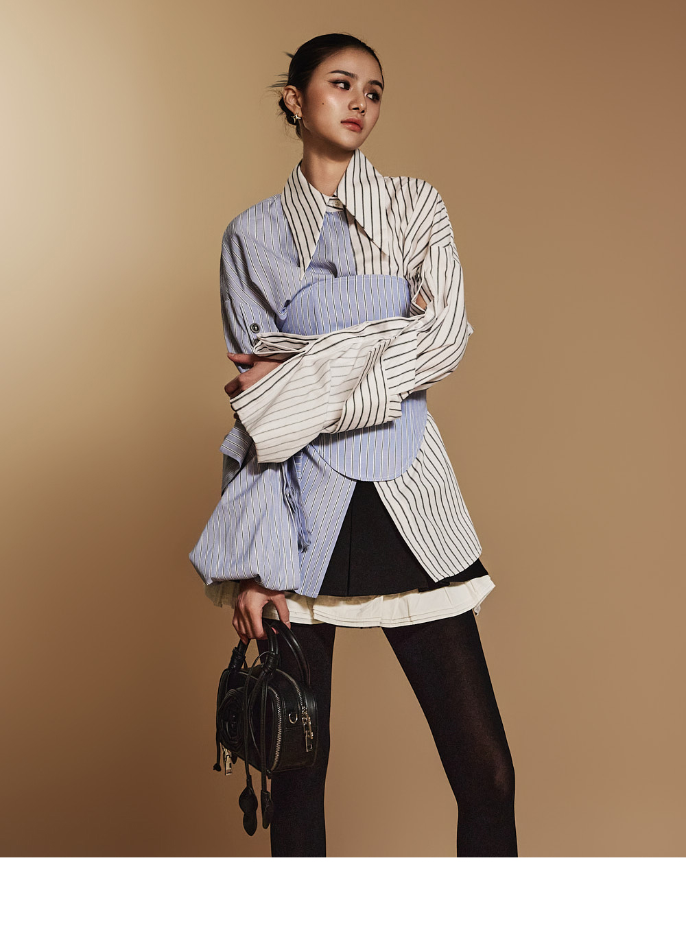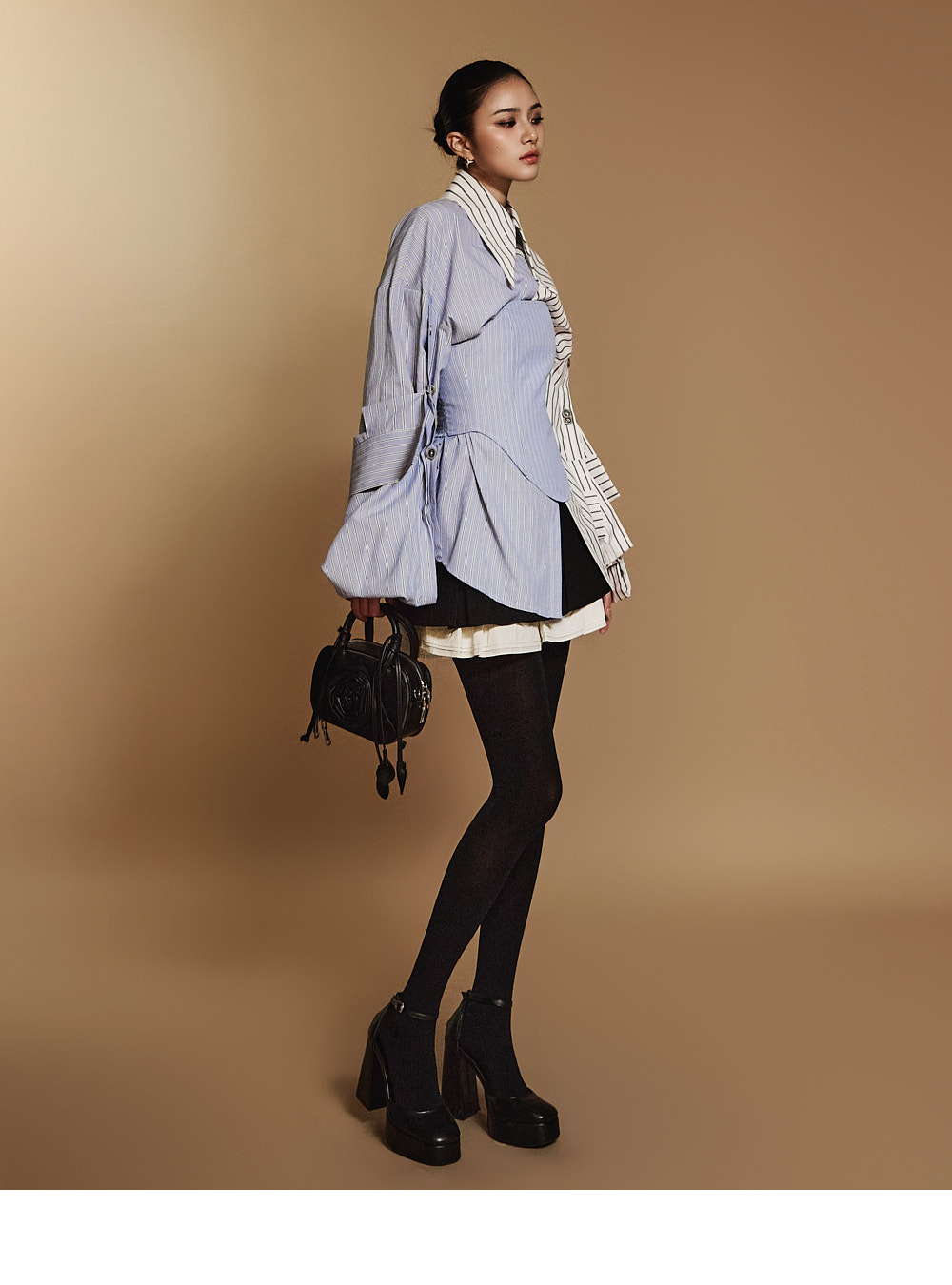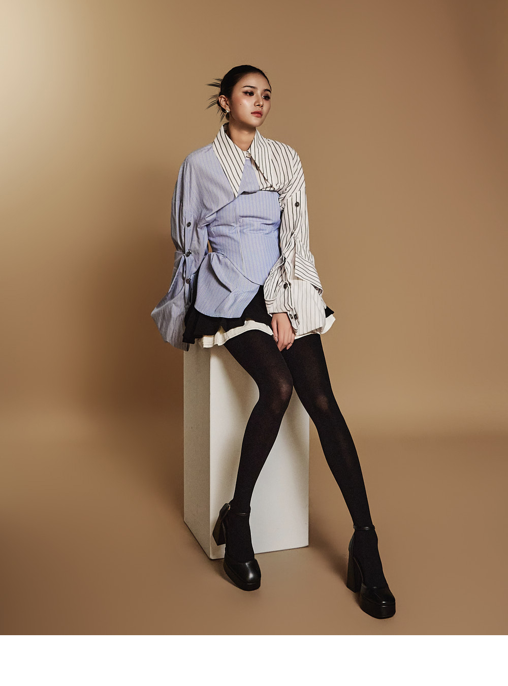 这是一款独特设计的叠层半身裙。 采用坚挺的聚酯纤维、粘纤及多种材质混纺制作,提供S、M两种尺码,可根据体型选择合适款式。 后背拉链设计便于穿脱,低腰设计搭配曲线细节收尾腰线,增添独特感。 裙身为喇叭型设计,下摆加入拼色荷叶边叠层,展现女性柔美气质,提升整体造型感。 迷你长度设计拉长腿部线条,推荐给DINT的客户们。 模特身高171CM,穿S码,黑色款。
