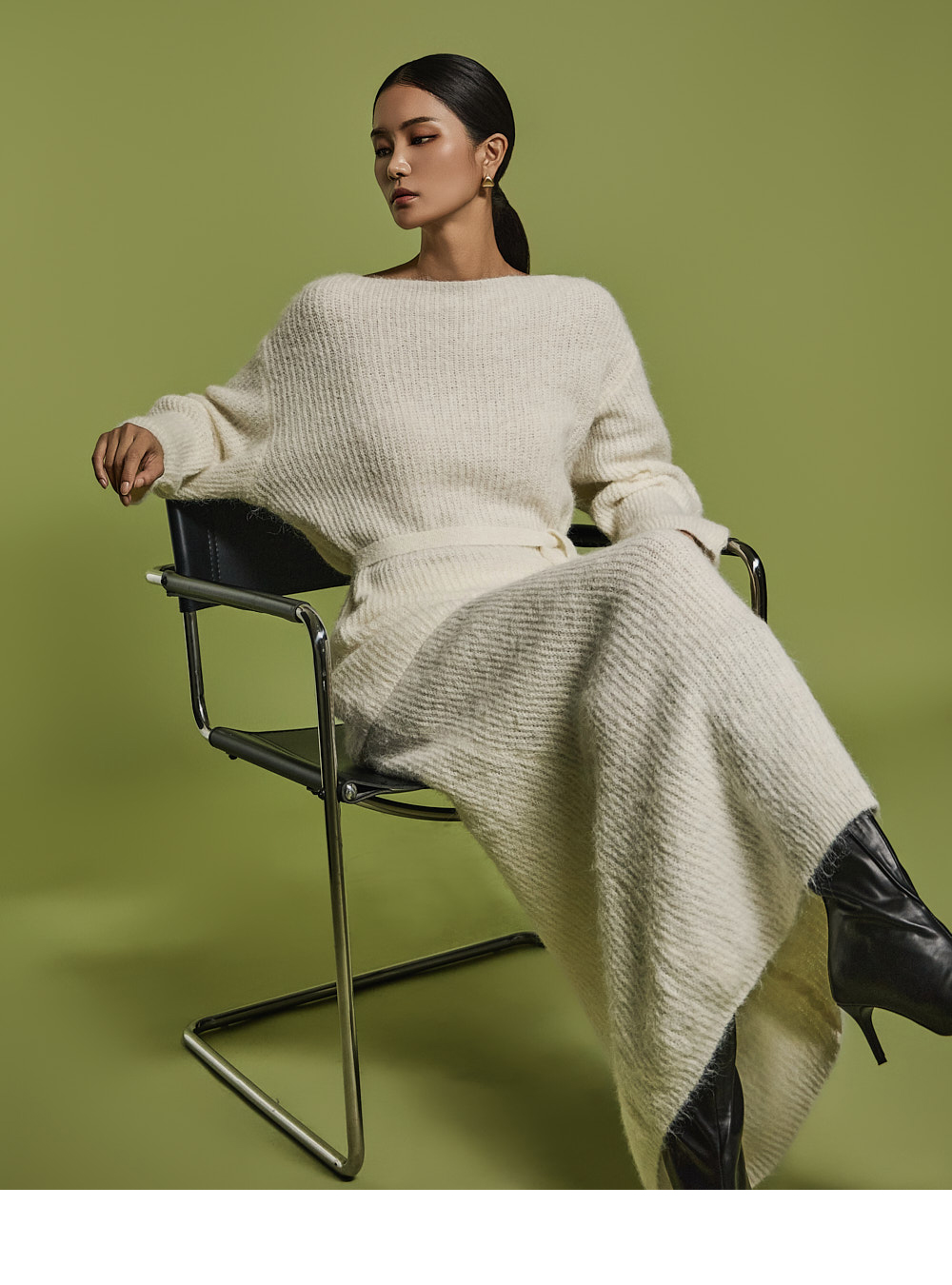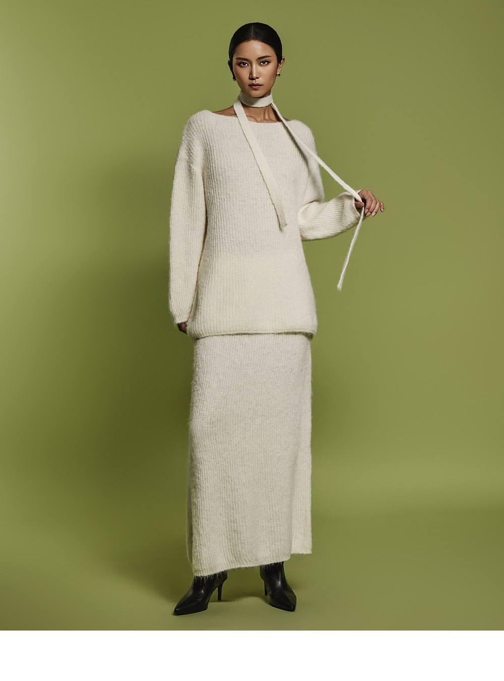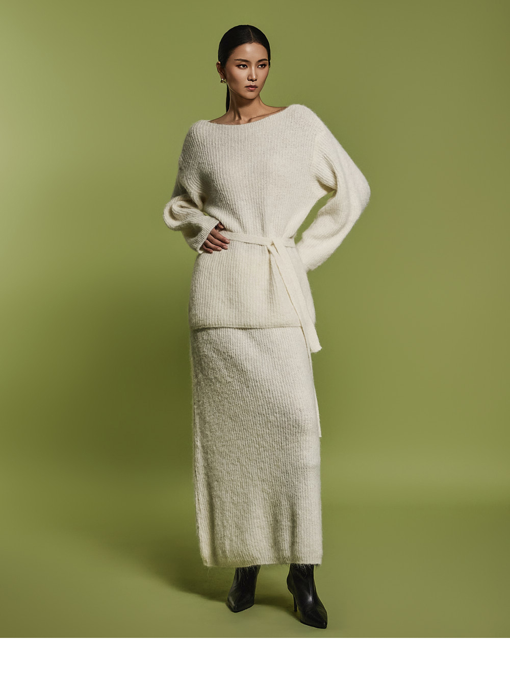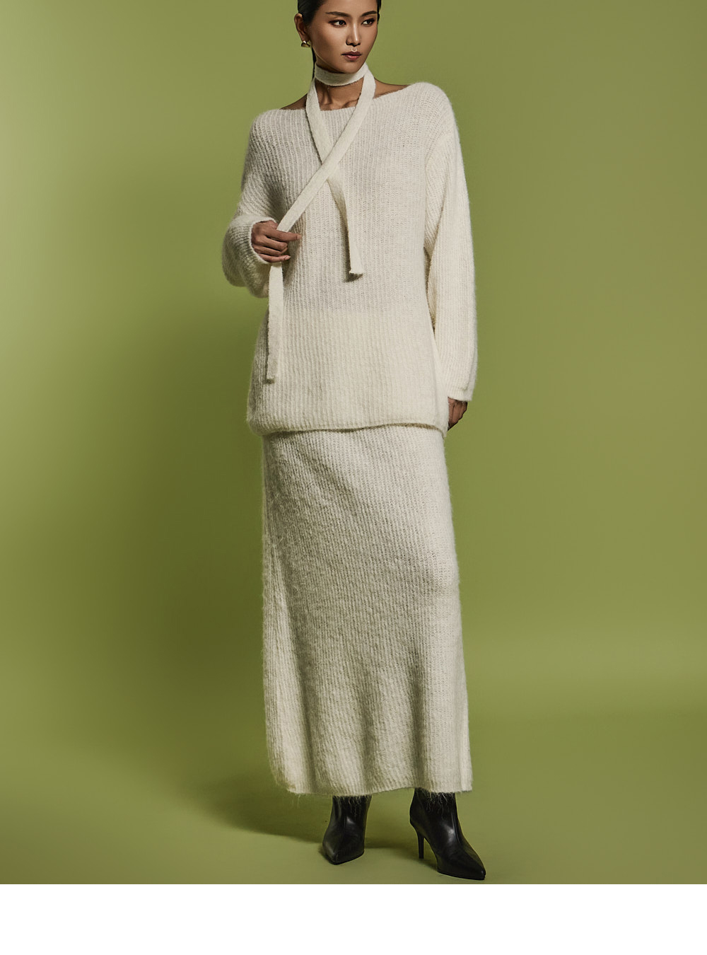 休闲氛围的两件套。 采用柔软且结实的羊驼毛面料与聚酯纤维、尼龙混纺面料制作,ONE 尺码设计,可根据体型自由穿着。 上衣无需额外扣件,宽松版型便于穿脱,宽松剪裁营造柔美氛围,搭配绑带可实现两种不同穿法。 裙子为长款设计,打造修长腿部线条,腰部松紧设计便于穿脱,宽松 H 型版型便于修饰体型。 设计简洁干练,可与多种外套搭配,适合多样造型,本款推荐给 DINT 客户。 173CM 模特穿 ONE 尺码,IVORY 颜色。