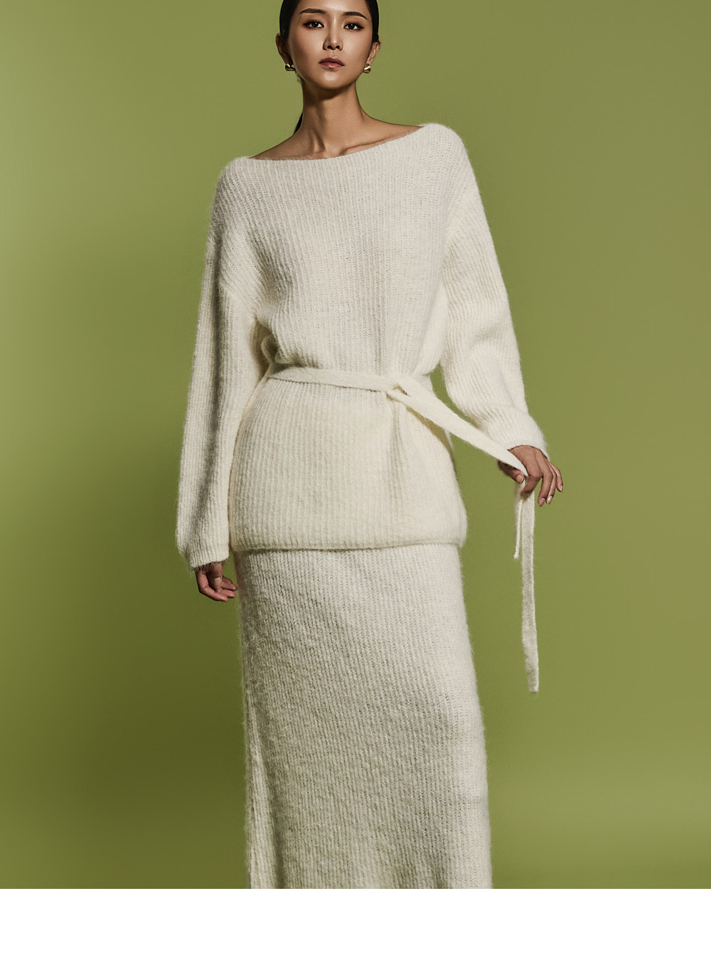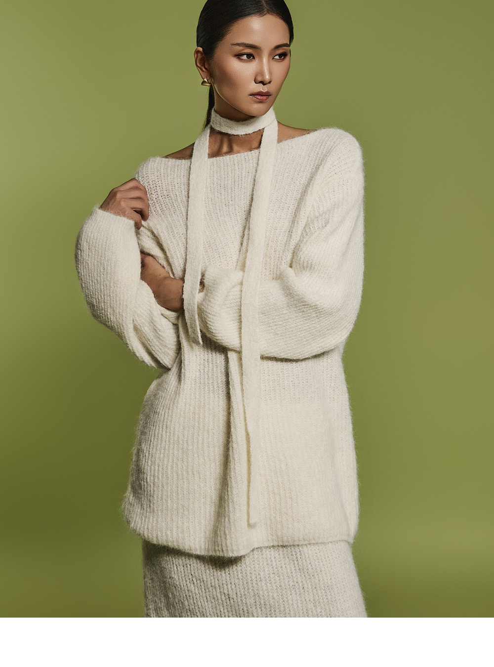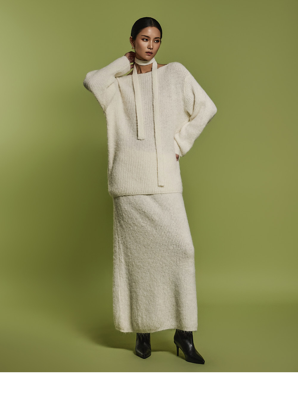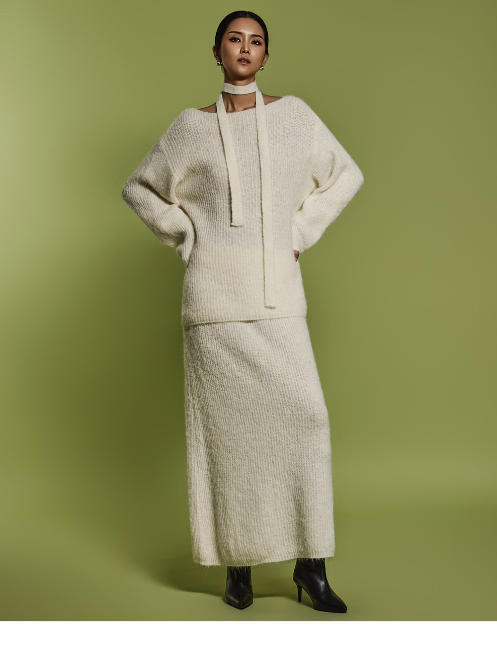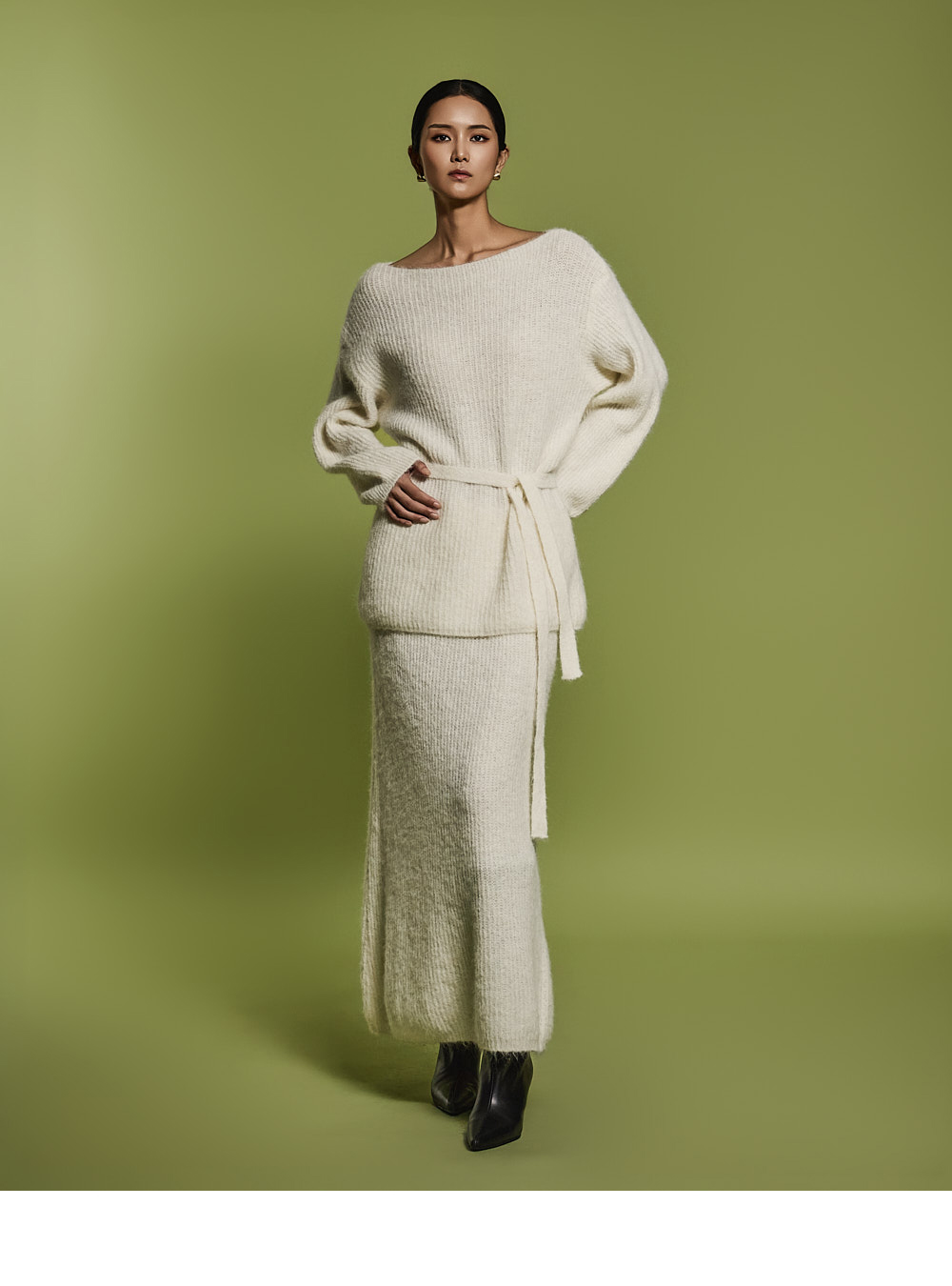 休闲氛围的两件套。 采用柔软且结实的羊驼毛面料与聚酯纤维、尼龙混纺面料制作,ONE 尺码设计,可根据体型自由穿着。 上衣无需额外扣件,宽松版型便于穿脱,宽松剪裁营造柔美氛围,搭配绑带可实现两种不同穿法。 裙子为长款设计,打造修长腿部线条,腰部松紧设计便于穿脱,宽松 H 型版型便于修饰体型。 设计简洁干练,可与多种外套搭配,适合多样造型,本款推荐给 DINT 客户。 173CM 模特穿 ONE 尺码,IVORY 颜色。