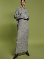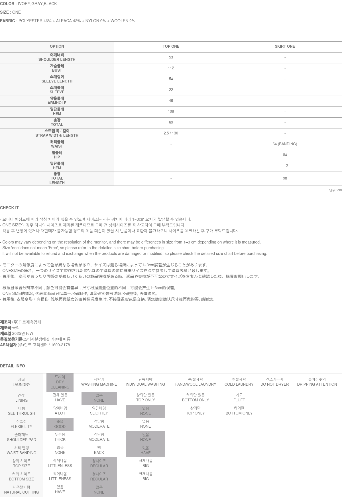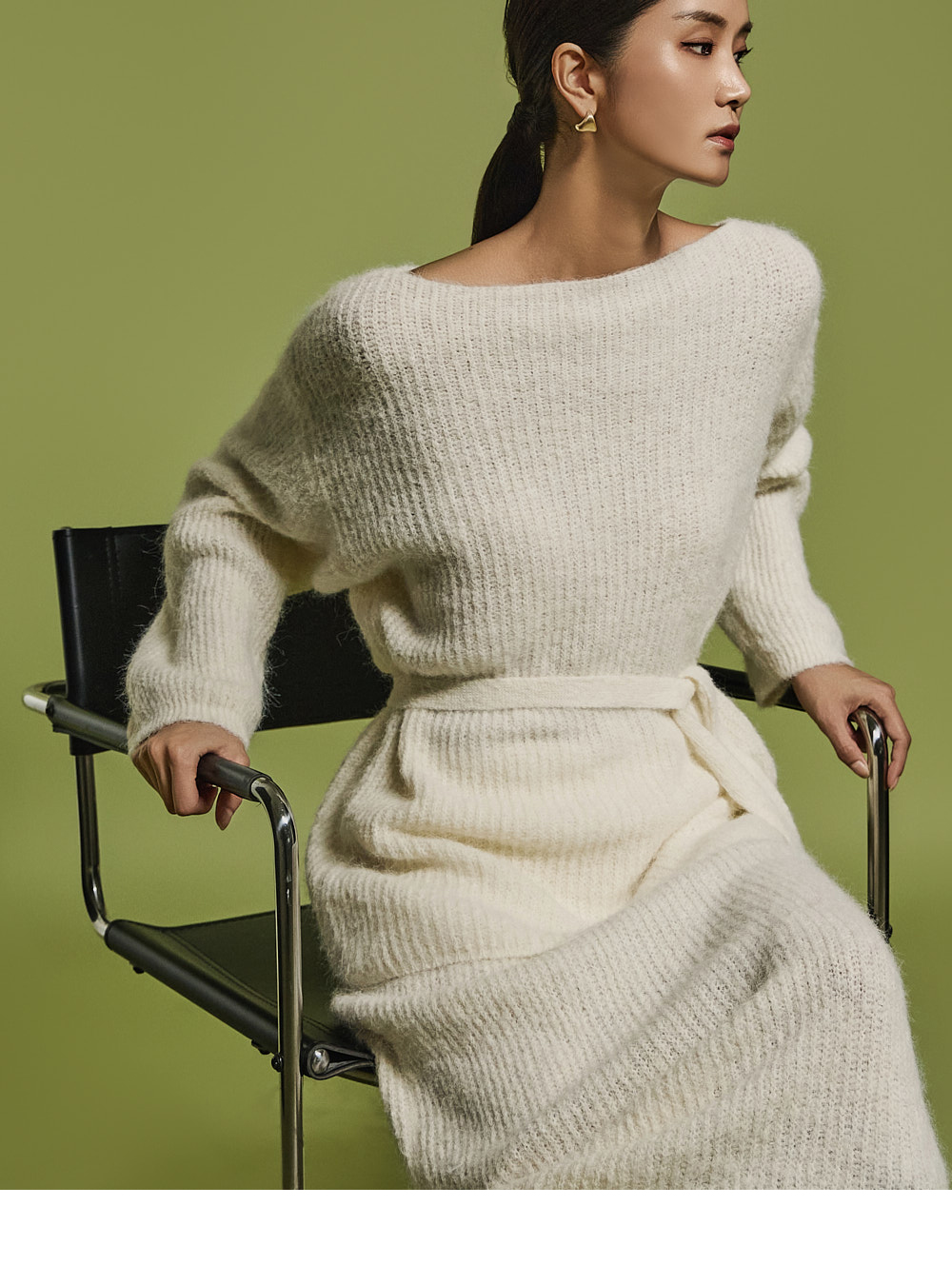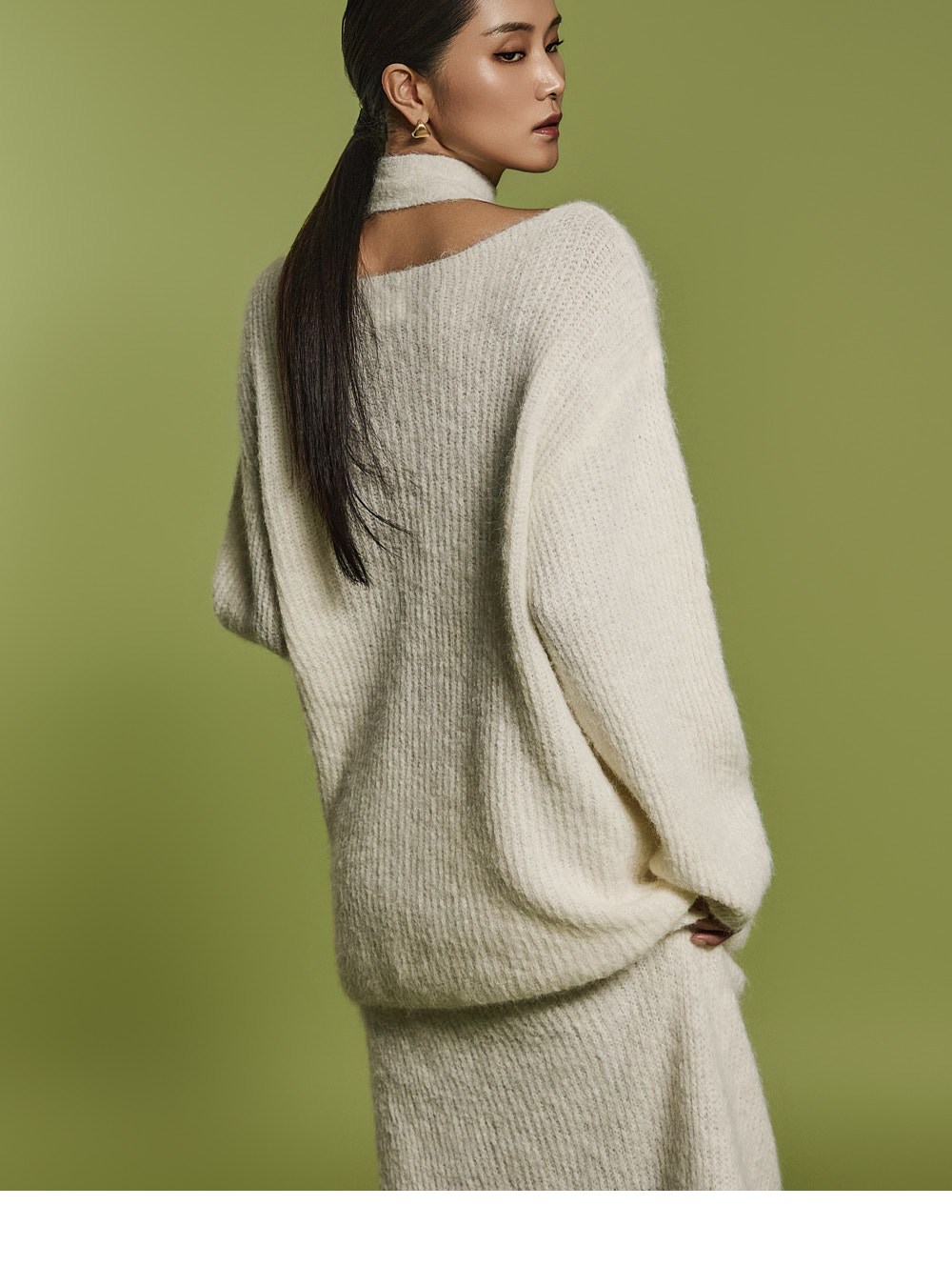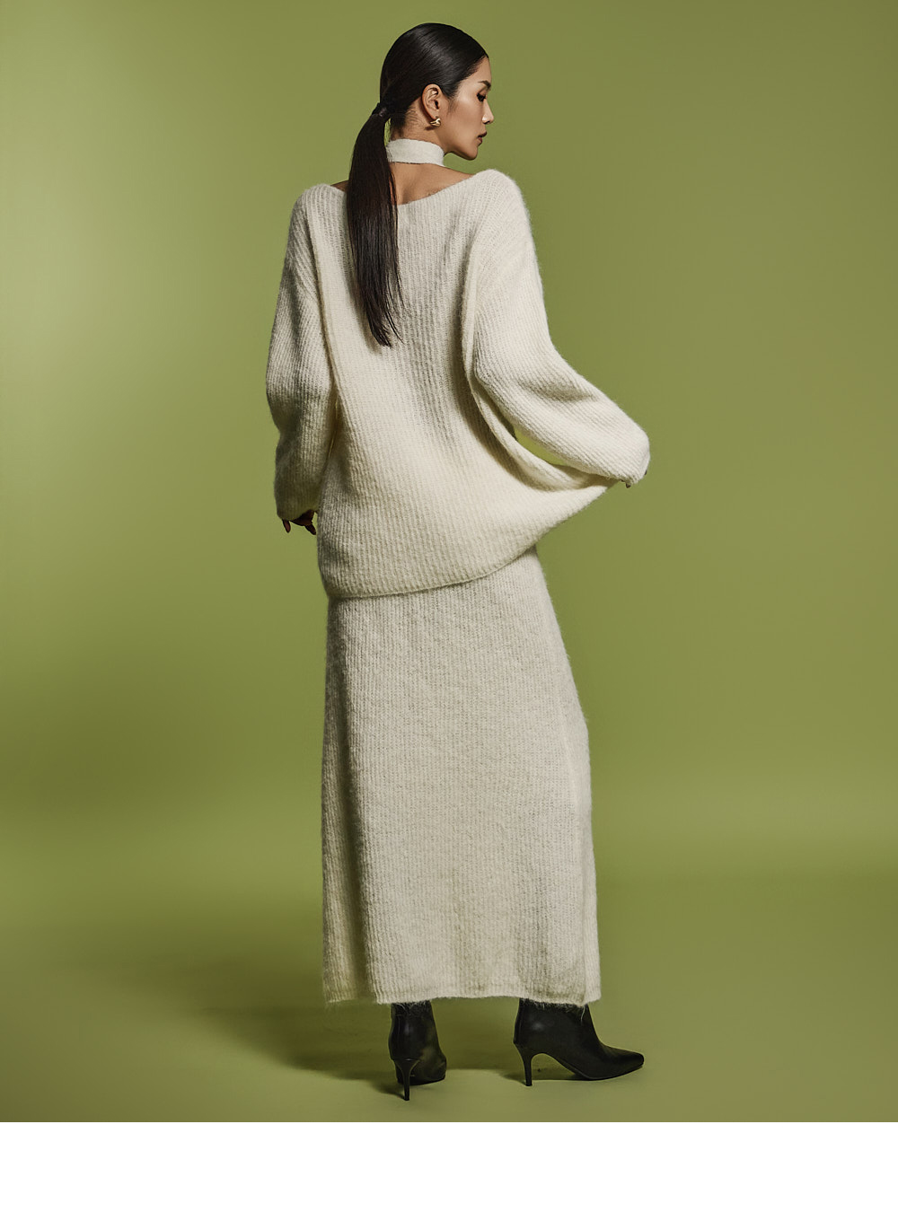 休闲氛围的两件套。 采用柔软且结实的羊驼毛面料与聚酯纤维、尼龙混纺面料制作,ONE 尺码设计,可根据体型自由穿着。 上衣无需额外扣件,宽松版型便于穿脱,宽松剪裁营造柔美氛围,搭配绑带可实现两种不同穿法。 裙子为长款设计,打造修长腿部线条,腰部松紧设计便于穿脱,宽松 H 型版型便于修饰体型。 设计简洁干练,可与多种外套搭配,适合多样造型,本款推荐给 DINT 客户。 173CM 模特穿 ONE 尺码,IVORY 颜色。