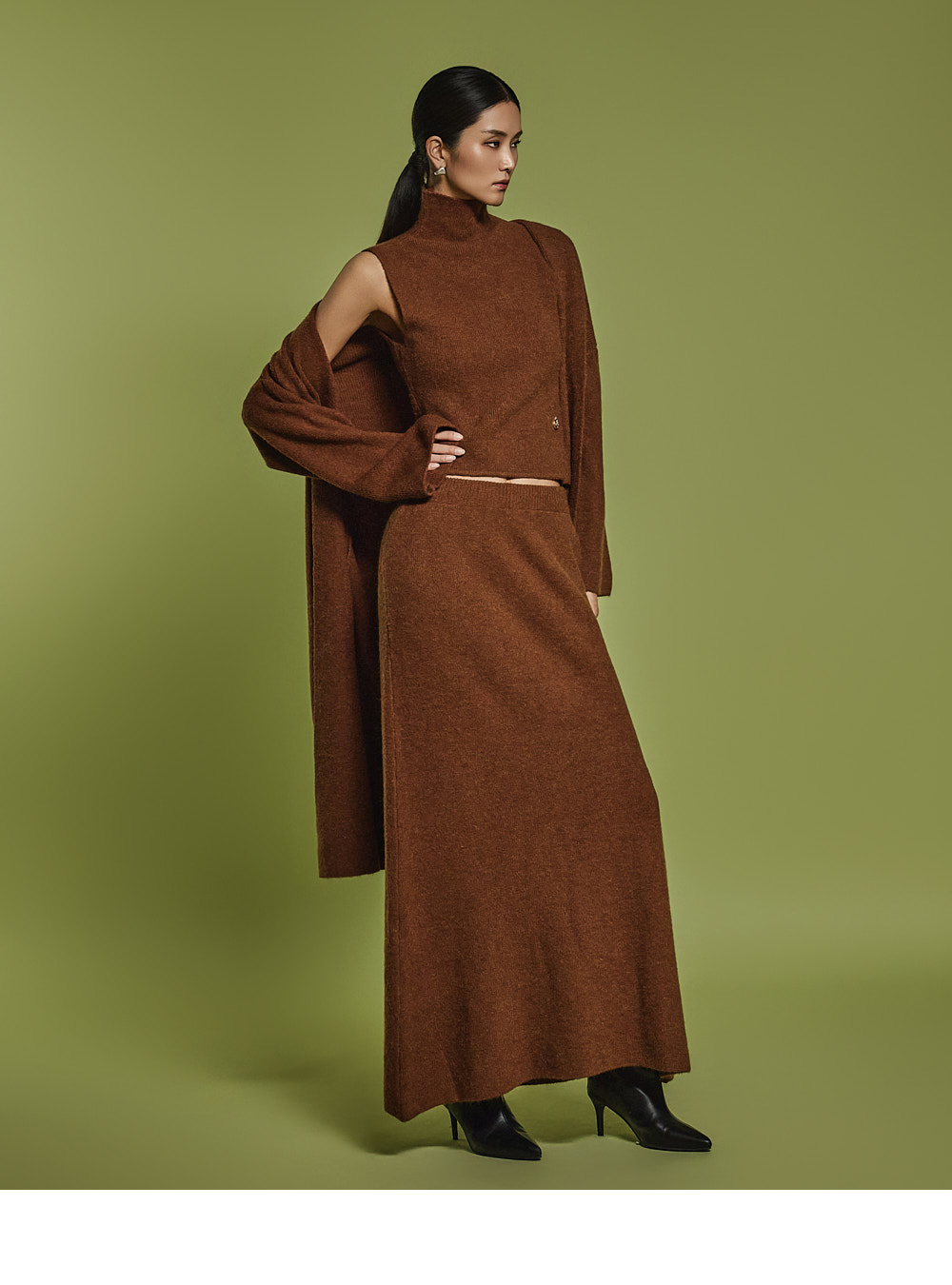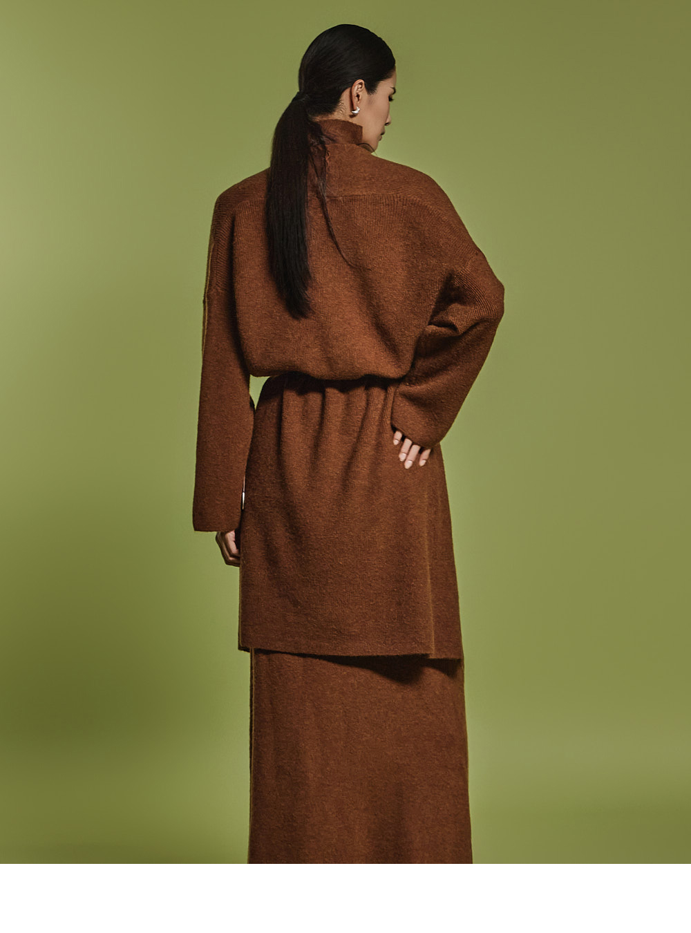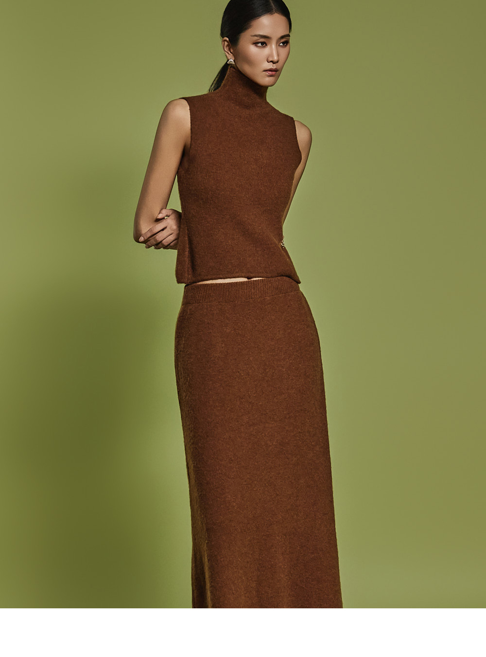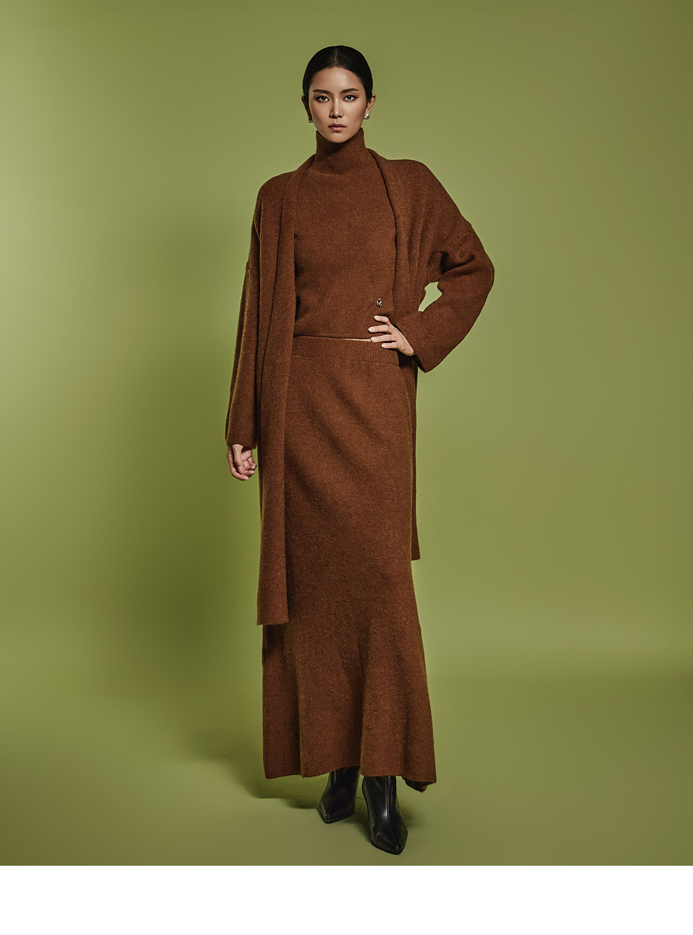 탑은 터틀넥 라인으로 세련된 넥라인을 돋보여드리며,