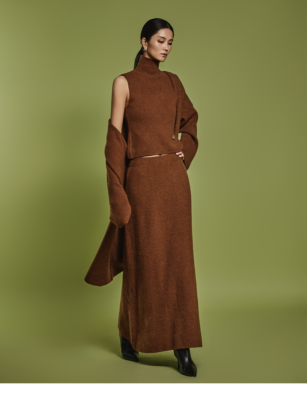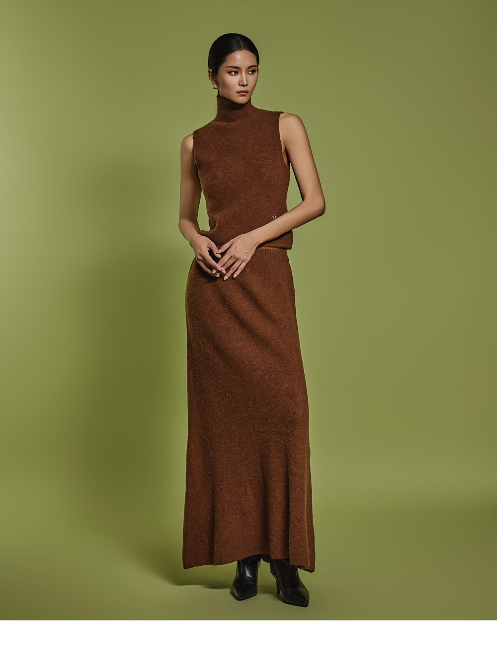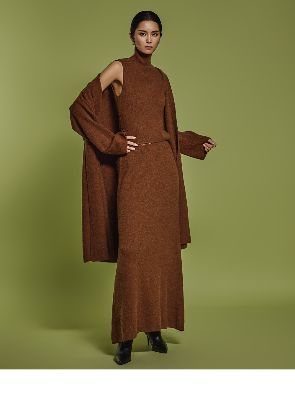 탑은 터틀넥 라인으로 세련된 넥라인을 돋보여드리며,