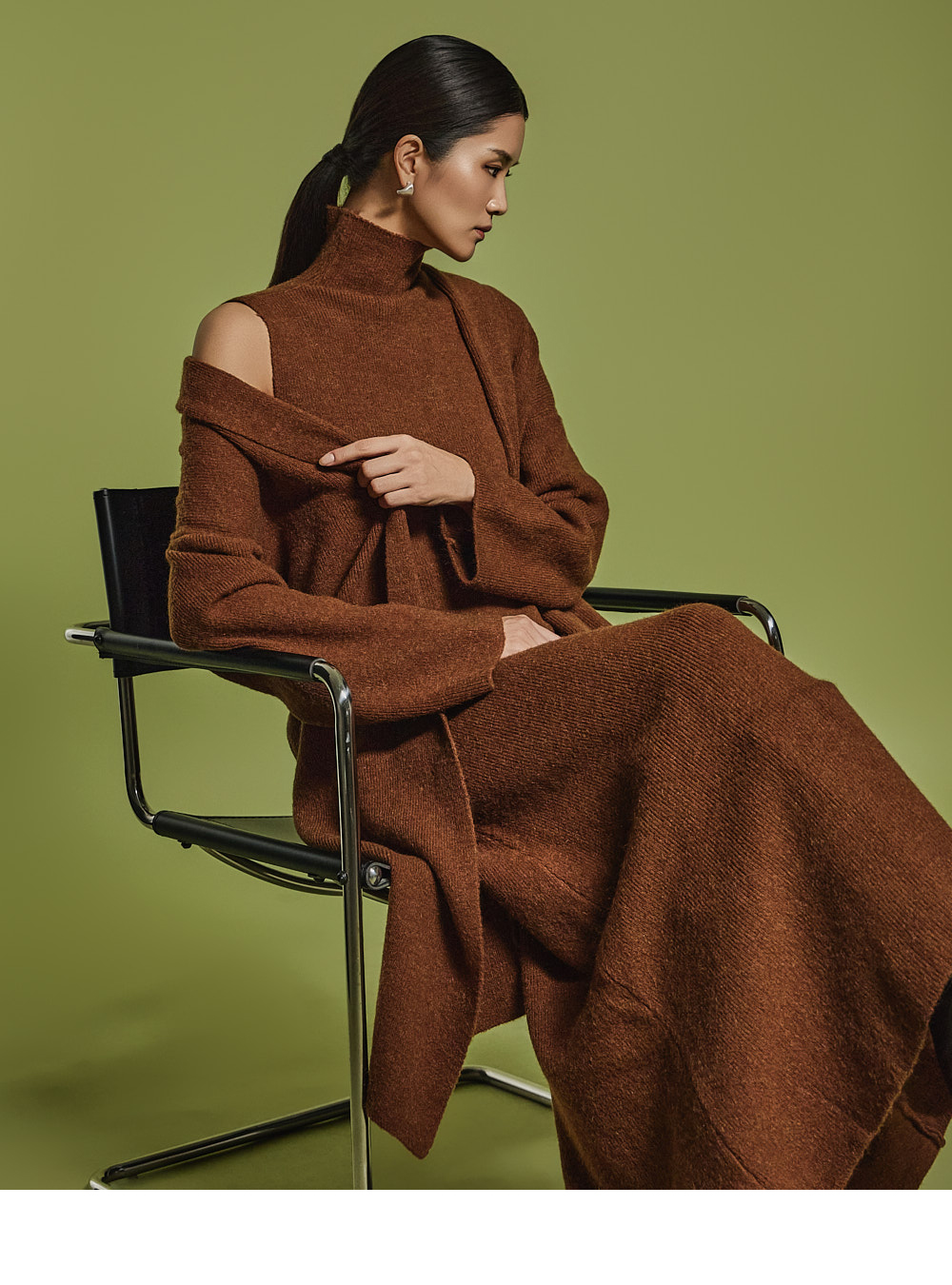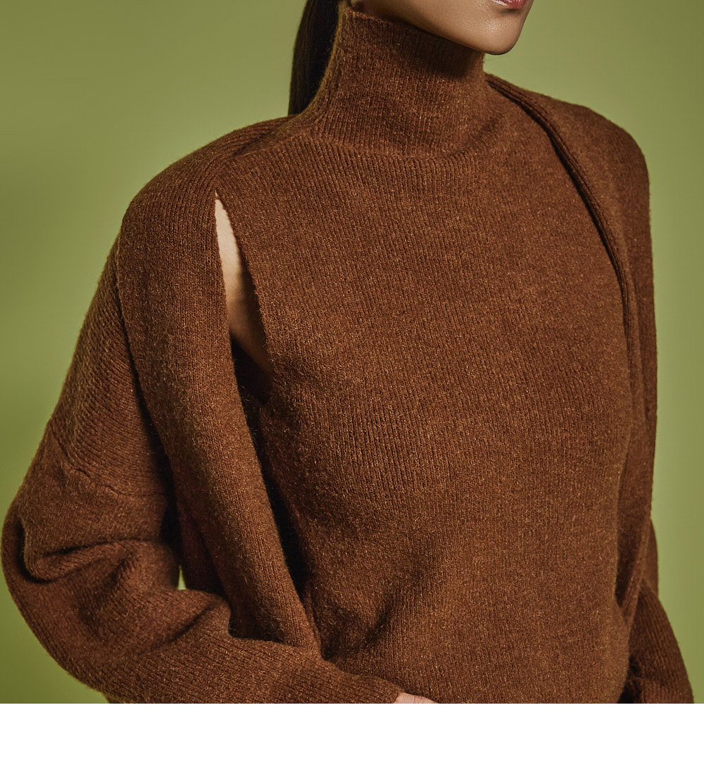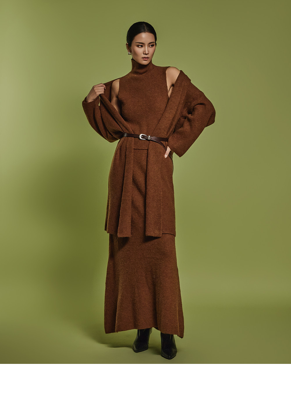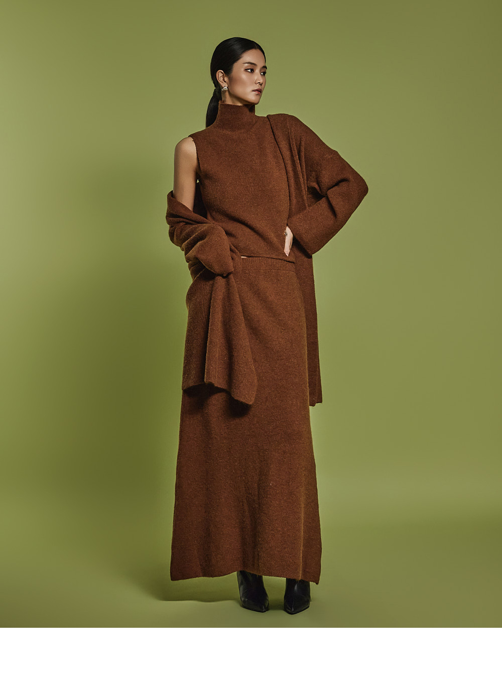 탑은 터틀넥 라인으로 세련된 넥라인을 돋보여드리며,
