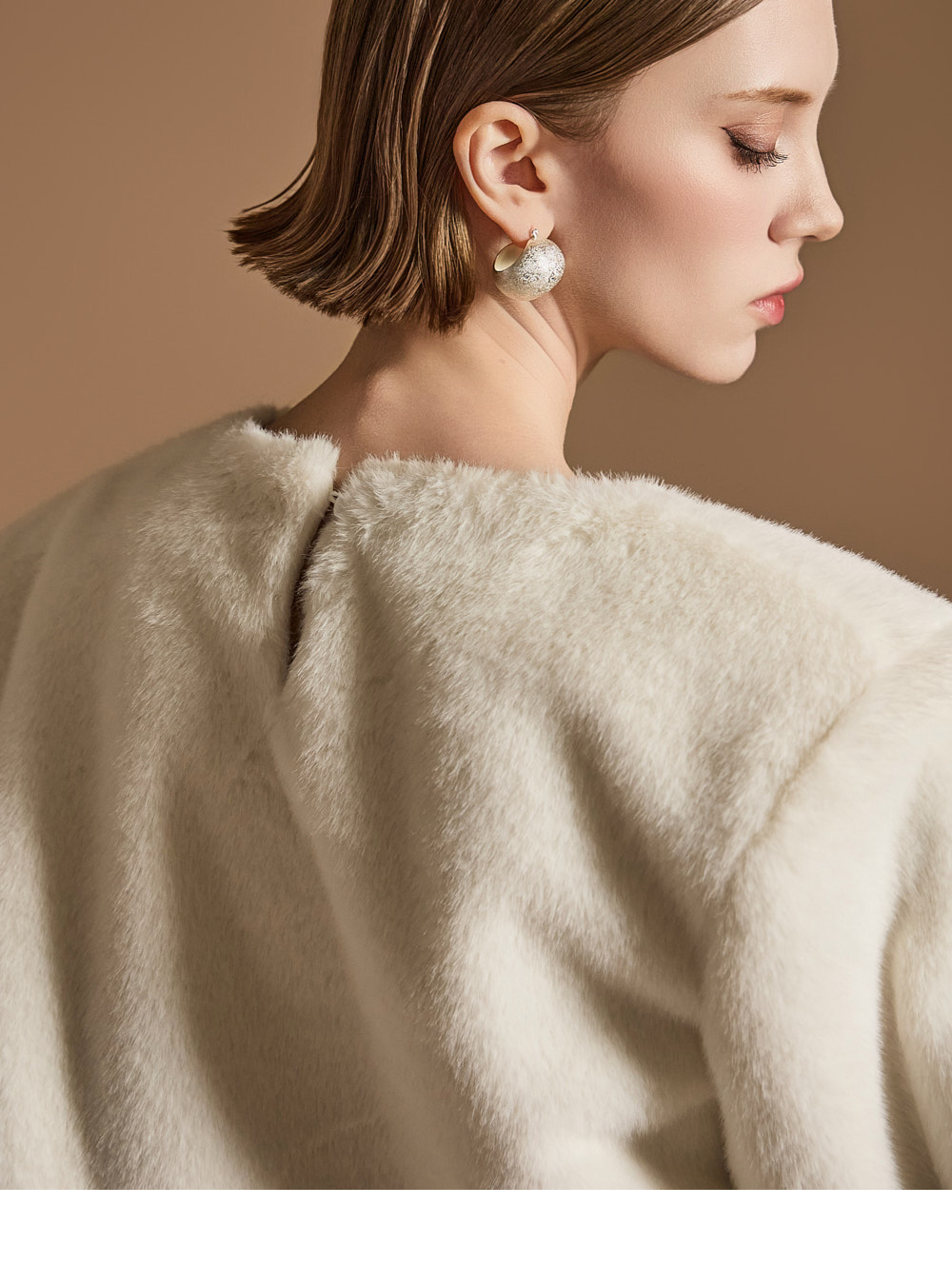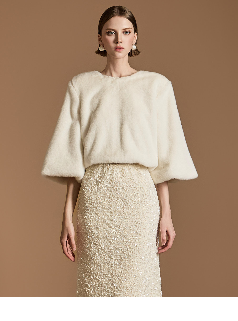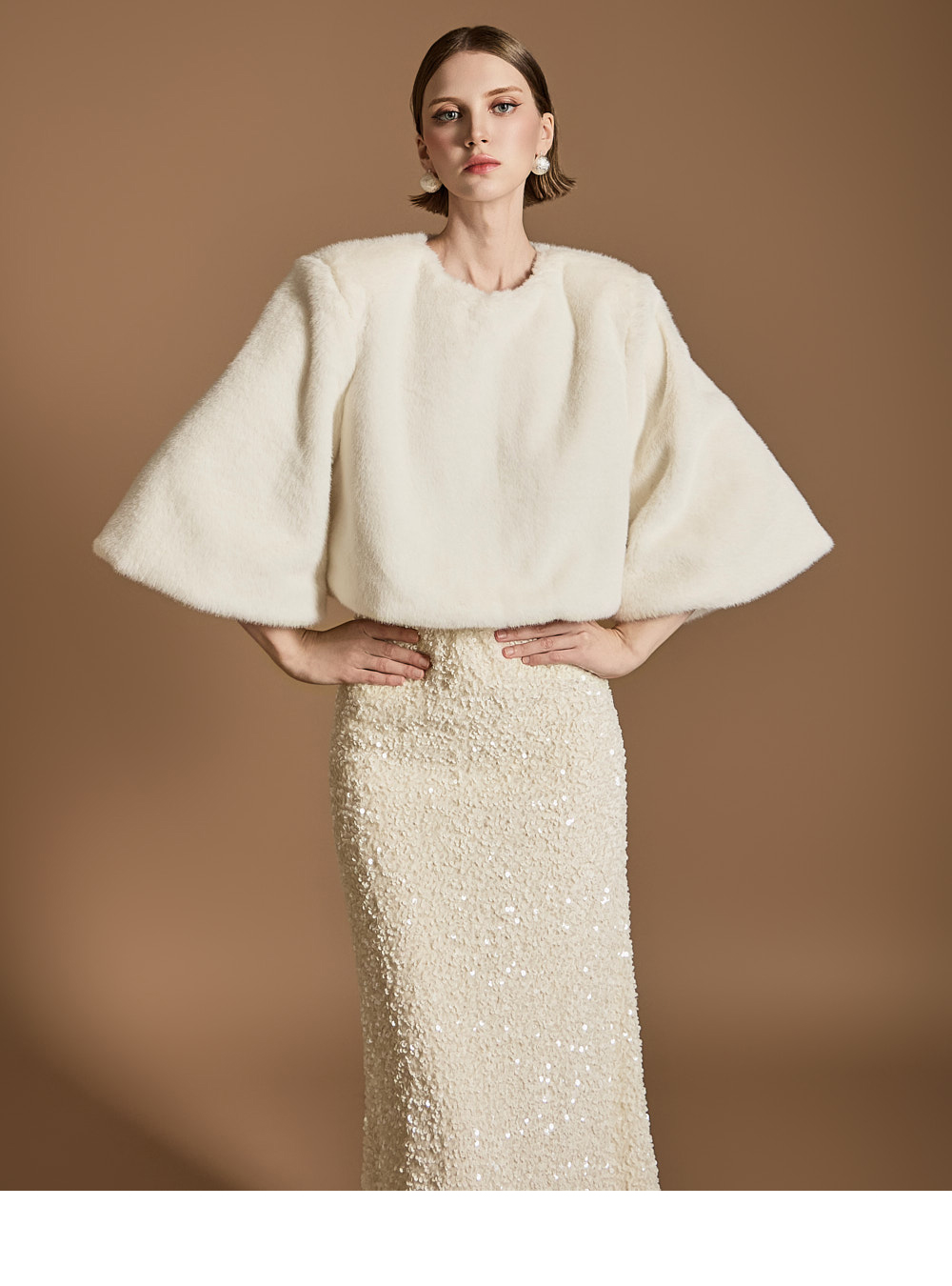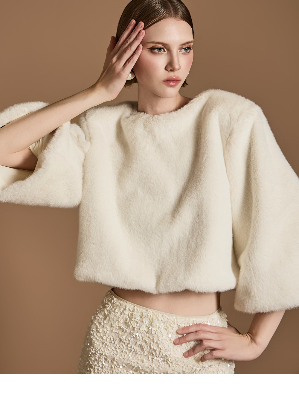 这是一款优雅的毛绒衬衫。采用柔软的聚酯纤维材质制作,ONE尺码设计,可根据体型舒适穿着。背部纽扣设计,方便穿脱,内部全衬里提供柔软的穿着感。适中的长度便于与多种下装搭配,肩部加入肩垫塑造轮廓,七分袖设计与宽松袖口增添优雅气质。柔软的毛绒面料与优雅剪裁,使这款单品充满年末氛围,推荐给DINT顾客。模特身高174CM,穿着ONE尺码,颜色为象牙白。