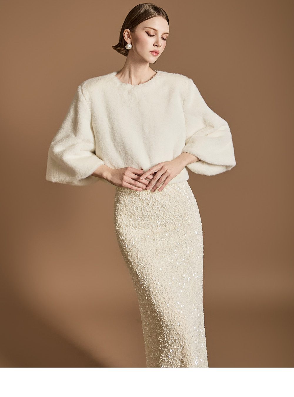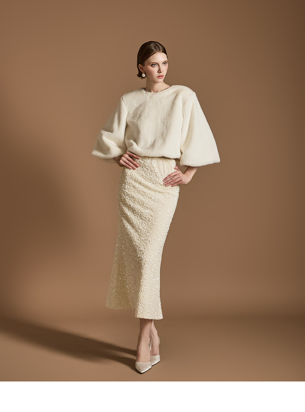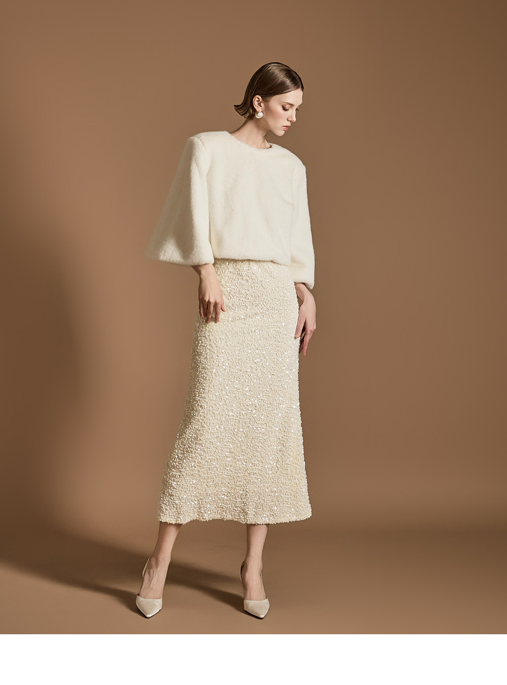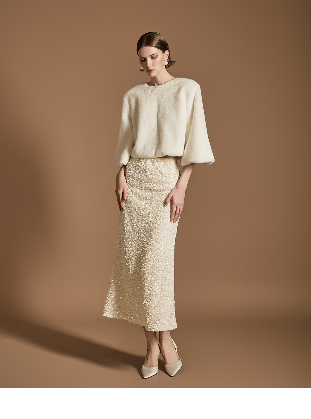 这是一款优雅的毛绒衬衫。采用柔软的聚酯纤维材质制作,ONE尺码设计,可根据体型舒适穿着。背部纽扣设计,方便穿脱,内部全衬里提供柔软的穿着感。适中的长度便于与多种下装搭配,肩部加入肩垫塑造轮廓,七分袖设计与宽松袖口增添优雅气质。柔软的毛绒面料与优雅剪裁,使这款单品充满年末氛围,推荐给DINT顾客。模特身高174CM,穿着ONE尺码,颜色为象牙白。