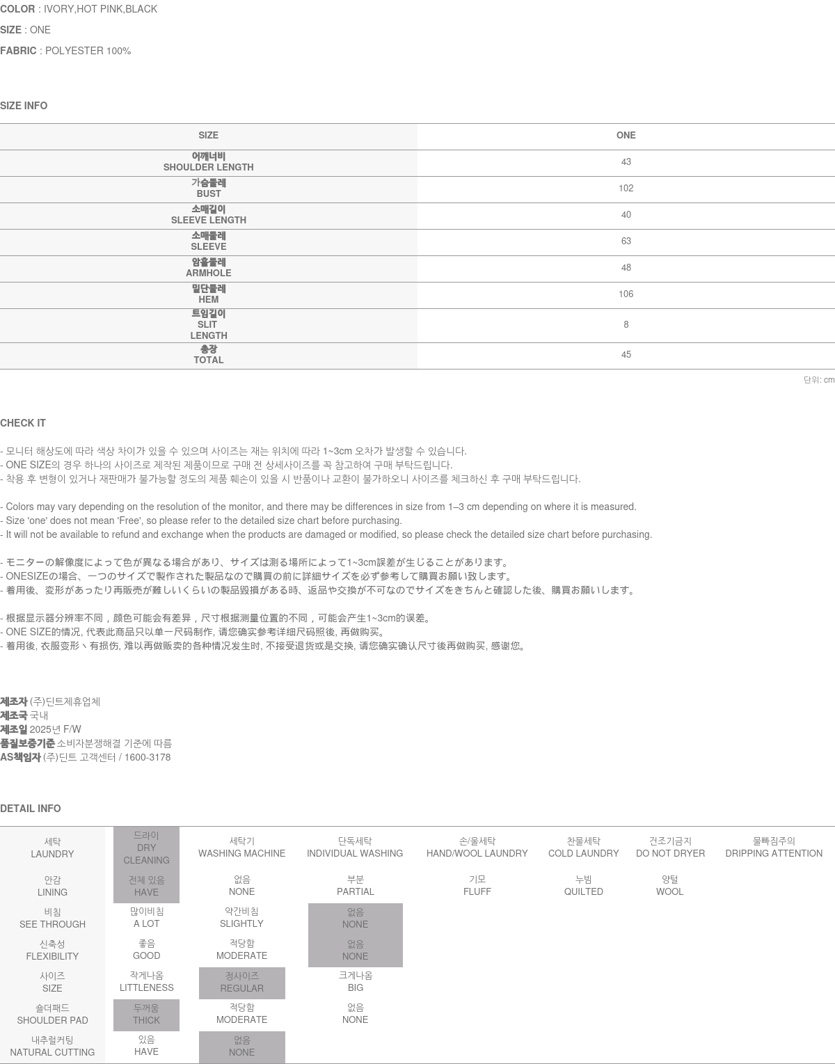 換貨 與 退貨 收到商品後, 7日內能在我的頁面申請交換或退貨, 申請後請將商品寄回DINT. 申請後, 請填寫包裹裡一同寄去的撤回申請書, 再將包裹包裝成一開始您收到時的狀態(包裝袋、衣架、贈品皆要一起寄送回來)發送至DINT即可. 因爲顧客變心所申請的換貨與退貨, 運費將由顧客負擔;誤送或是商品瑕疵的部分, 將由DINT負擔運費. 退貨住所爲:首爾市 衿川區 加山洞 459-8號 大韓通運 7樓 DINT股份有限公司 品質保證標準說明:符合電子商務等有關消費者保護法律規定的消費者可申請交換或是退貨.