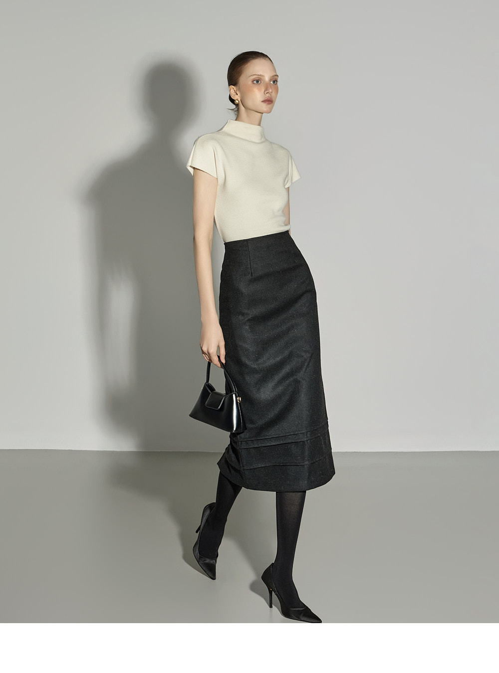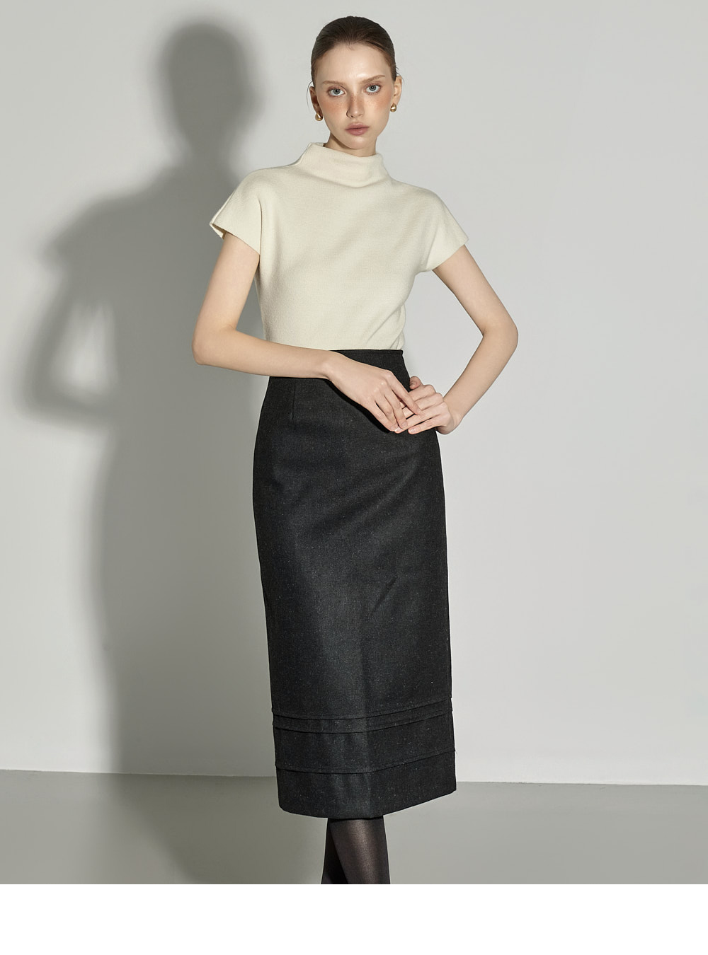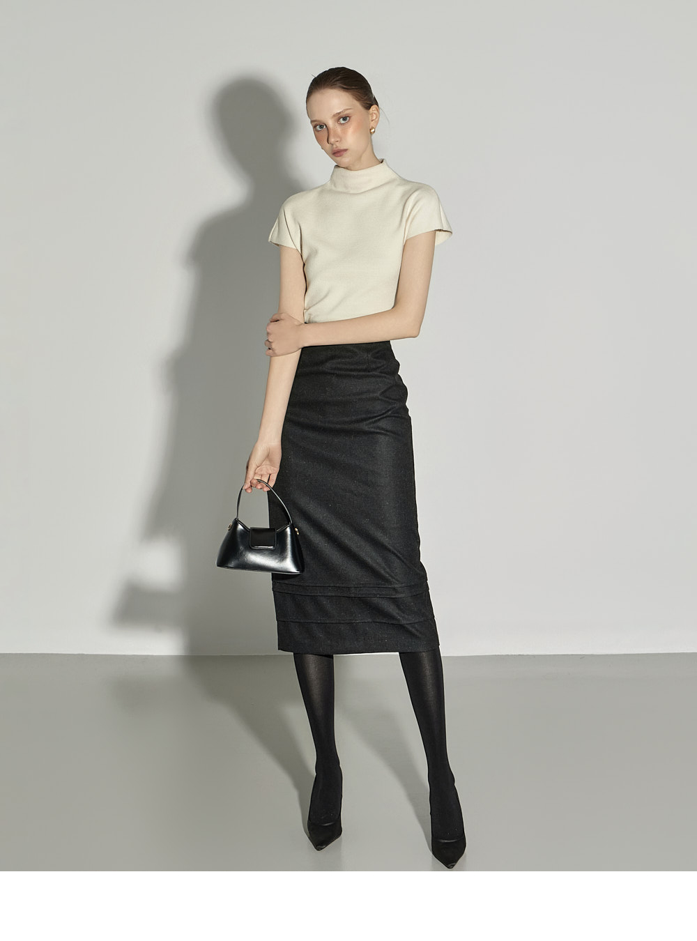 内搭半高领针织衫。