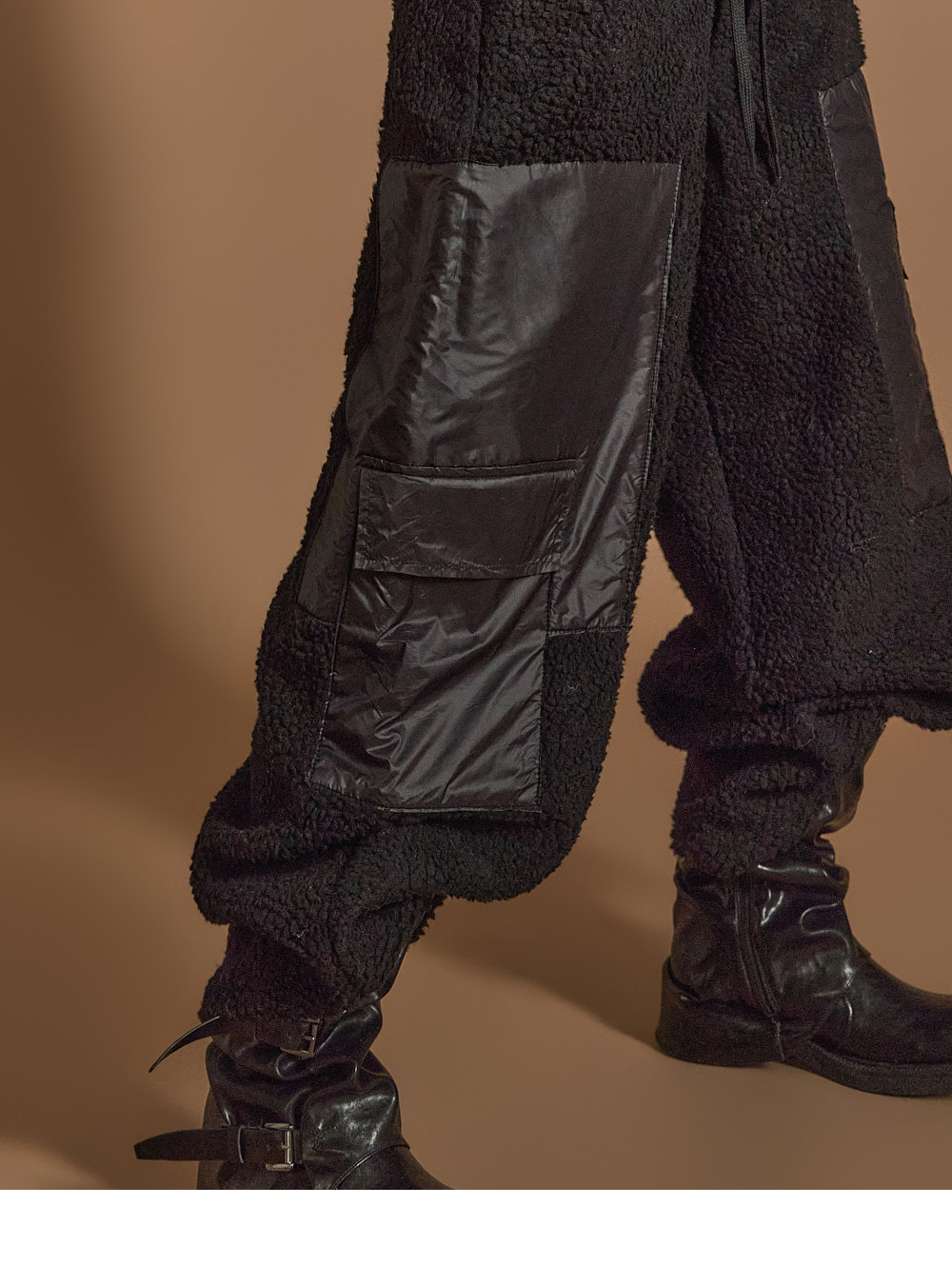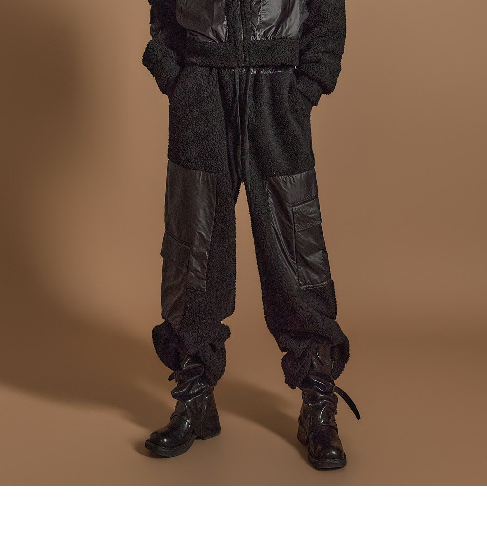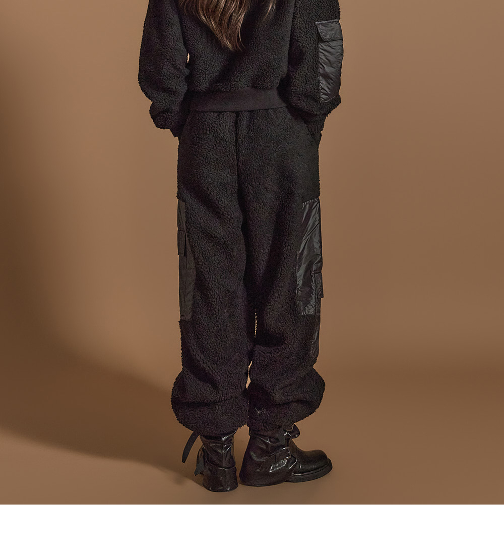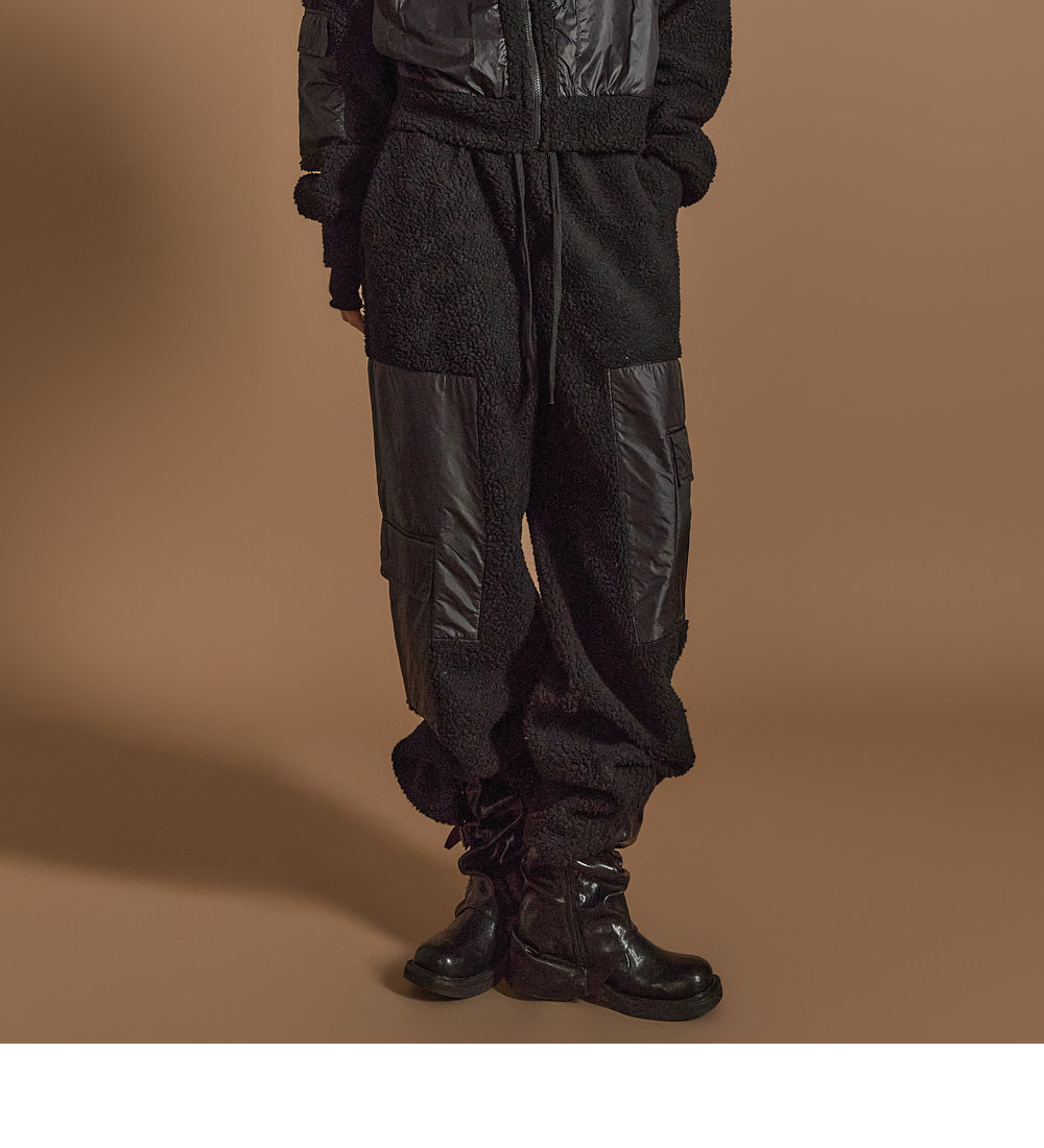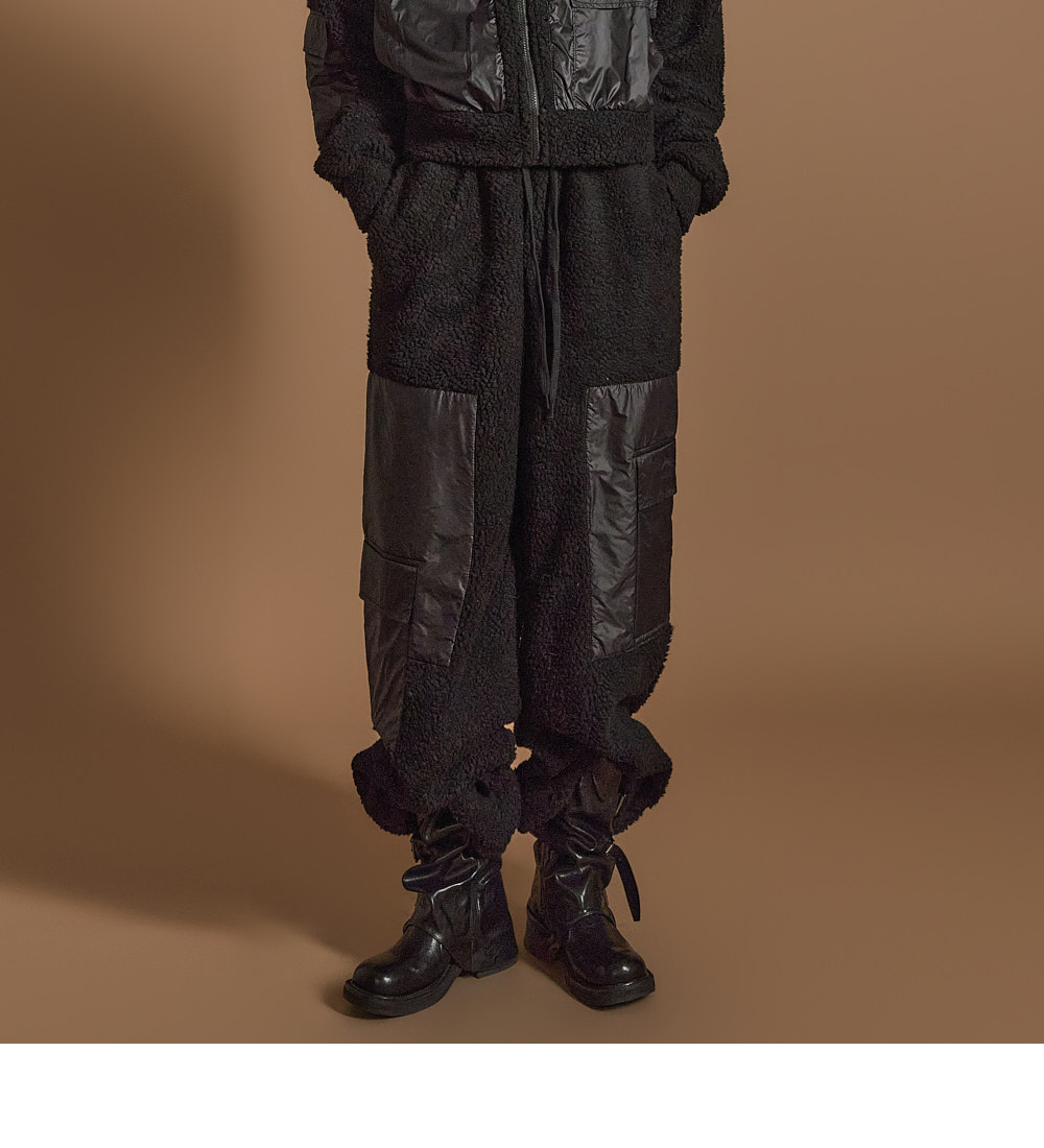采用毛圈布料营造应季氛围,尼龙拼接大口袋增添独特感,宽松版型便于修饰腿部线条。