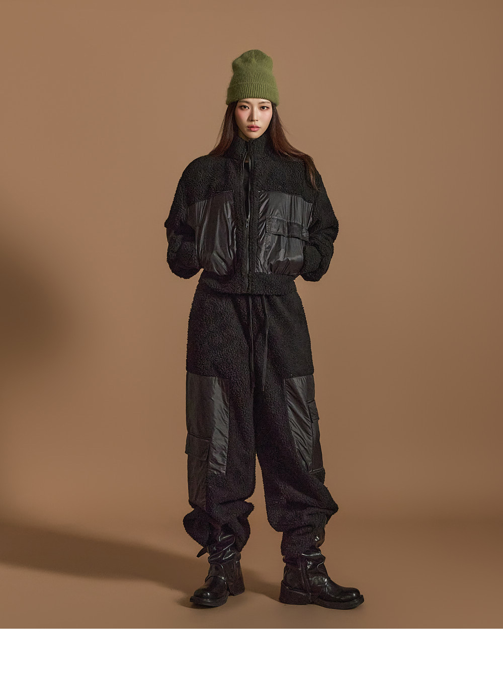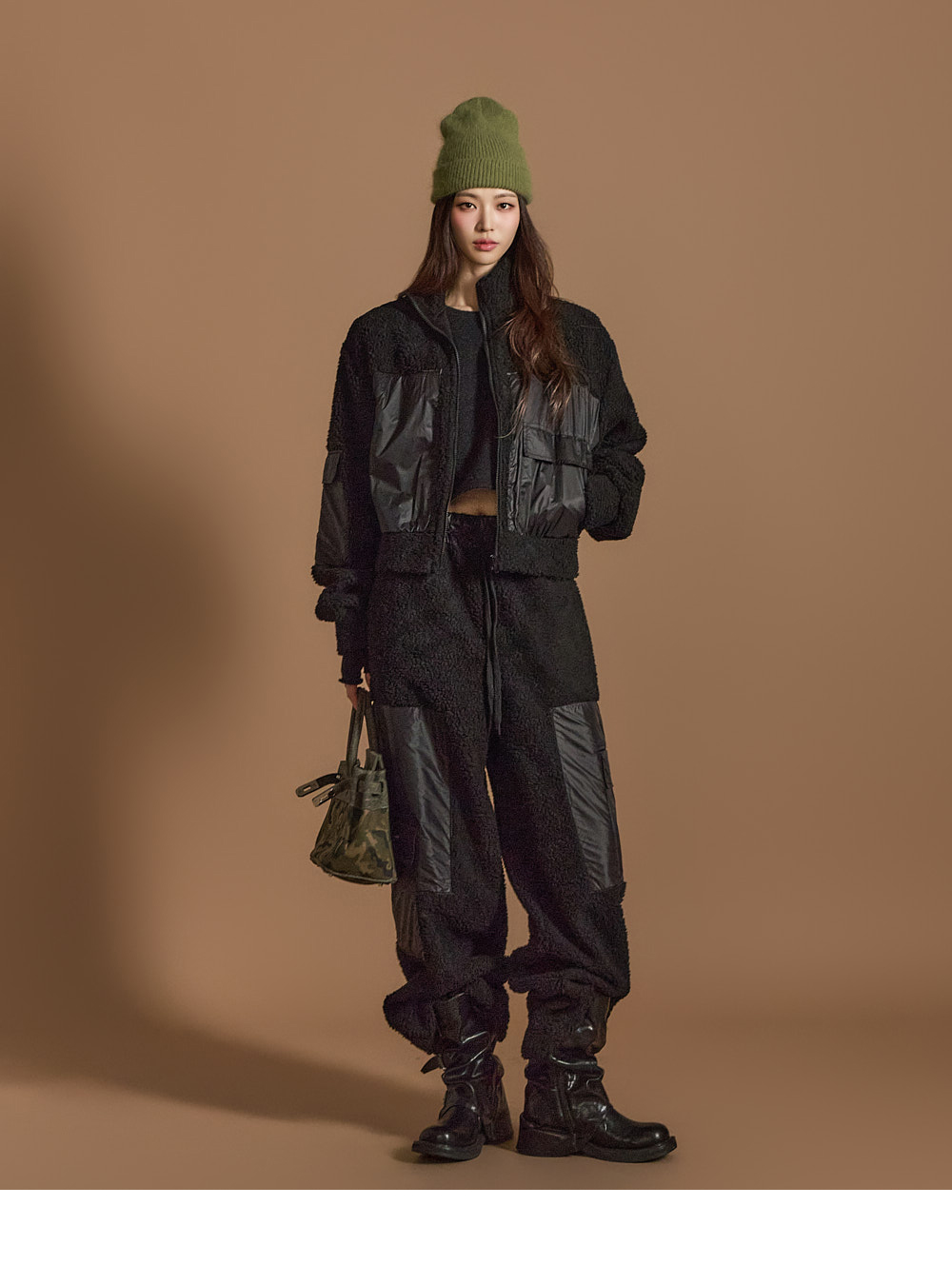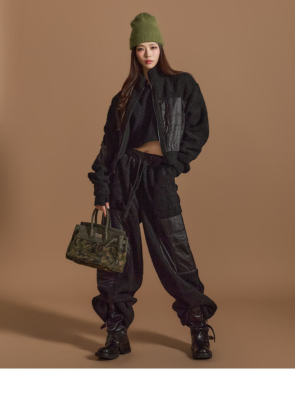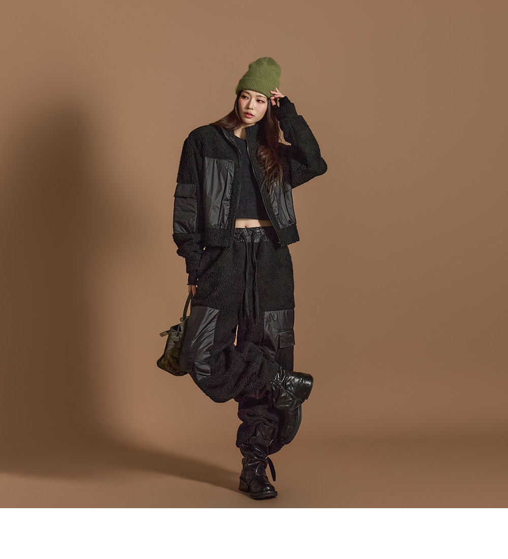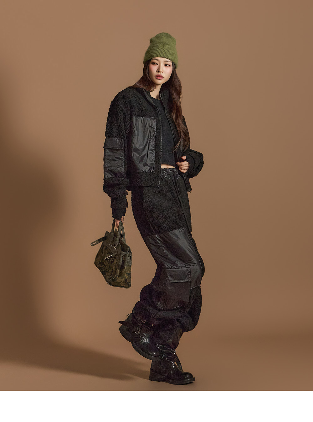 采用毛圈布料营造应季氛围,尼龙拼接大口袋增添独特感,宽松版型便于修饰腿部线条。