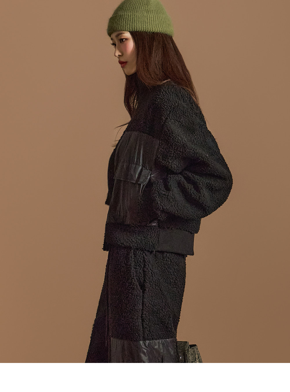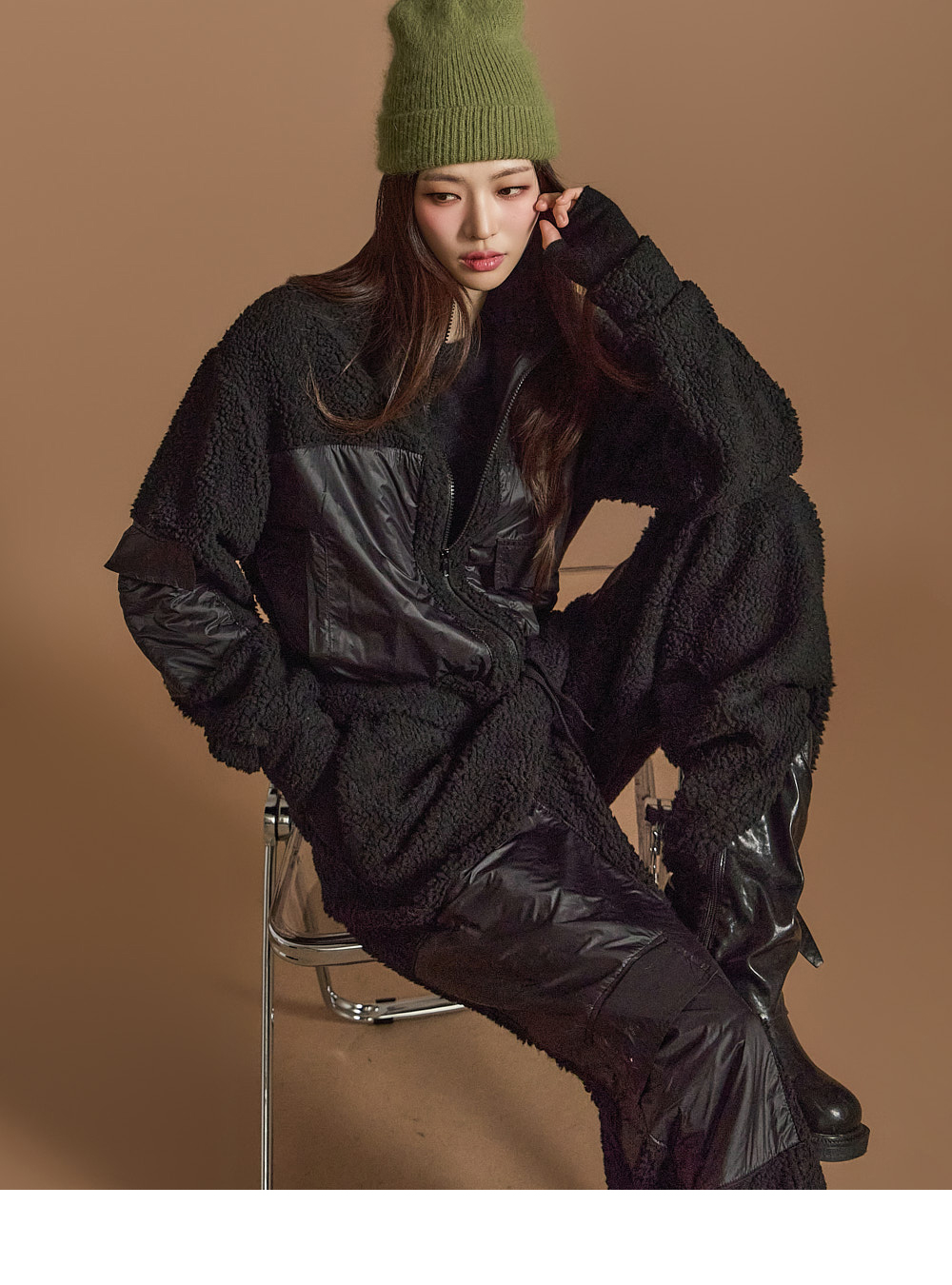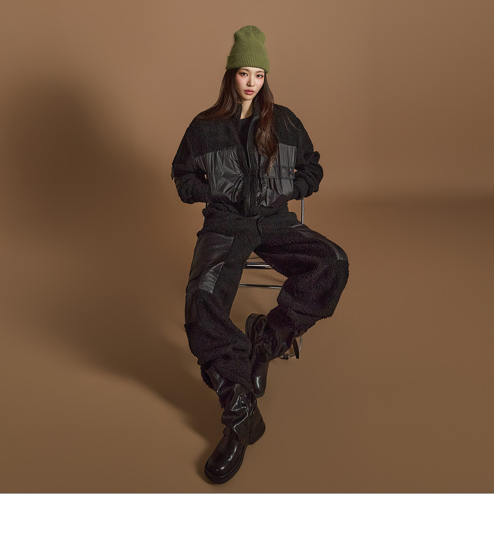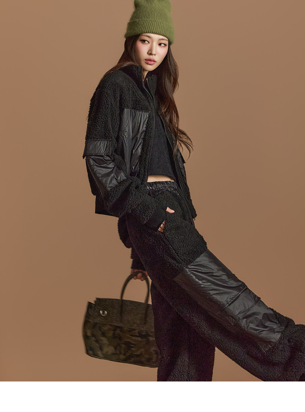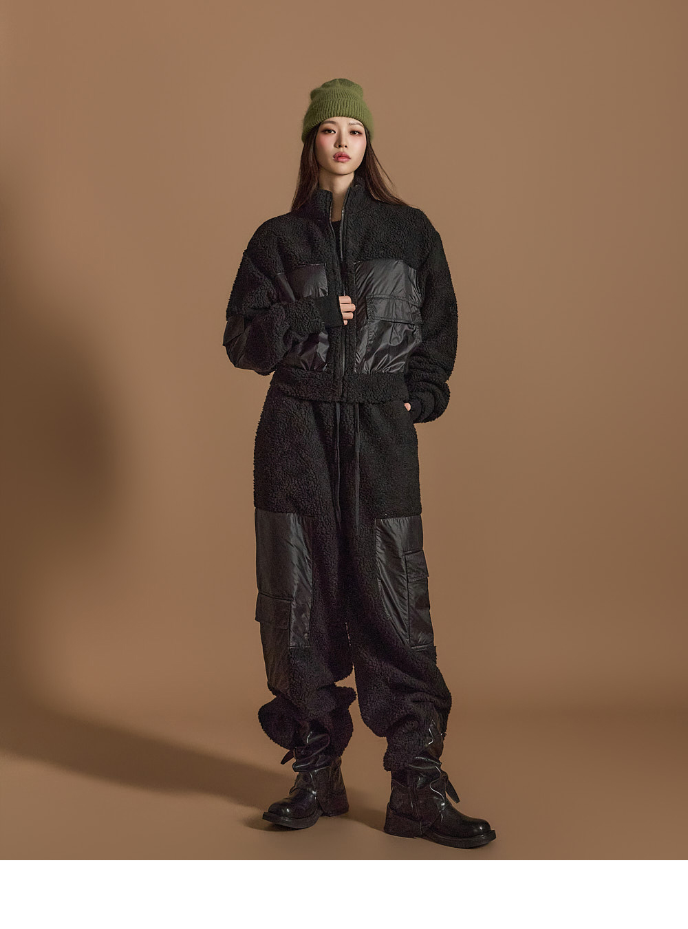 采用毛圈布料营造应季氛围,尼龙拼接大口袋增添独特感,宽松版型便于修饰腿部线条。