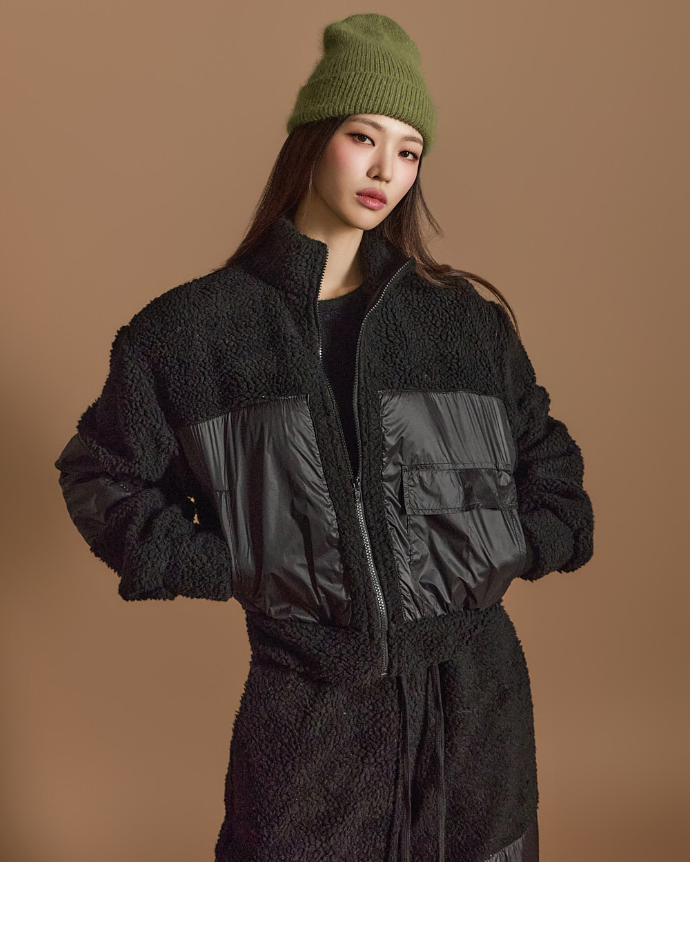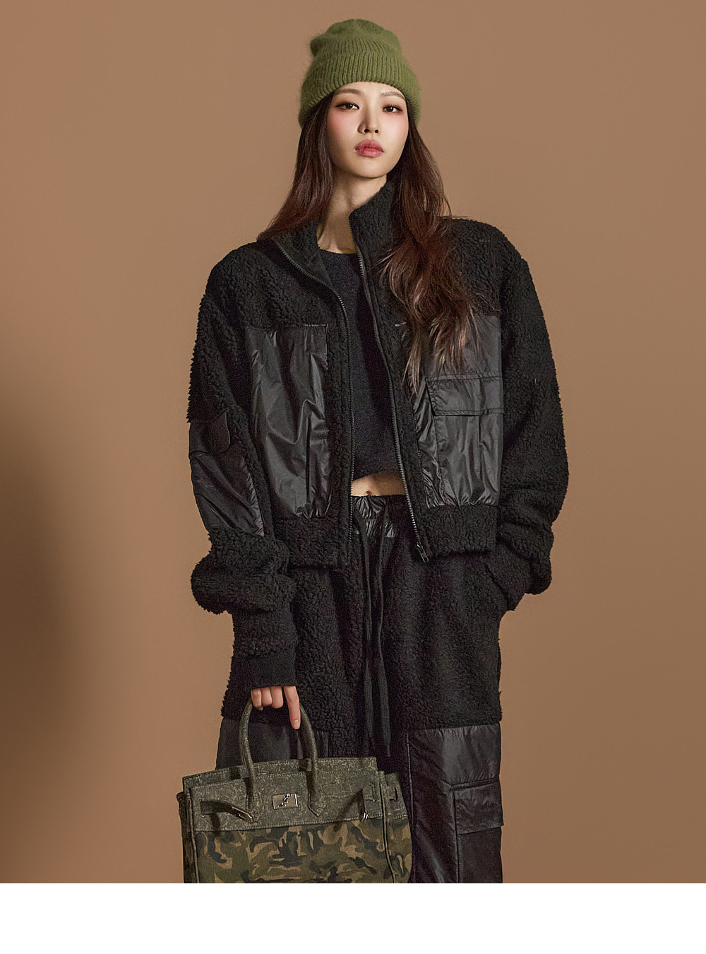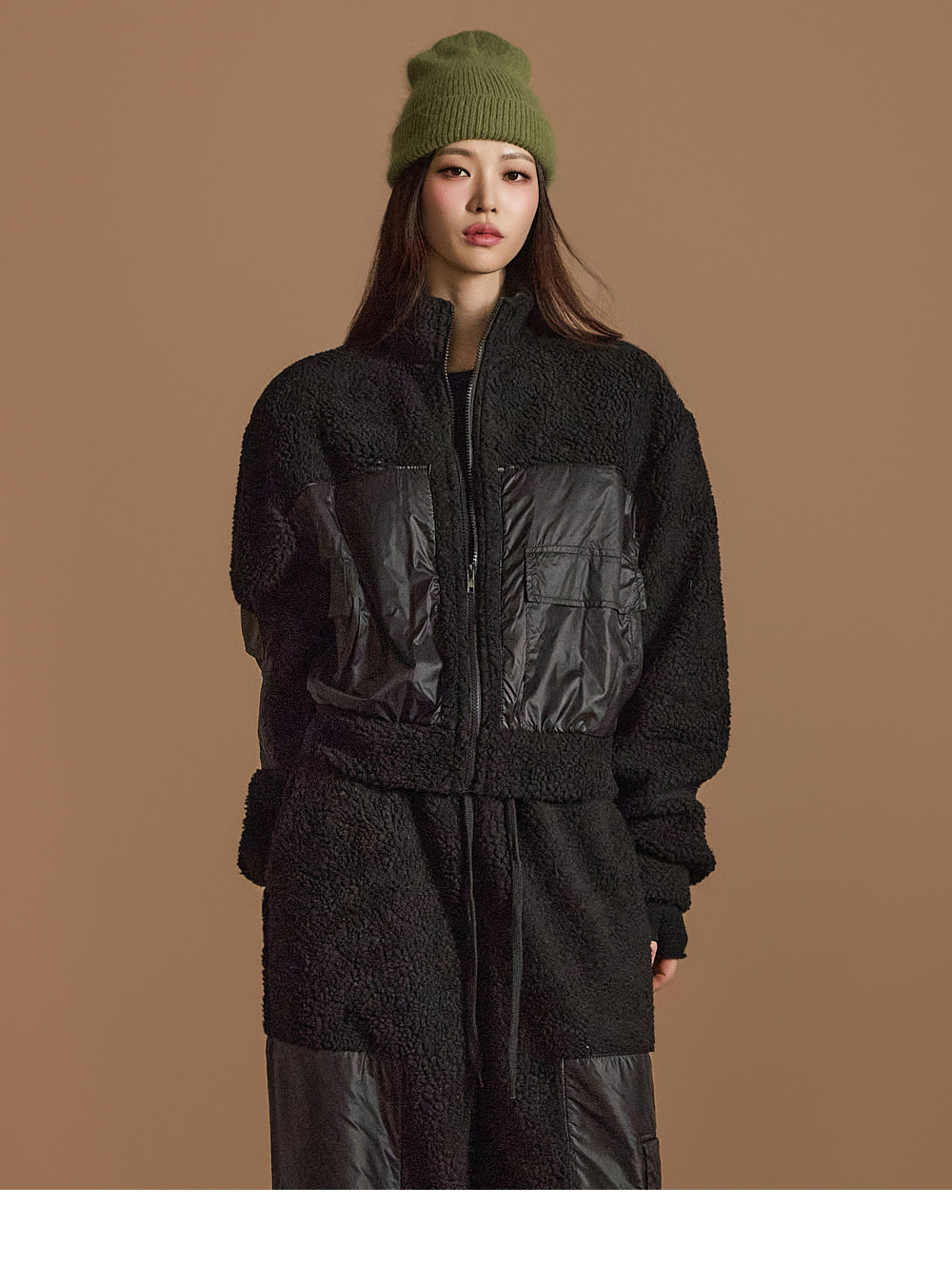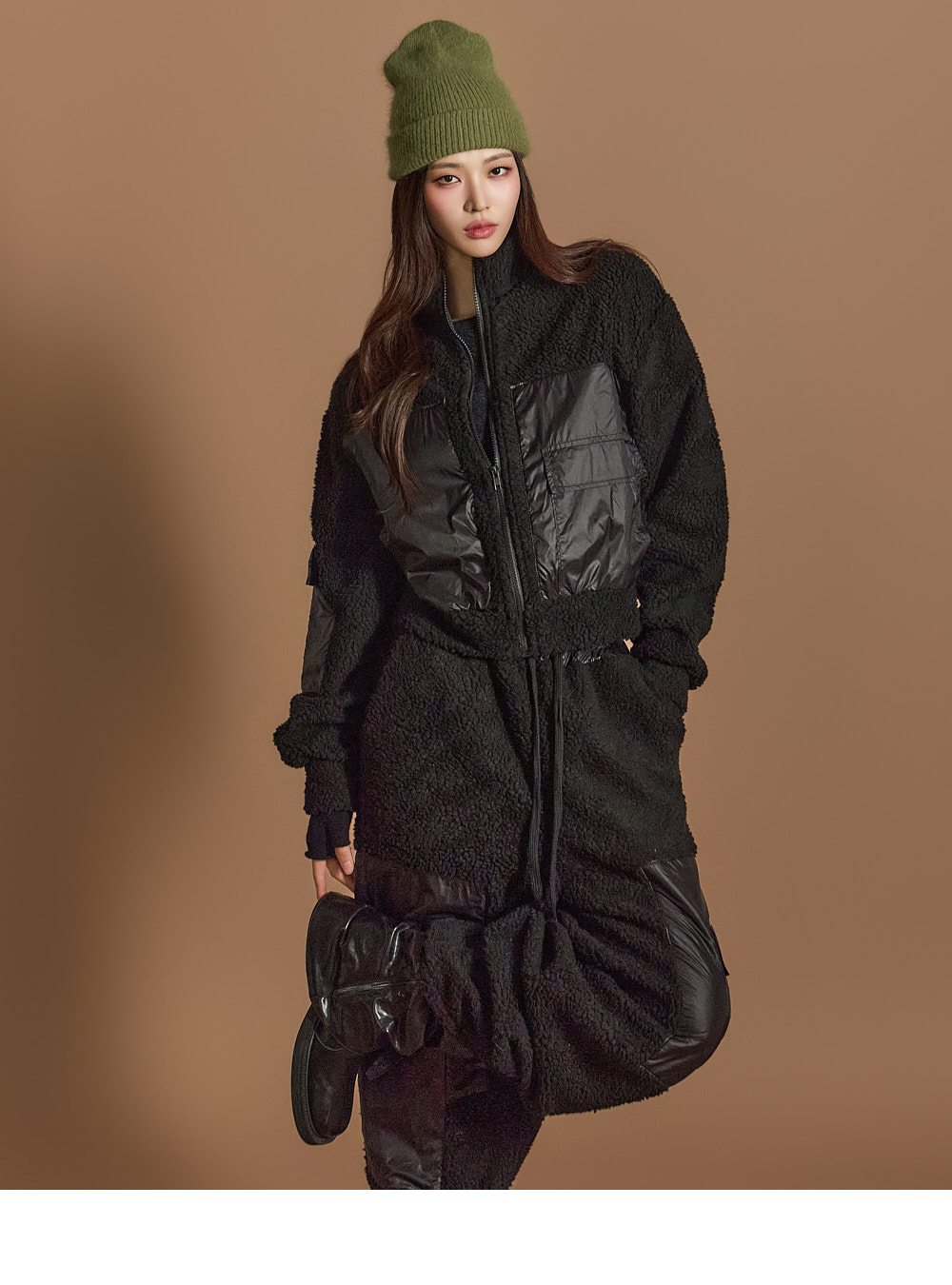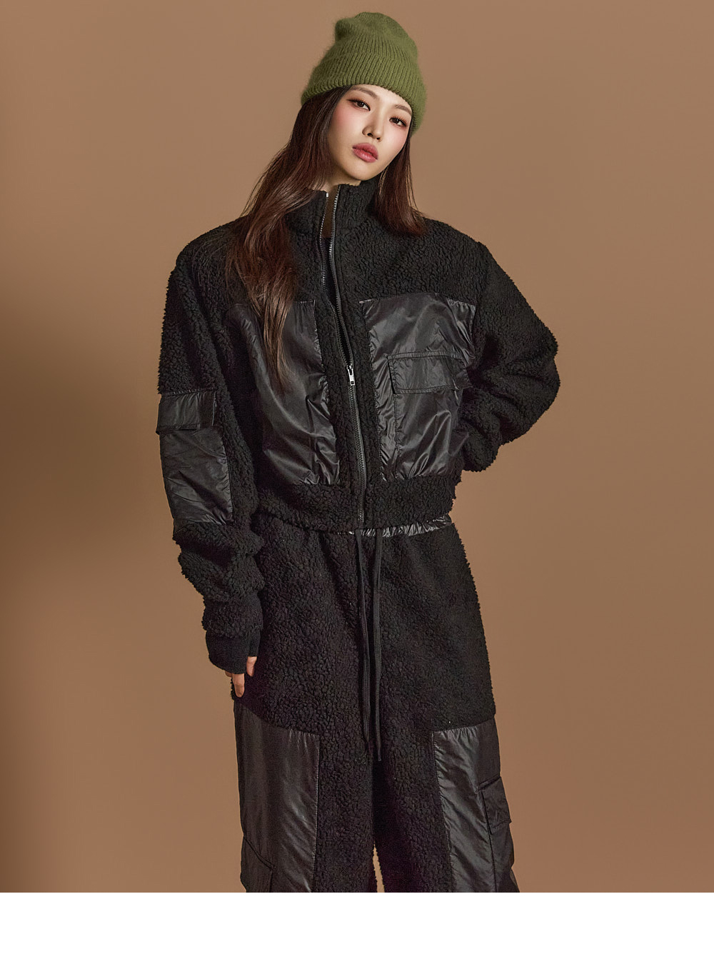 采用毛圈布料营造应季氛围,尼龙拼接大口袋增添独特感,宽松版型便于修饰腿部线条。