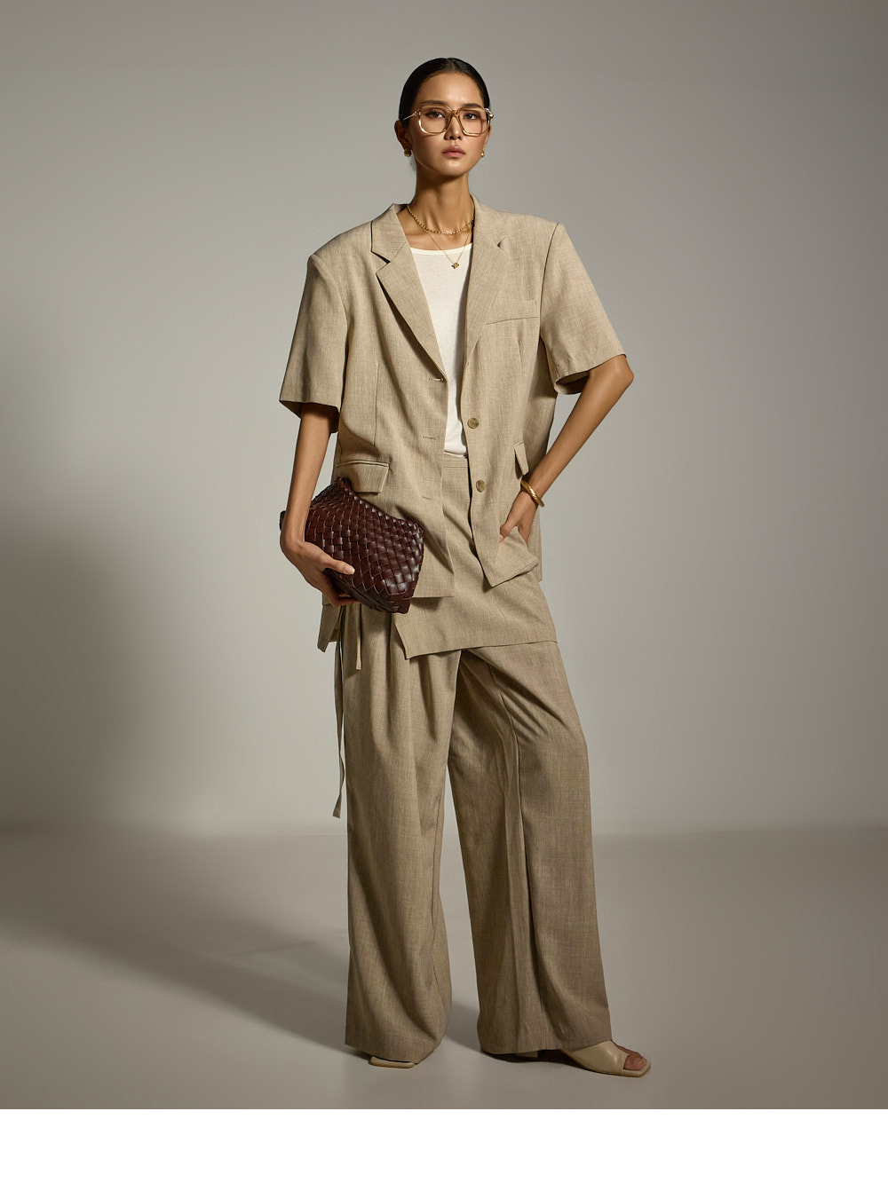 这是一款日常休闲风格的裹裙裤。 采用聚酯纤维与氨纶混纺面料,提供舒适的穿着感。 裤子外搭裹裙设计,打造自然且独特的叠穿轮廓。 腰部后侧松紧带配合前侧拉链和纽扣开合,兼顾活动便利与实用性。 是一款既休闲又富有设计感的单品。 模特身高171CM,试穿ONE尺码,颜色为米色(BEIGE)。