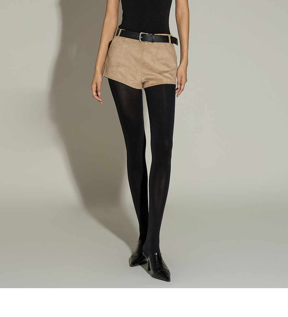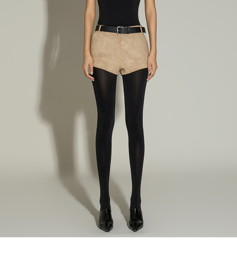 时尚风格的麂皮大衣与短裤套装。