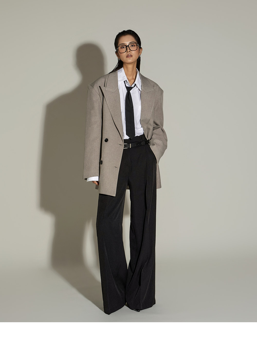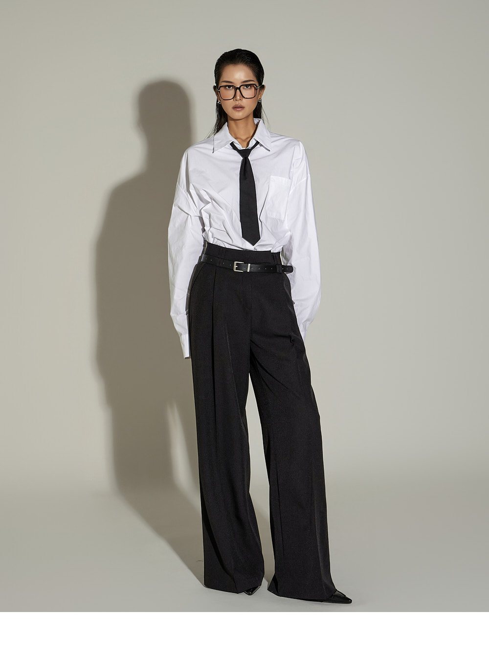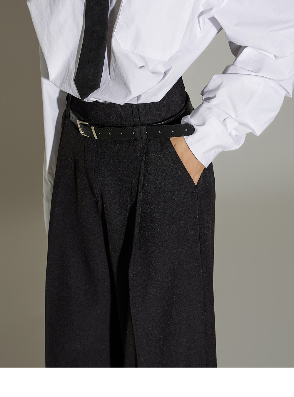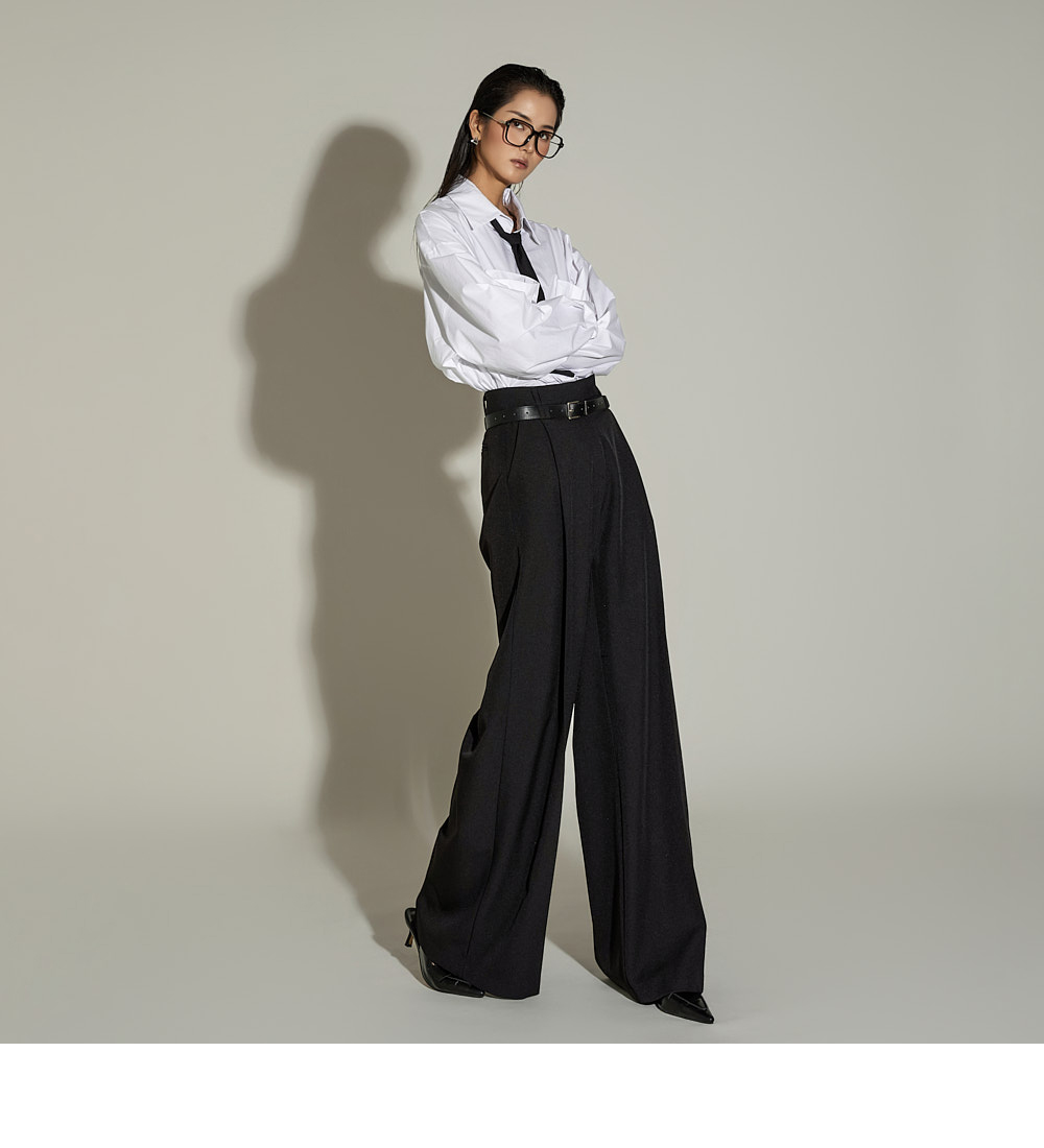 宽松裤型搭配前侧褶皱设计,