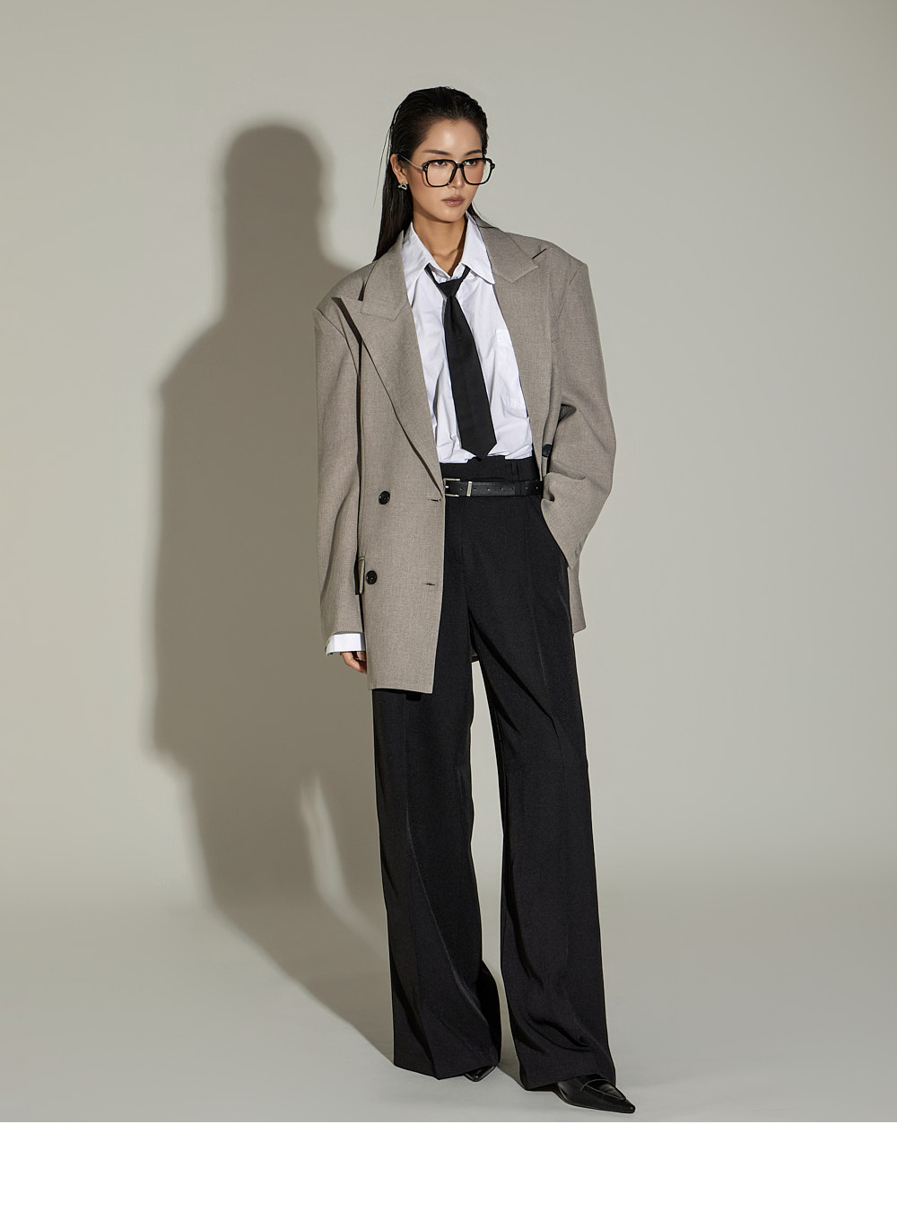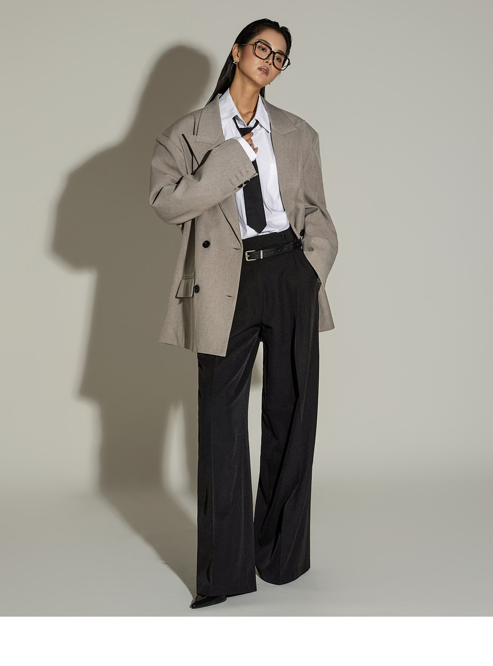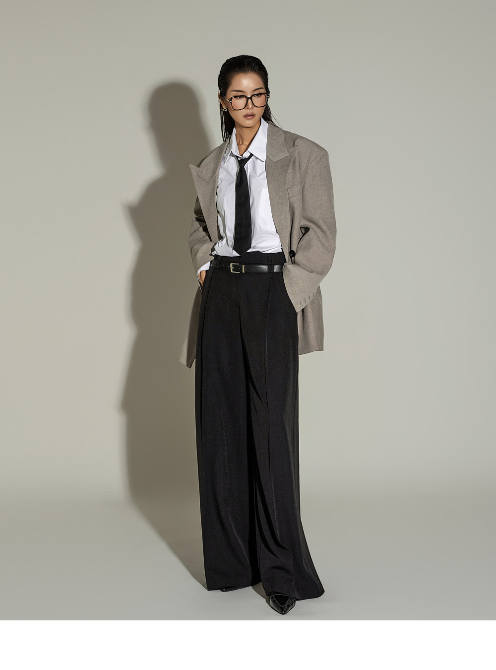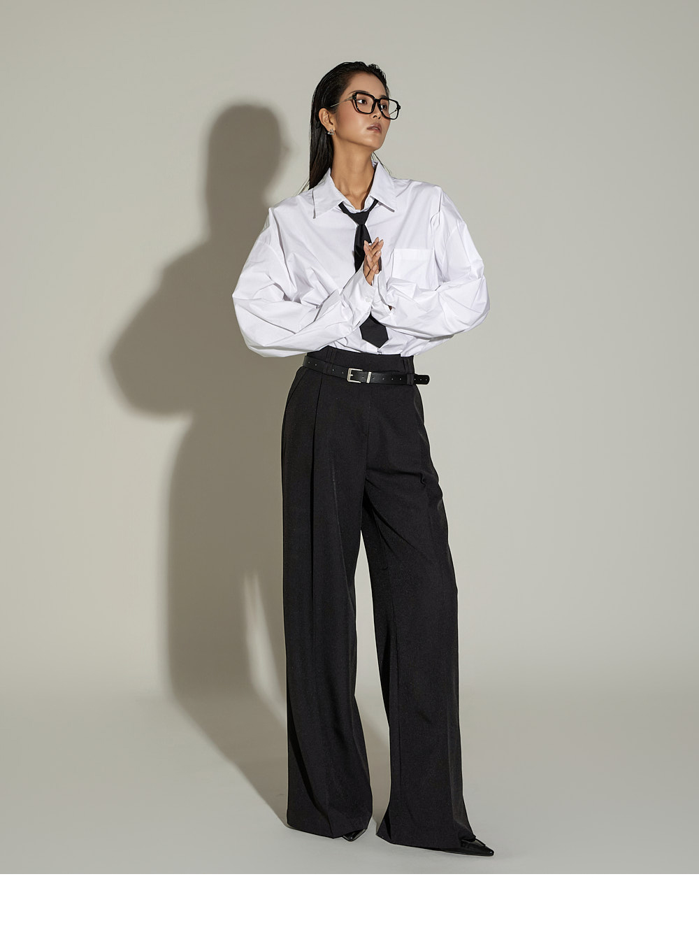 宽松裤型搭配前侧褶皱设计,