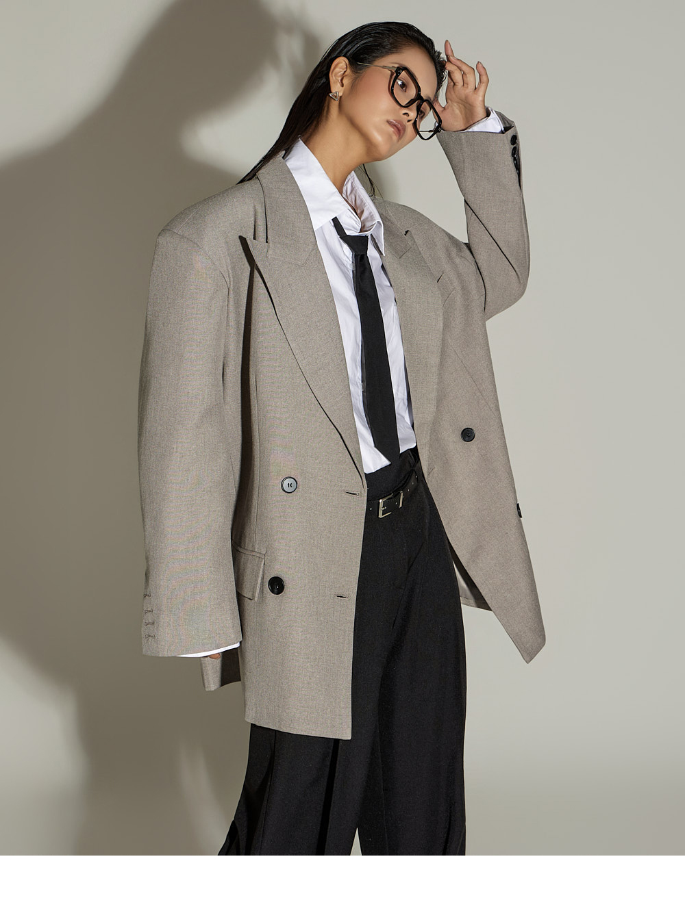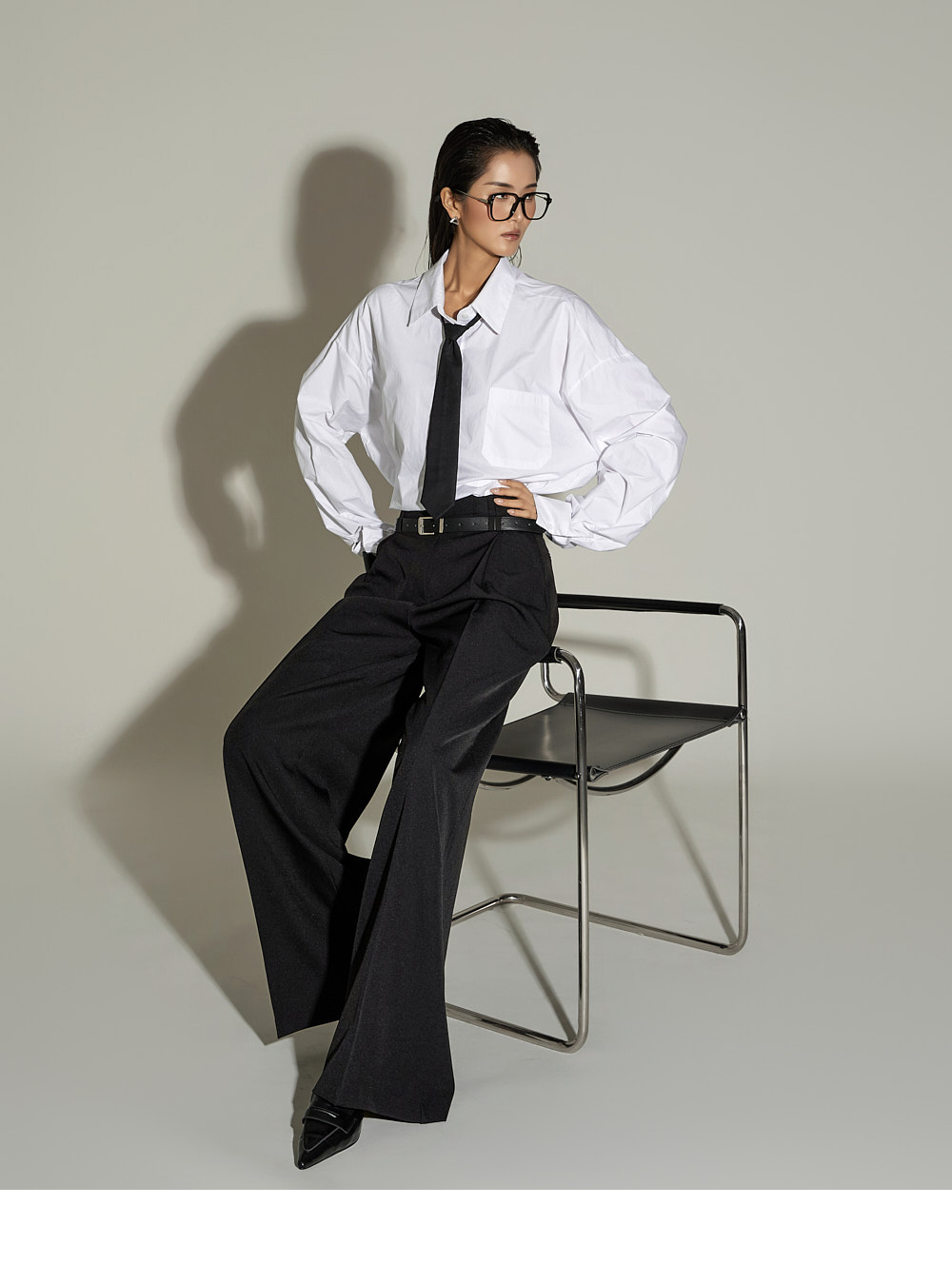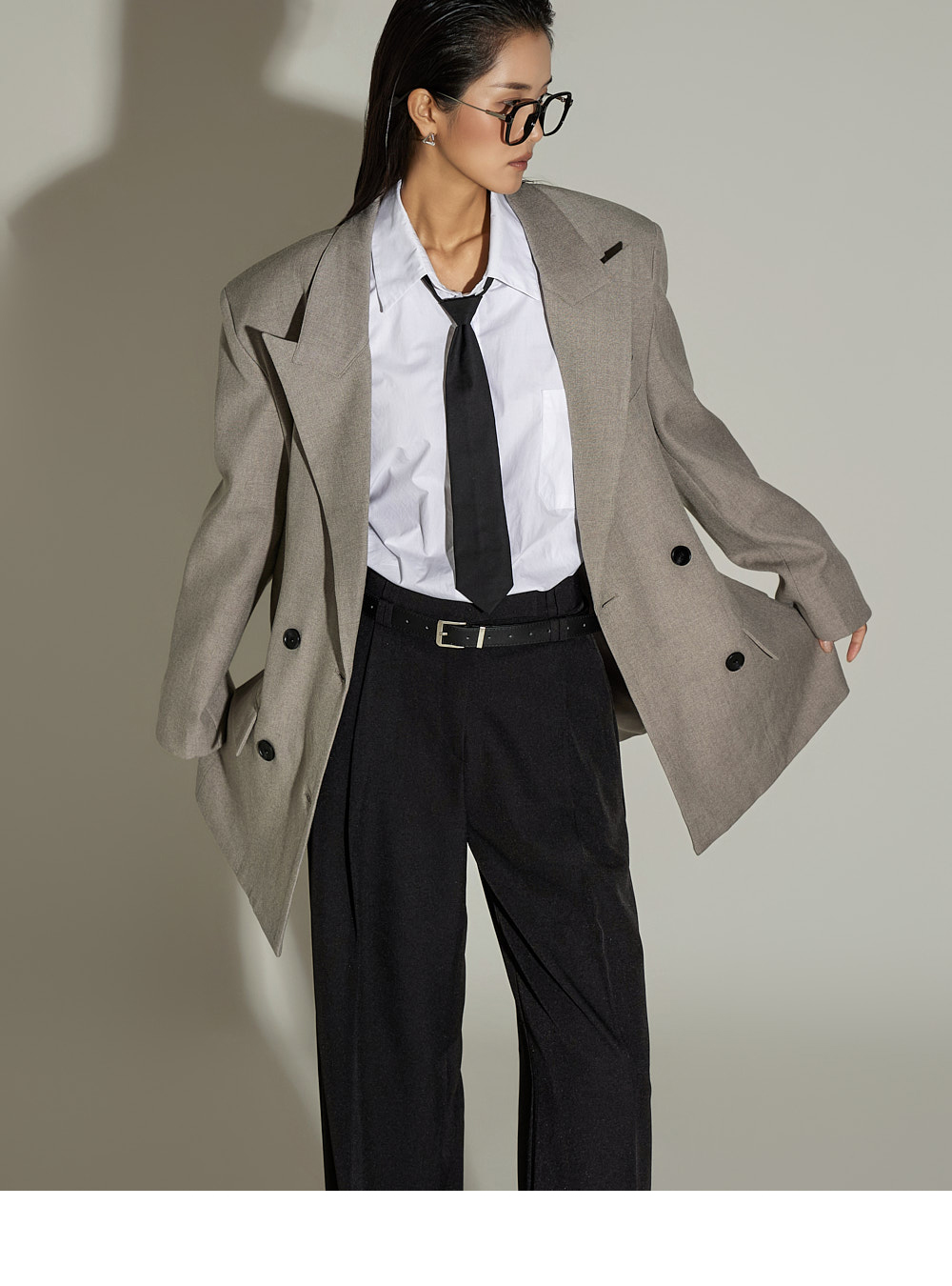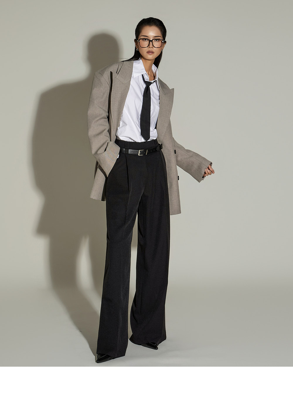 宽松裤型搭配前侧褶皱设计,