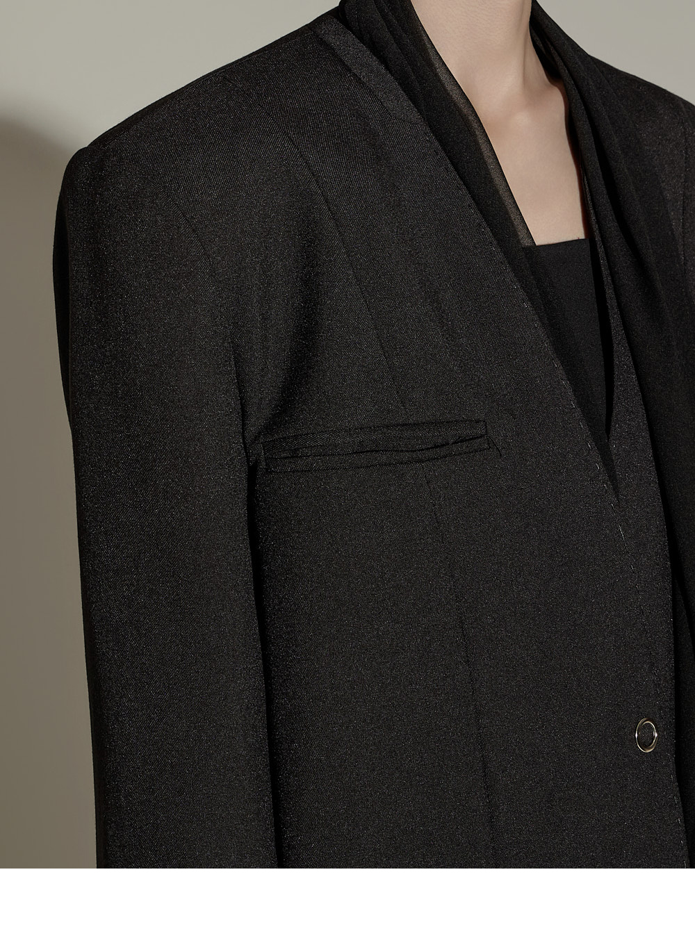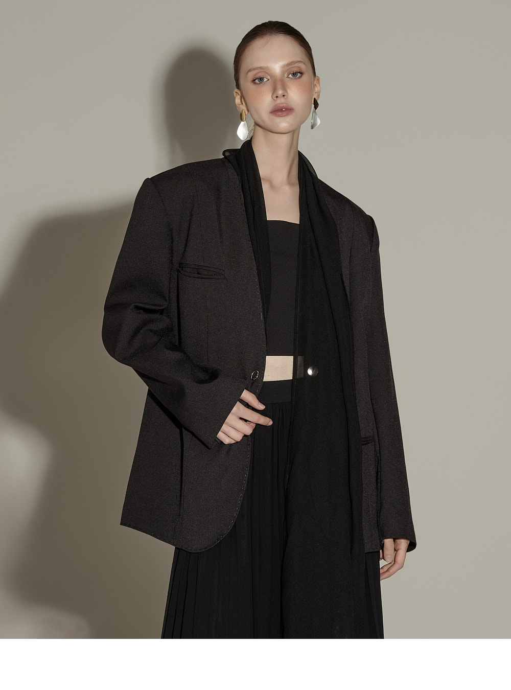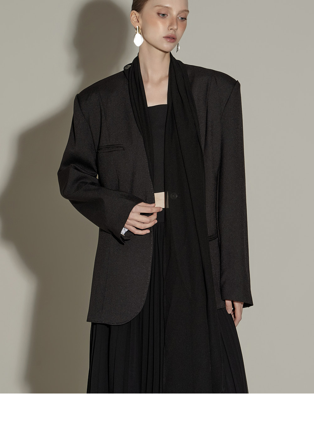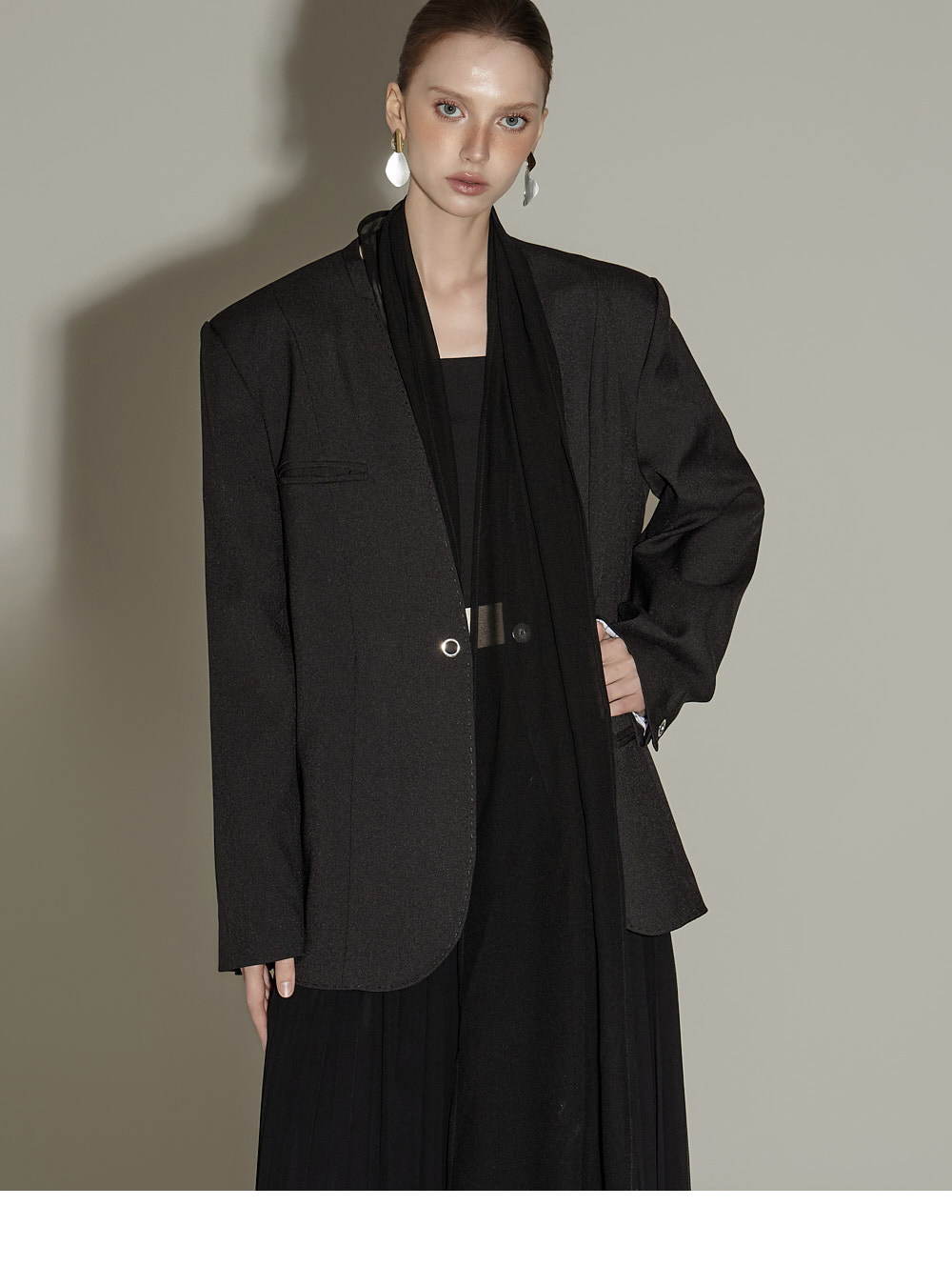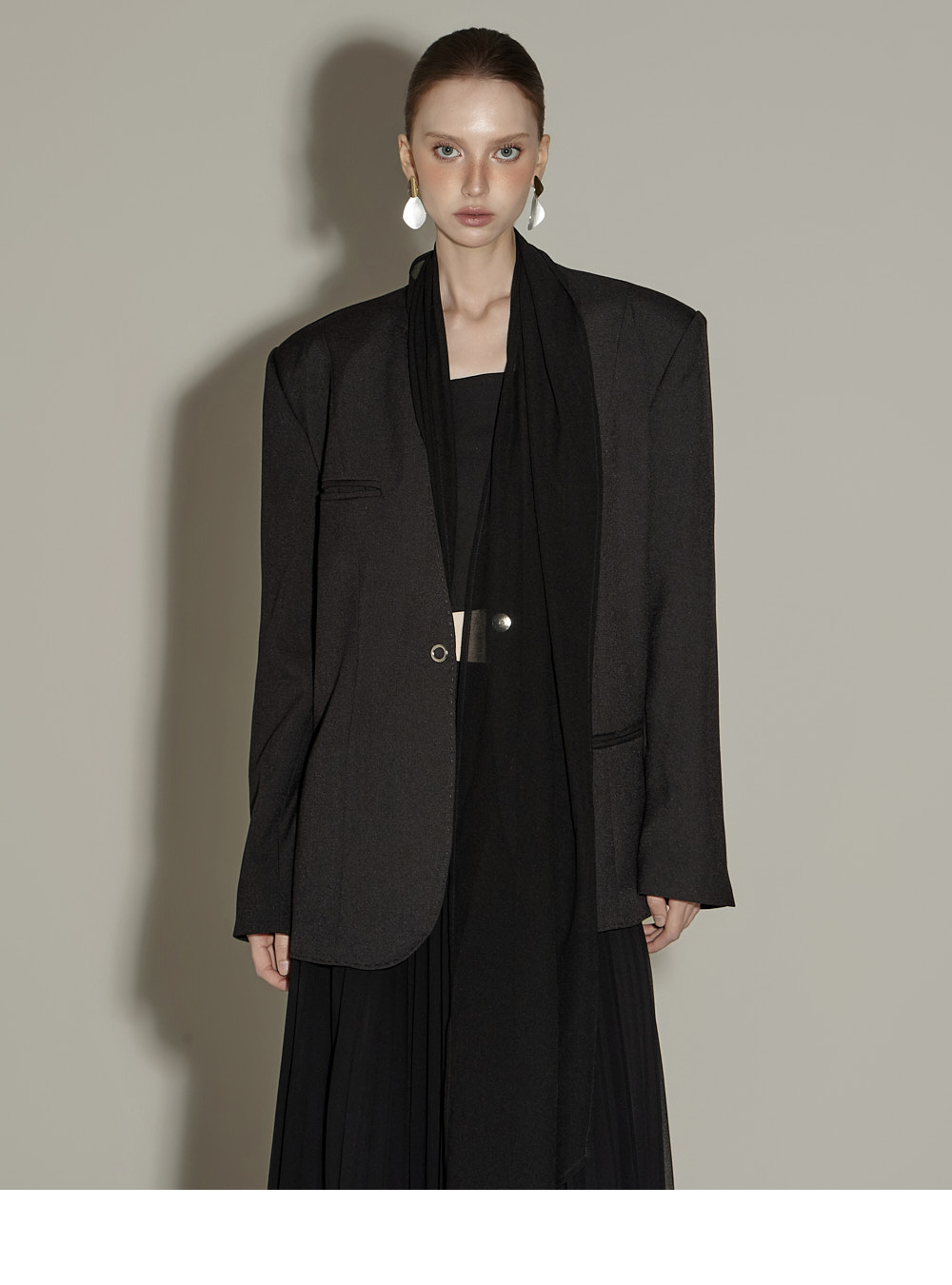 精致氛围的围巾设计肩垫西装外套。 采用聚酯纤维、人造丝与腈纶混纺面料,质感挺括且富有弹性,穿着舒适。 可拆卸透视围巾设计,提供多样化造型搭配,袖口按扣及前襟按扣开合,既方便又保持利落的版型。 整体条纹内衬增添设计亮点,细节处体现用心,适度肩垫与前置双口袋,兼具实用性与整体完成度。 可单穿,亦可与连衣裙或西装裤搭配,打造多样日常造型。 模特身高174CM,穿着ONE码,黑色款。