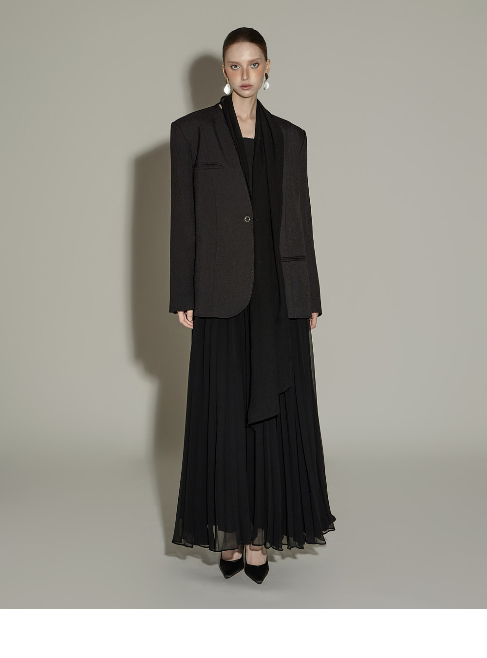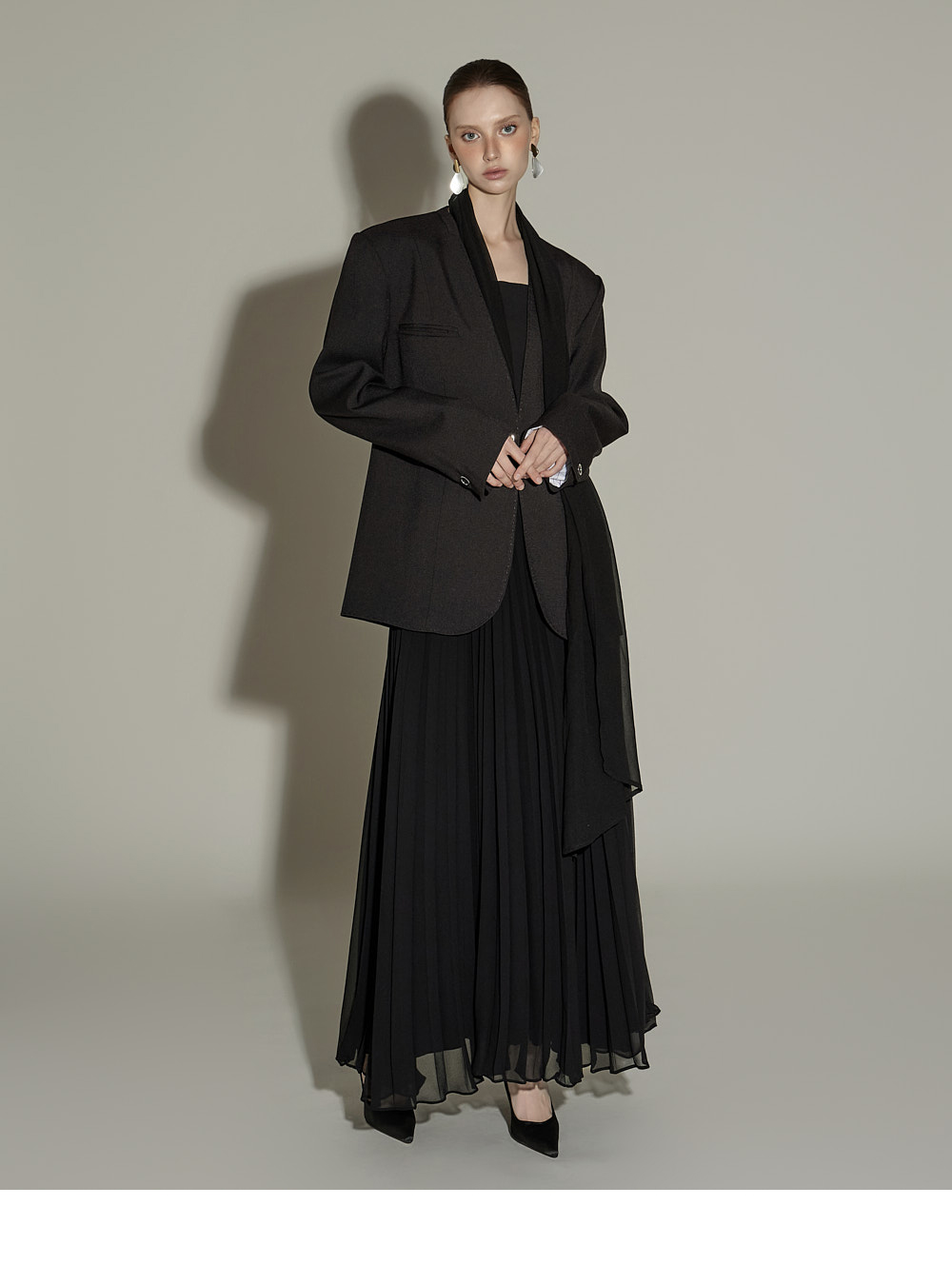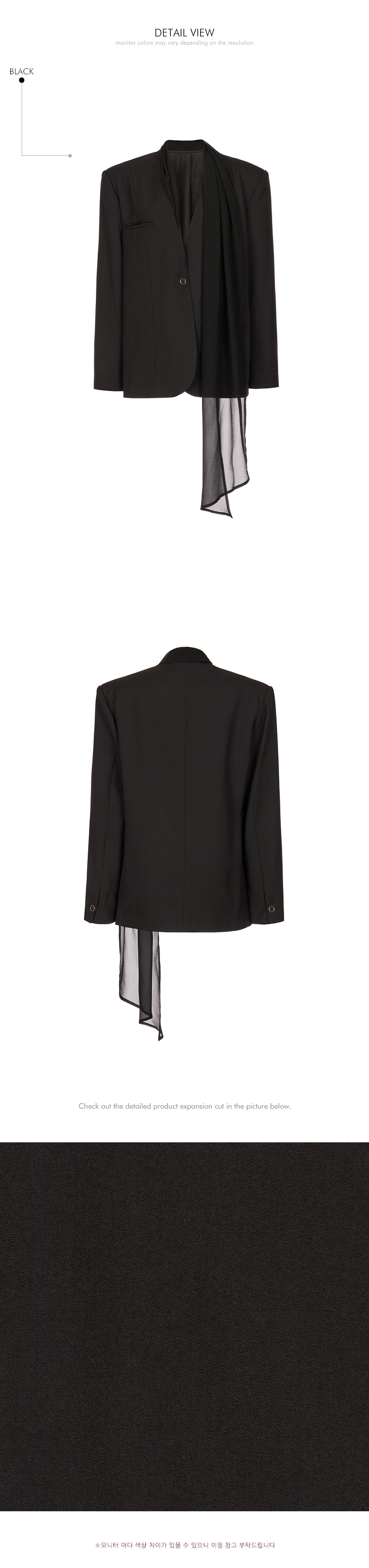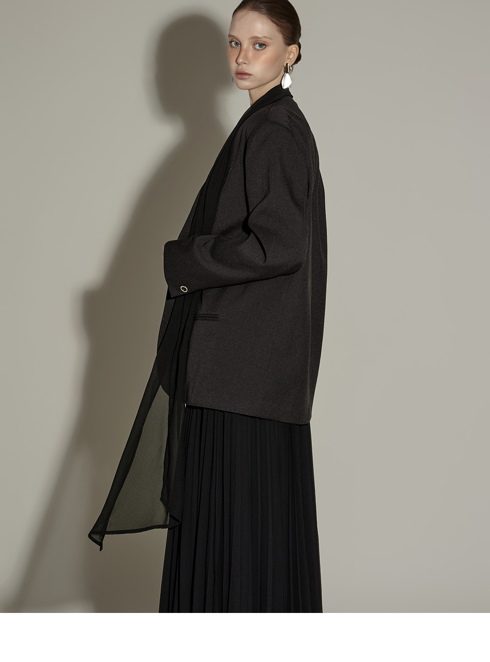精致氛围的围巾设计肩垫西装外套。 采用聚酯纤维、人造丝与腈纶混纺面料,质感挺括且富有弹性,穿着舒适。 可拆卸透视围巾设计,提供多样化造型搭配,袖口按扣及前襟按扣开合,既方便又保持利落的版型。 整体条纹内衬增添设计亮点,细节处体现用心,适度肩垫与前置双口袋,兼具实用性与整体完成度。 可单穿,亦可与连衣裙或西装裤搭配,打造多样日常造型。 模特身高174CM,穿着ONE码,黑色款。