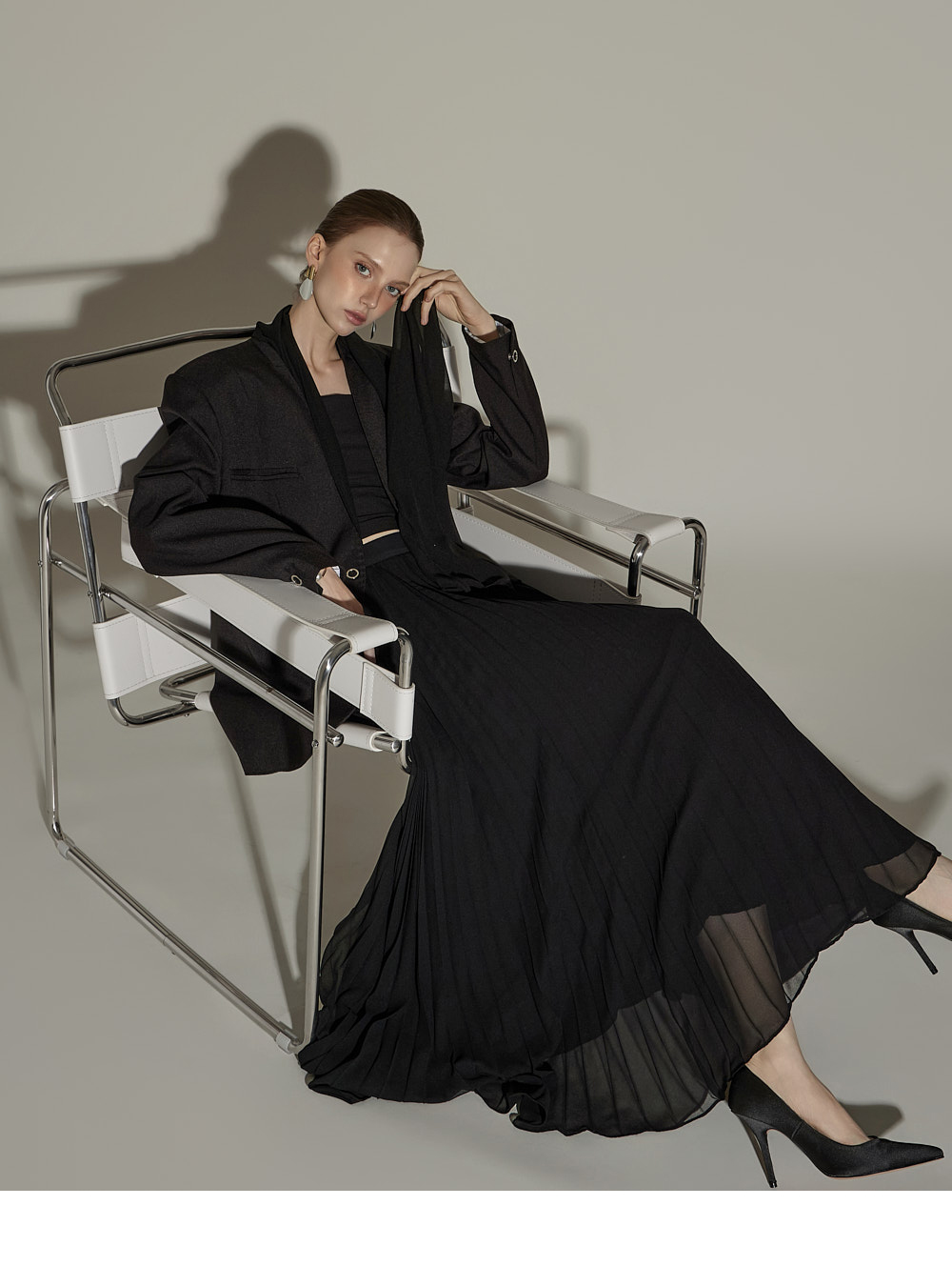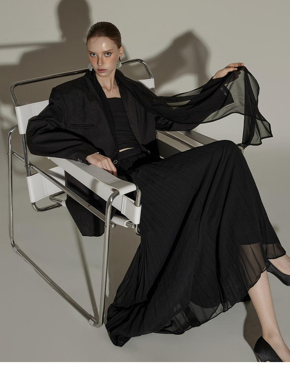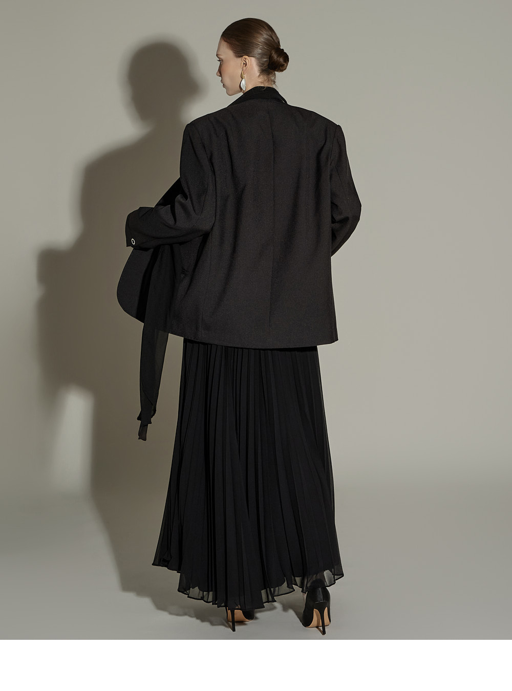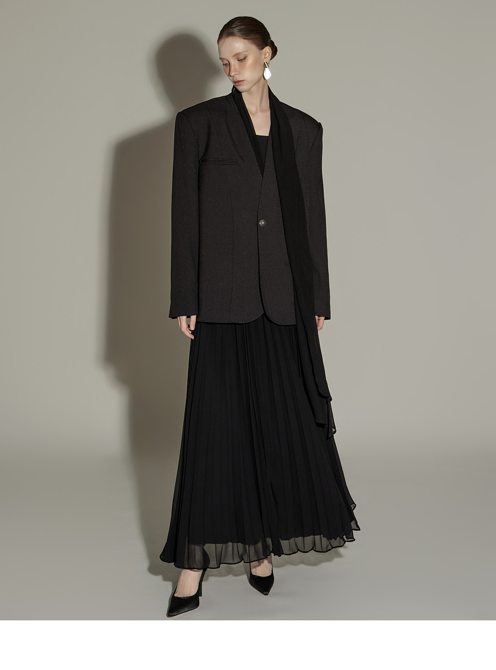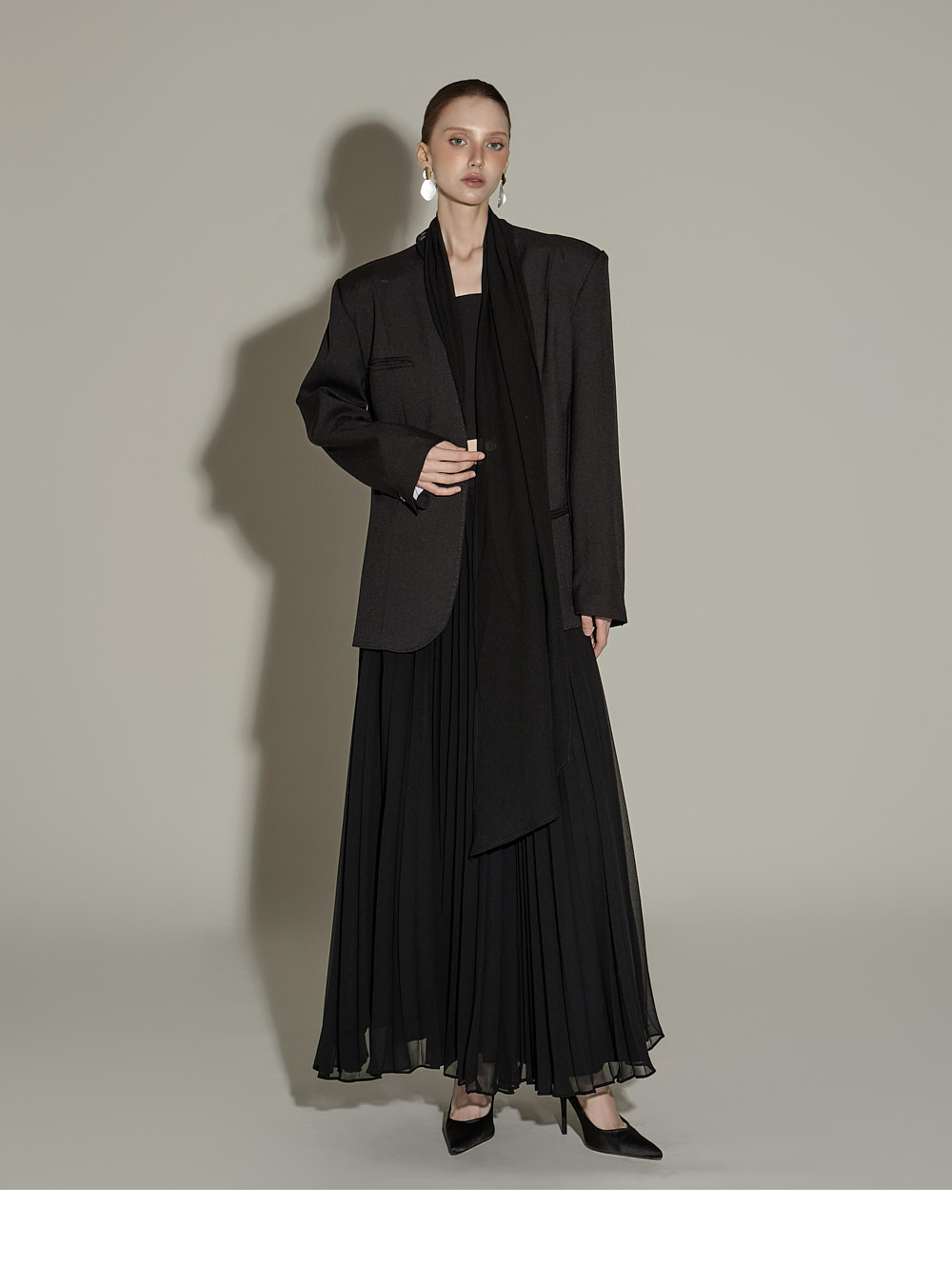 精致氛围的围巾设计肩垫西装外套。 采用聚酯纤维、人造丝与腈纶混纺面料,质感挺括且富有弹性,穿着舒适。 可拆卸透视围巾设计,提供多样化造型搭配,袖口按扣及前襟按扣开合,既方便又保持利落的版型。 整体条纹内衬增添设计亮点,细节处体现用心,适度肩垫与前置双口袋,兼具实用性与整体完成度。 可单穿,亦可与连衣裙或西装裤搭配,打造多样日常造型。 模特身高174CM,穿着ONE码,黑色款。