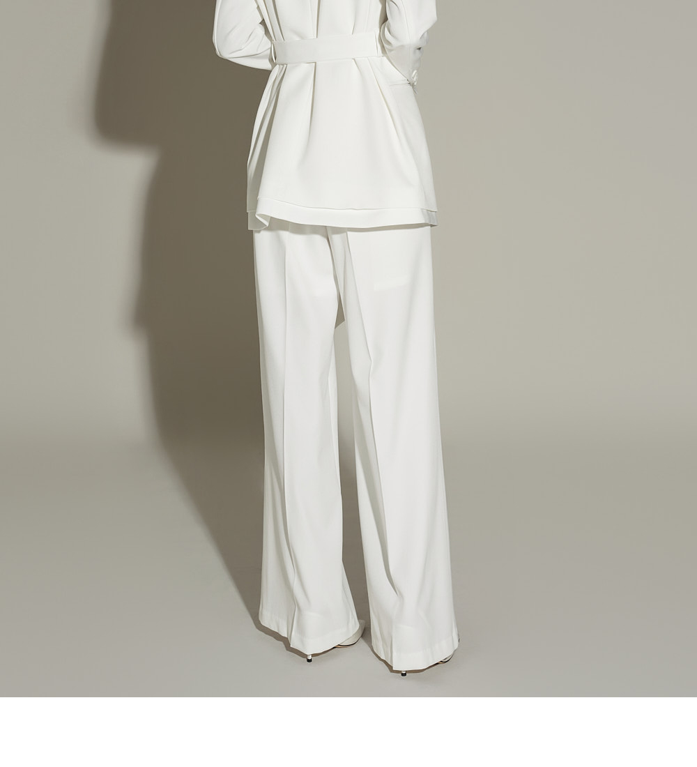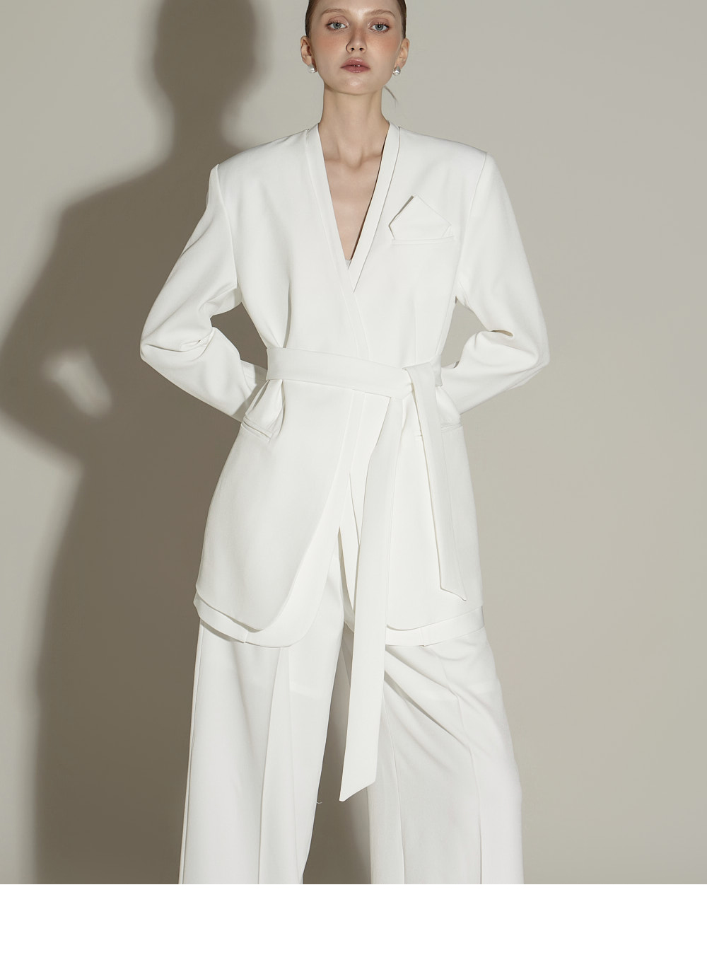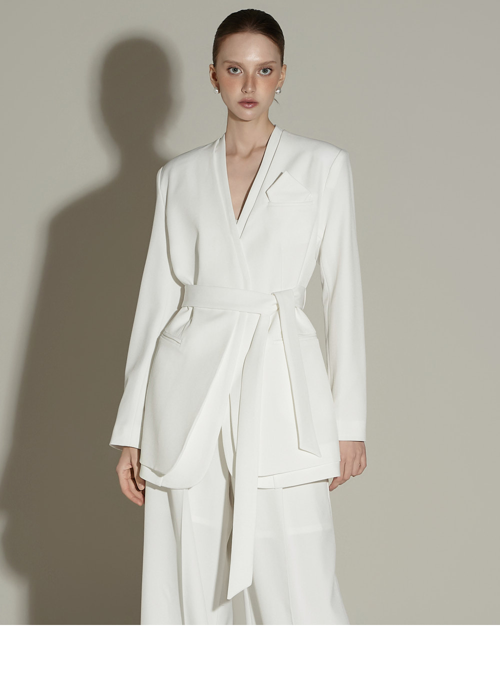 模特身高 173CM,外套穿 ONE SIZE,西裤穿 S 码,白色。