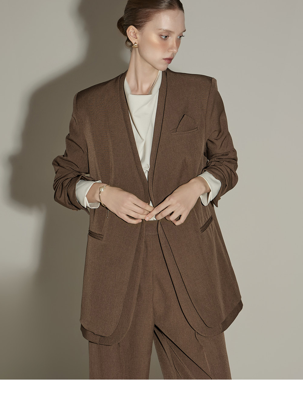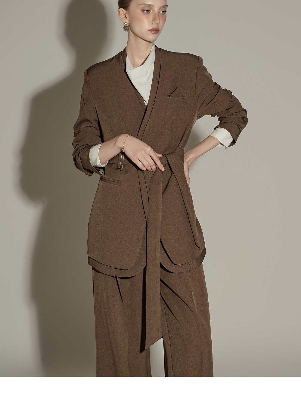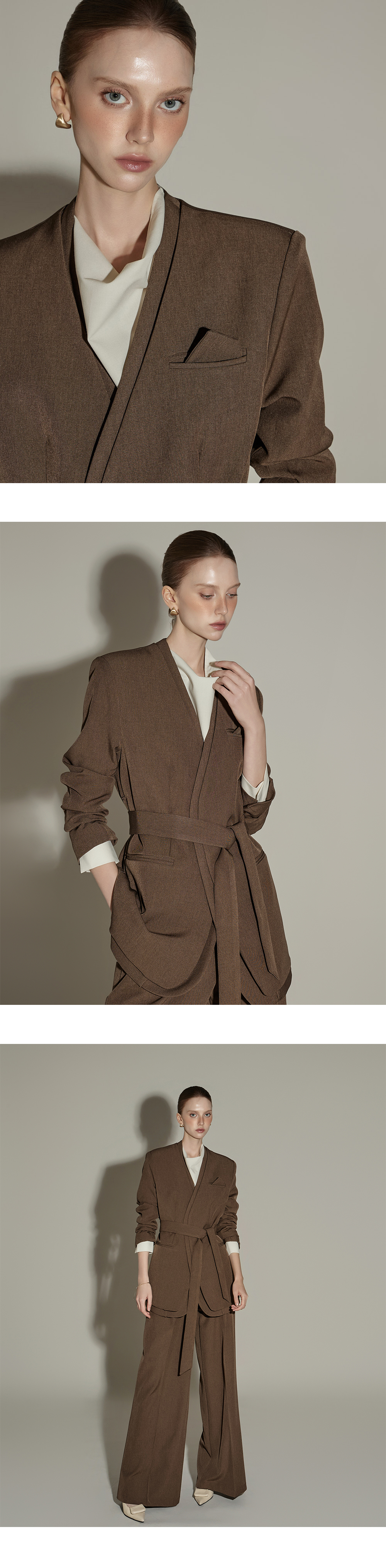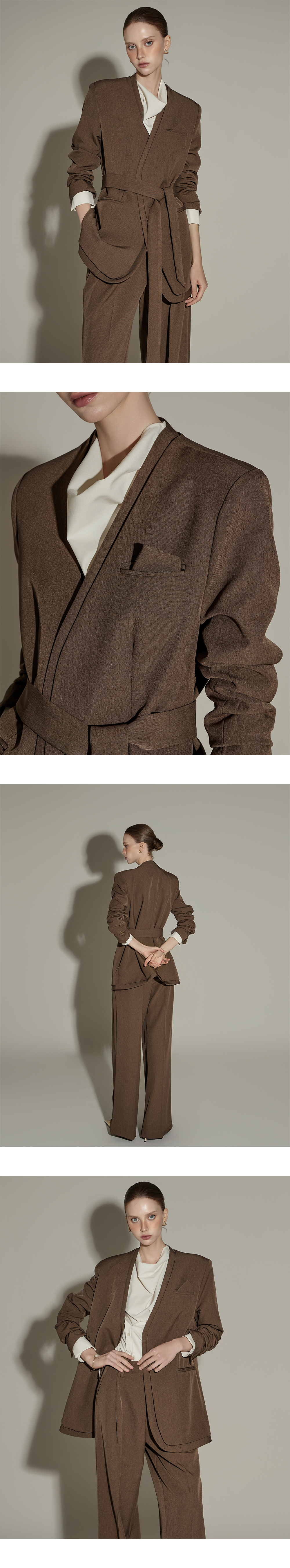 模特身高174CM,夹克ONE码 / 裤装S码,棕色款。