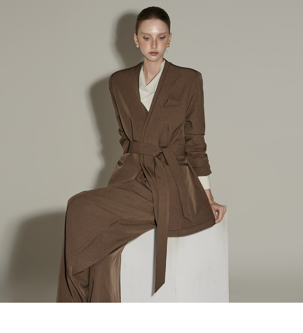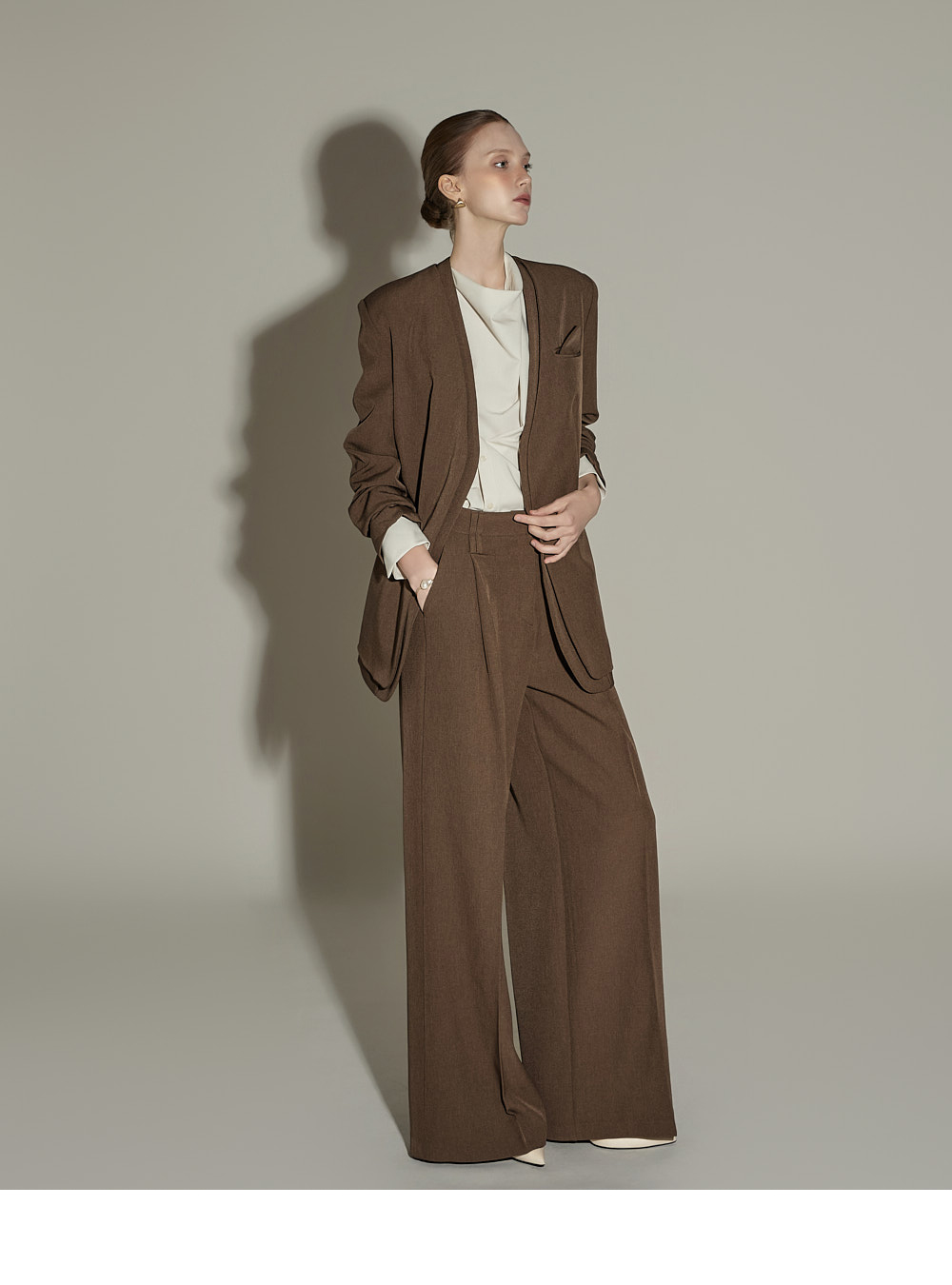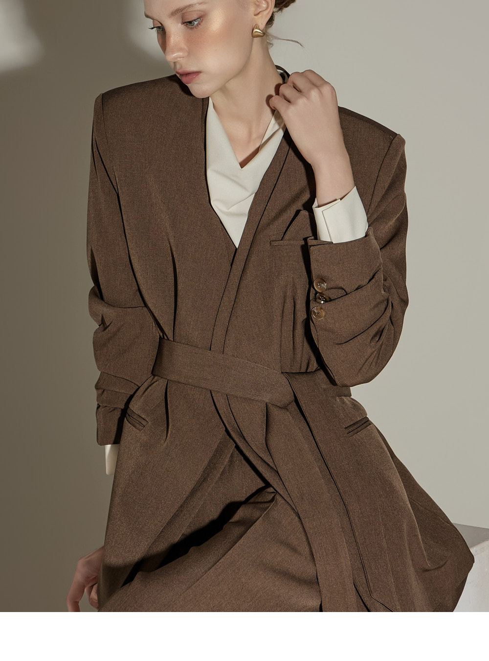 模特身高174CM,夹克ONE码 / 裤装S码,棕色款。