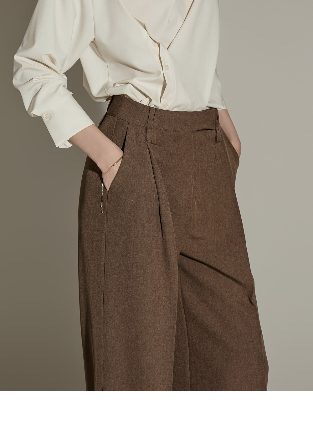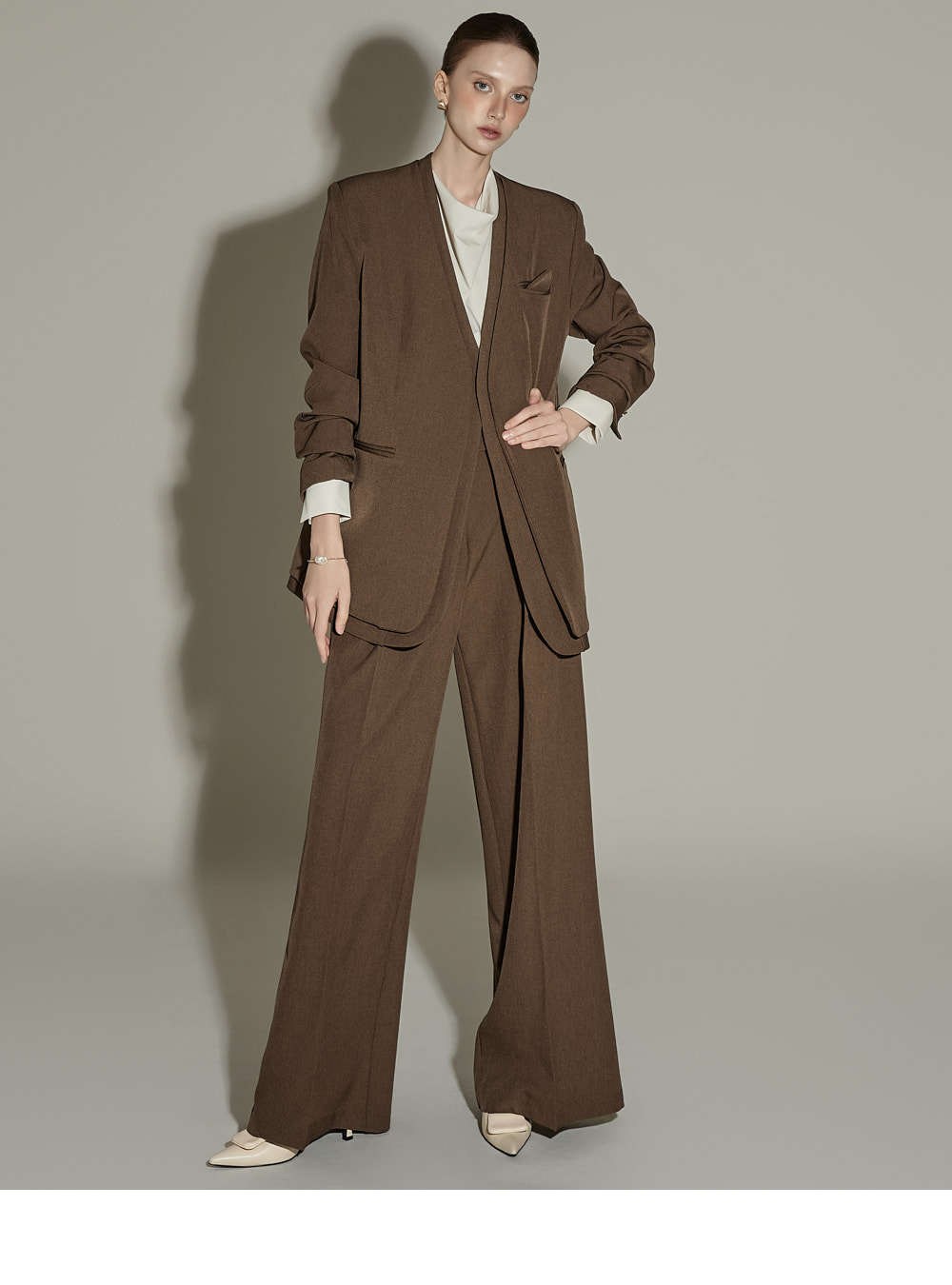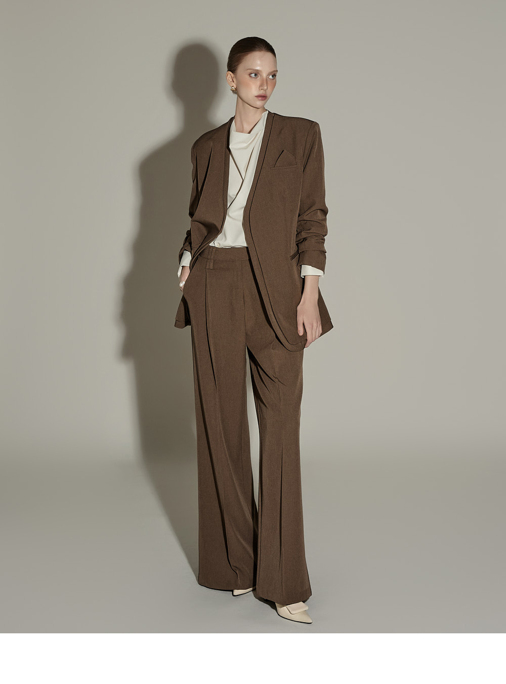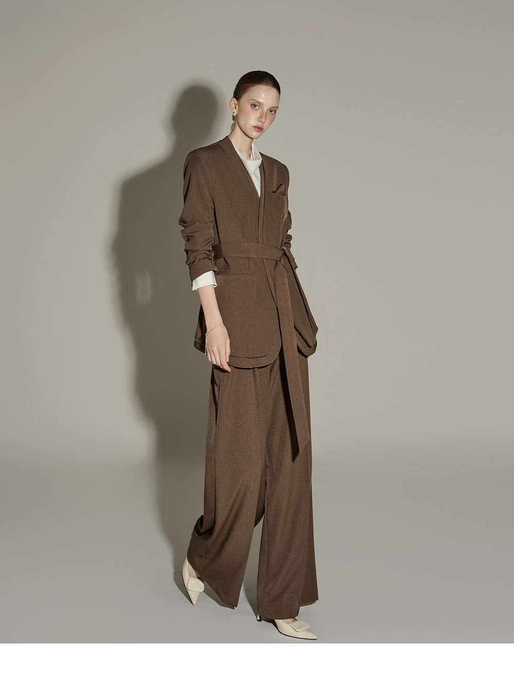 模特身高174CM,夹克ONE码 / 裤装S码,棕色款。