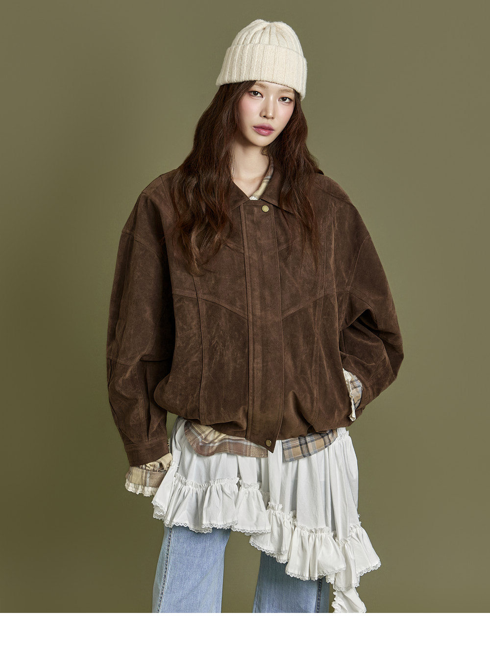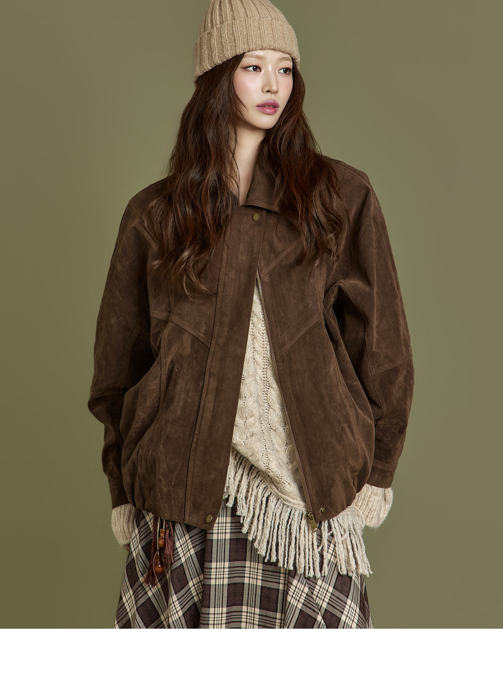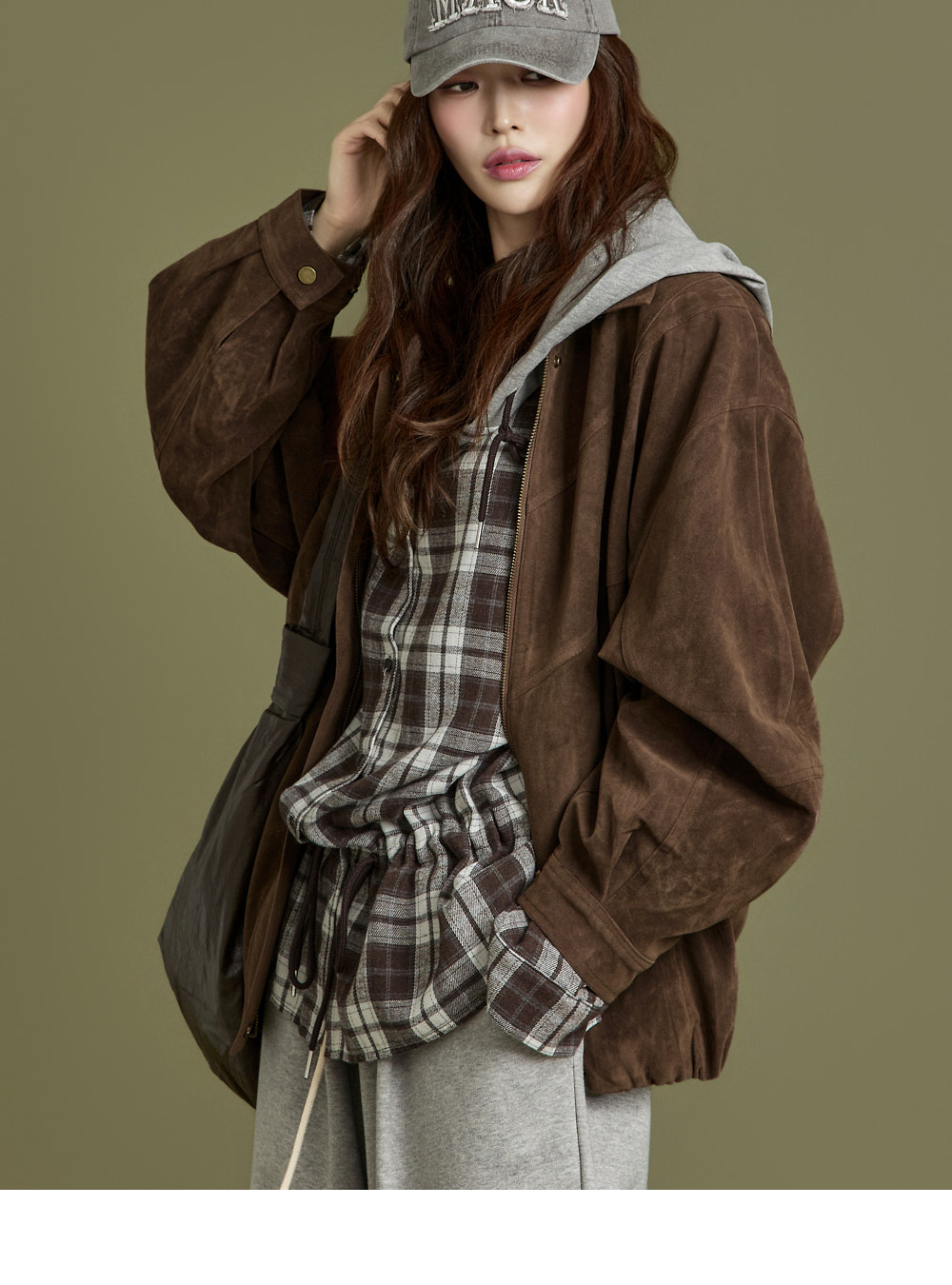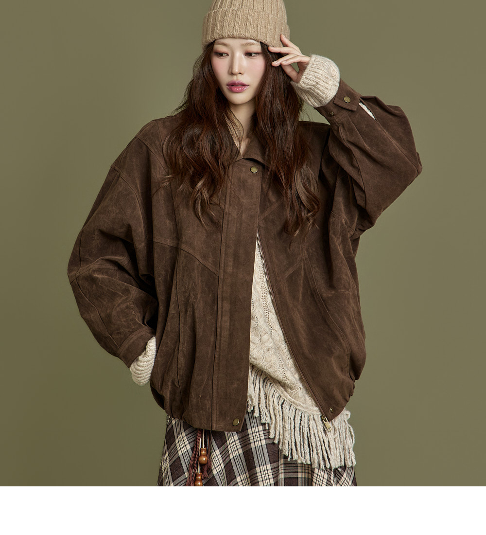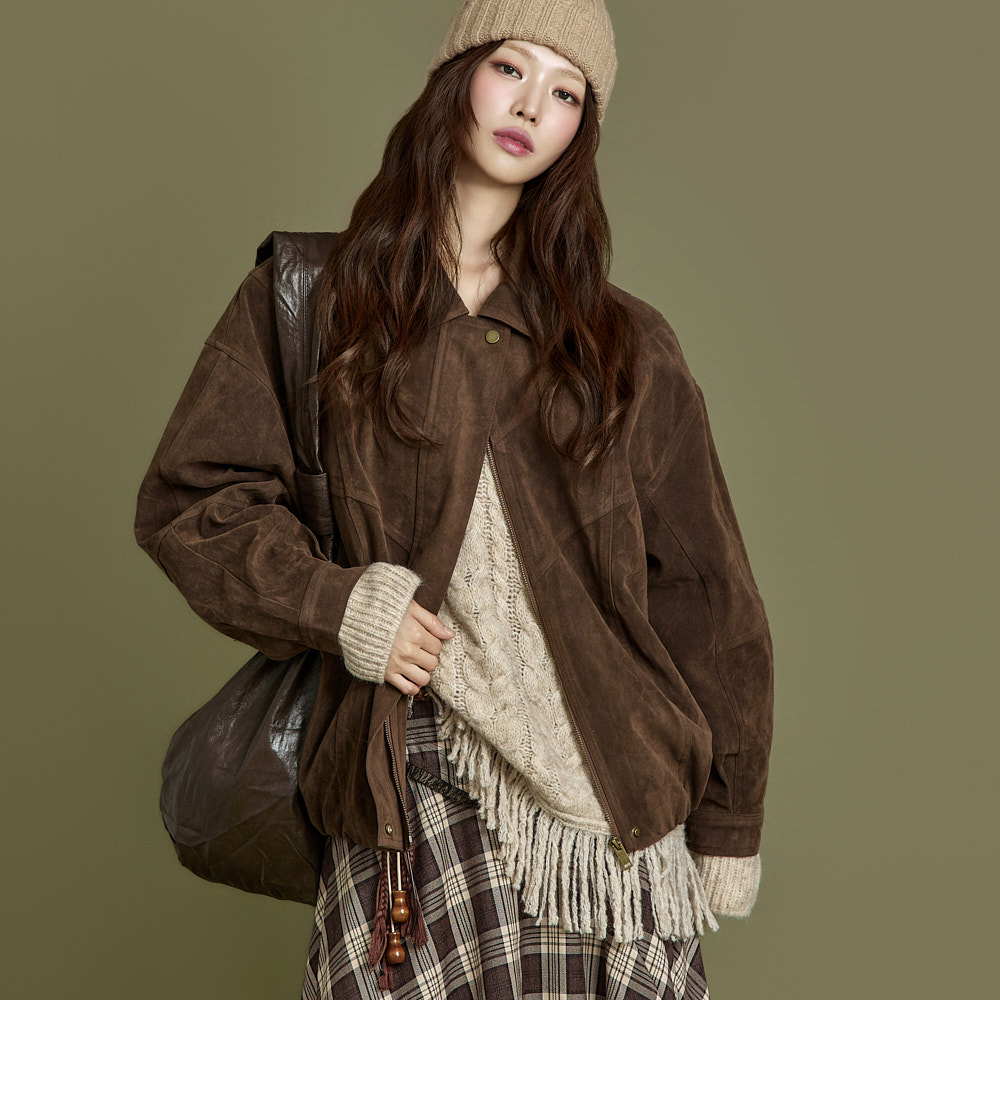 这是一款以麂皮质感为亮点的休闲风格夹克。 采用聚酯纤维材质制成,轻盈柔软,穿着舒适,整体内衬设计,非常适合作为换季外套使用。 拼接线条与麂皮表面感相结合,营造出时尚的轮廓,拉链与按扣双重开合设计提升了实用性与保暖性。 两侧口袋与适度的肩垫设计,让整体轮廓更加稳固,是一款可轻松搭配休闲造型的外套单品。 171CM 模特穿着 ONE 尺码,BROWN 颜色。