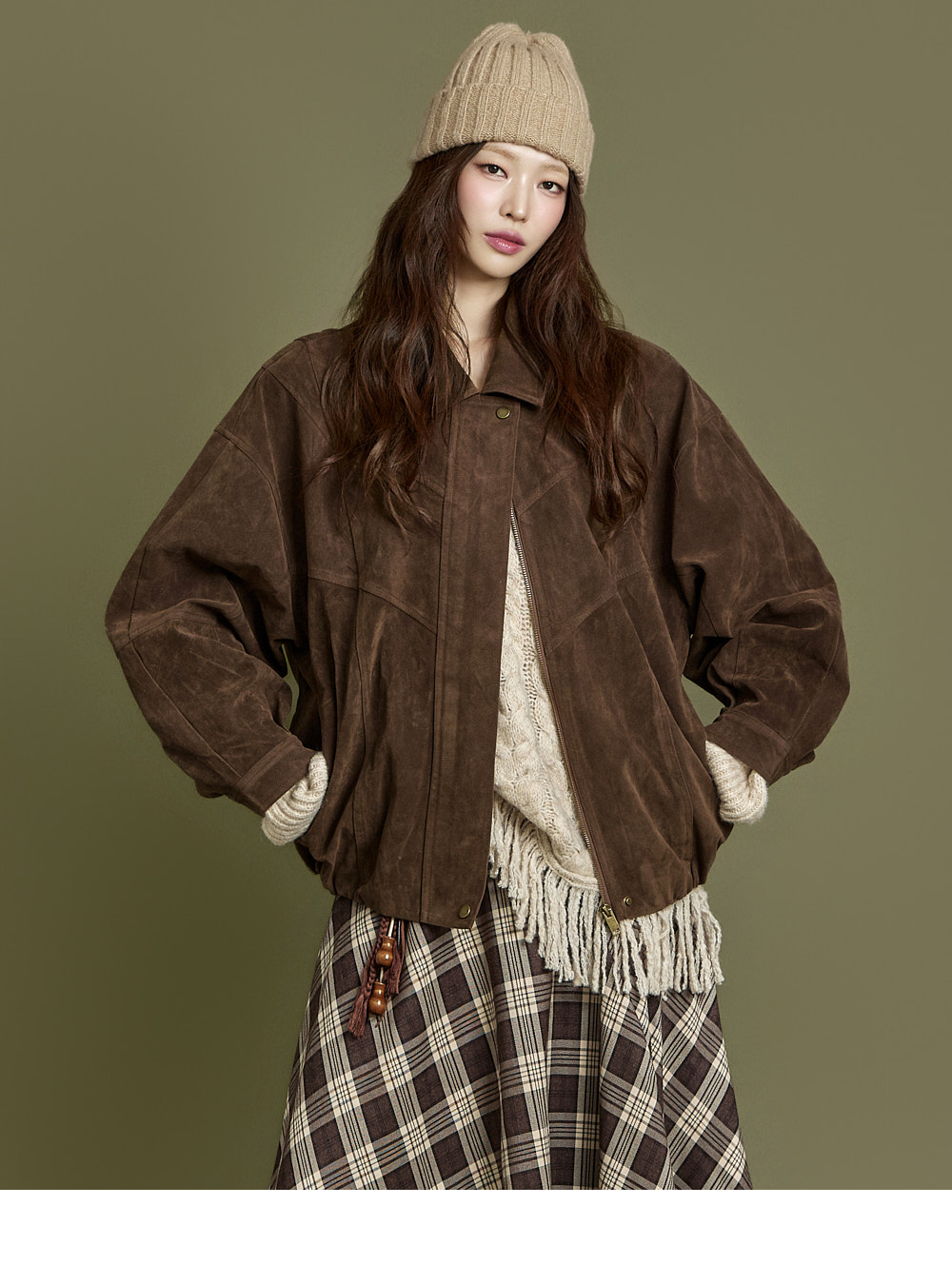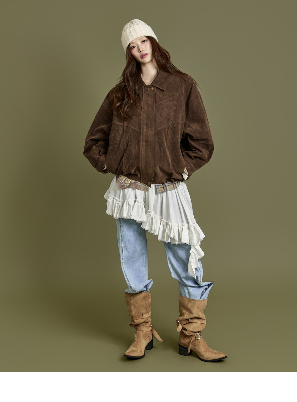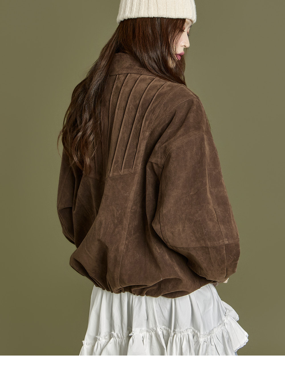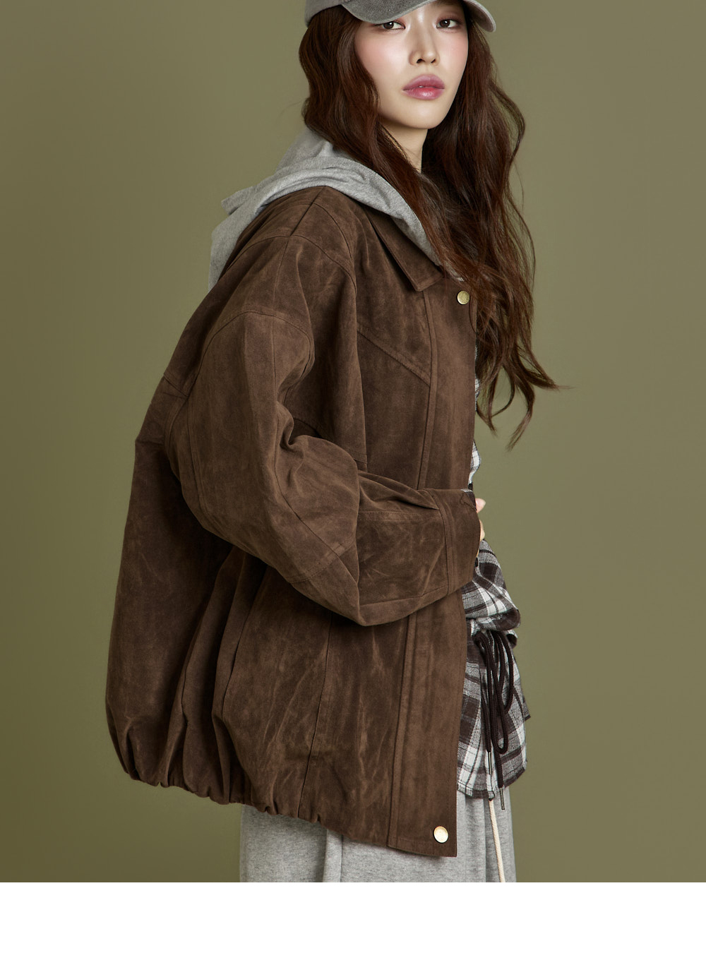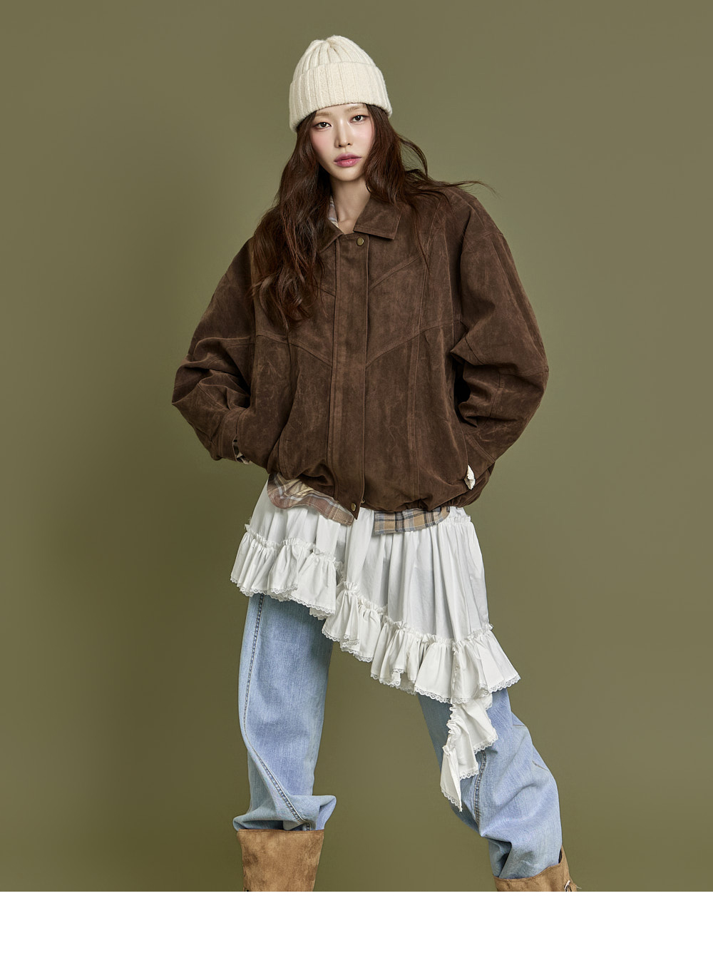 这是一款以麂皮质感为亮点的休闲风格夹克。 采用聚酯纤维材质制成,轻盈柔软,穿着舒适,整体内衬设计,非常适合作为换季外套使用。 拼接线条与麂皮表面感相结合,营造出时尚的轮廓,拉链与按扣双重开合设计提升了实用性与保暖性。 两侧口袋与适度的肩垫设计,让整体轮廓更加稳固,是一款可轻松搭配休闲造型的外套单品。 171CM 模特穿着 ONE 尺码,BROWN 颜色。