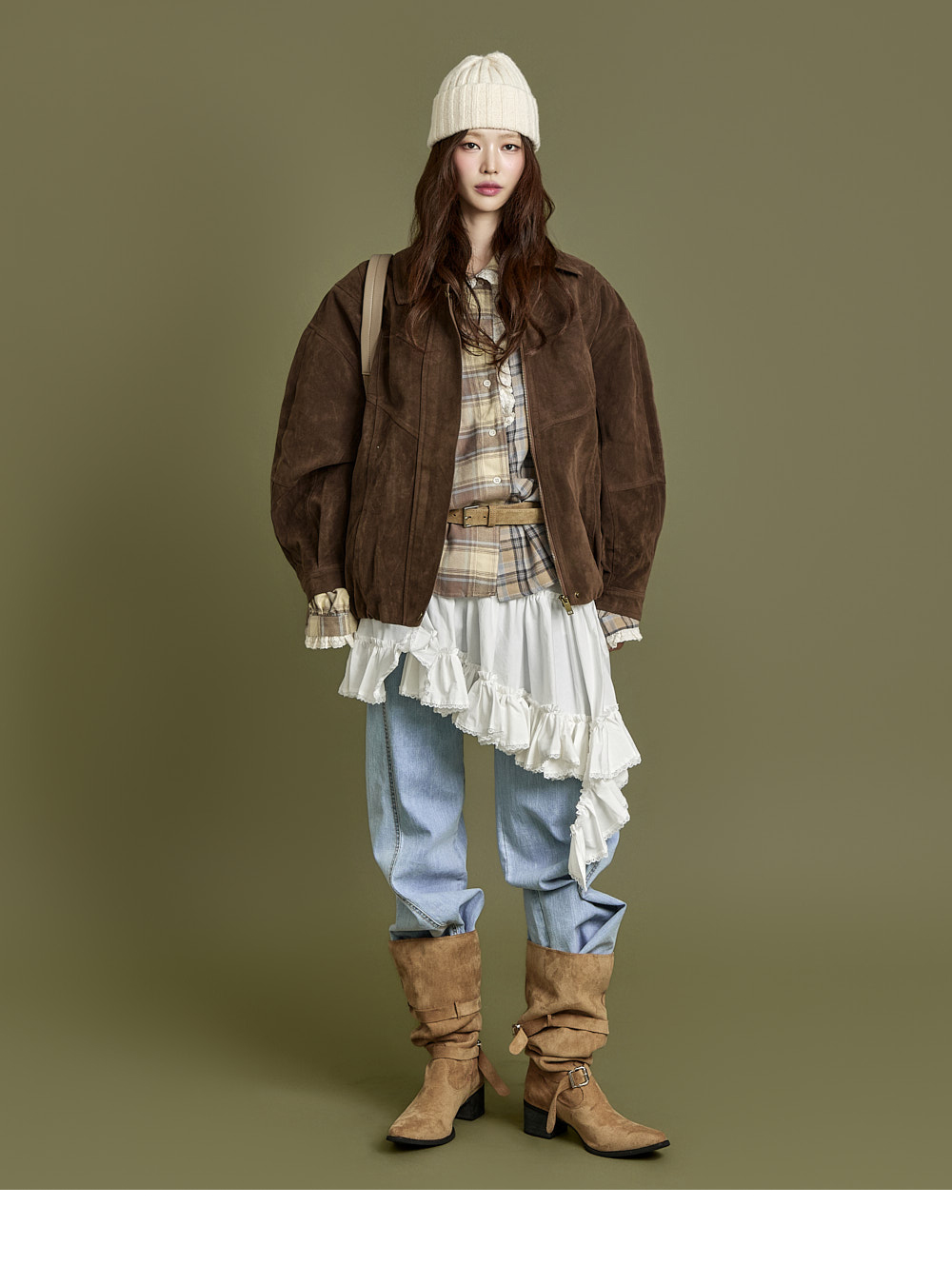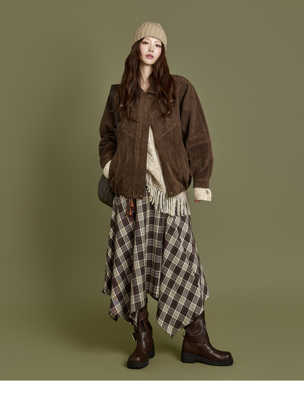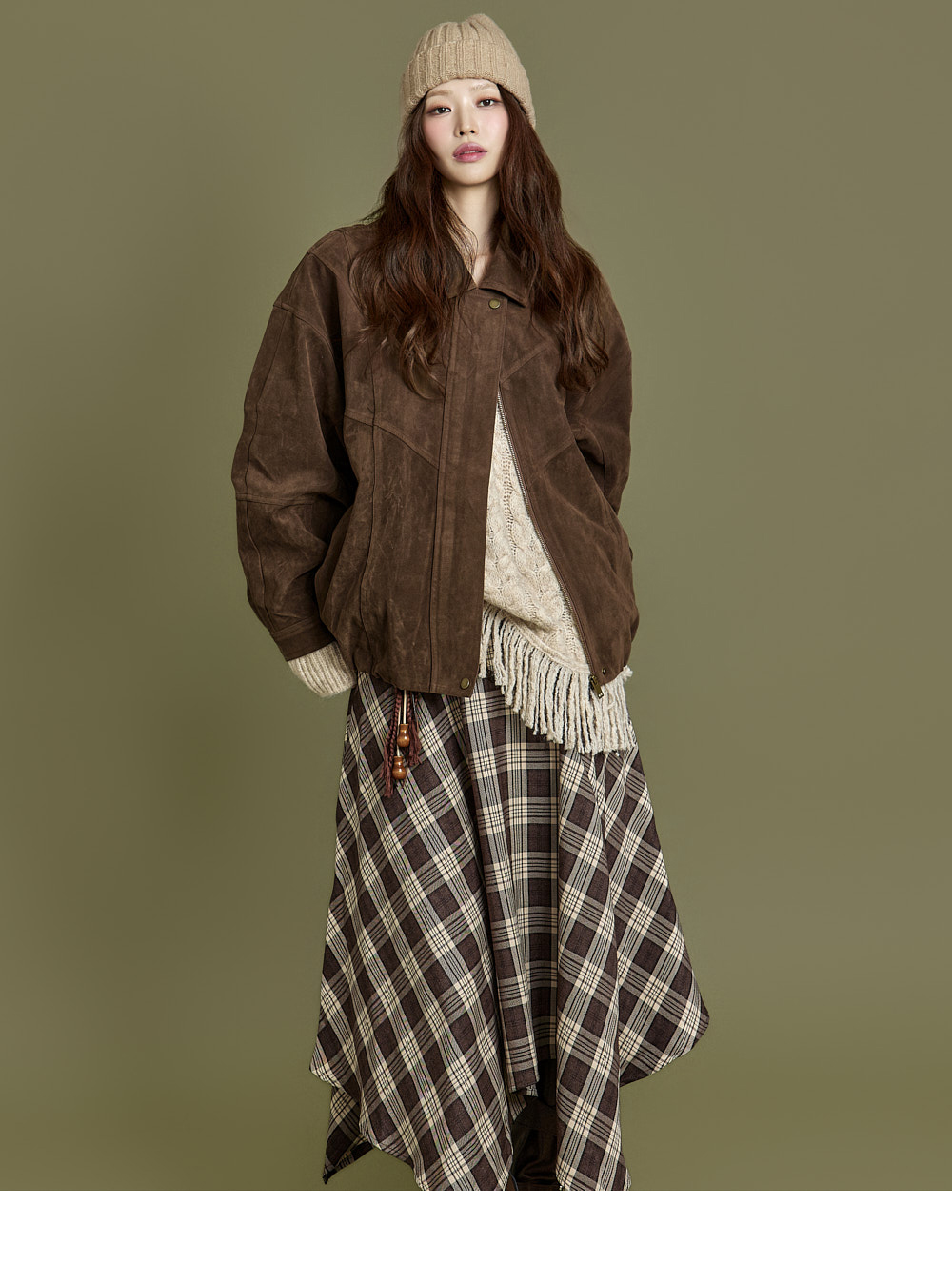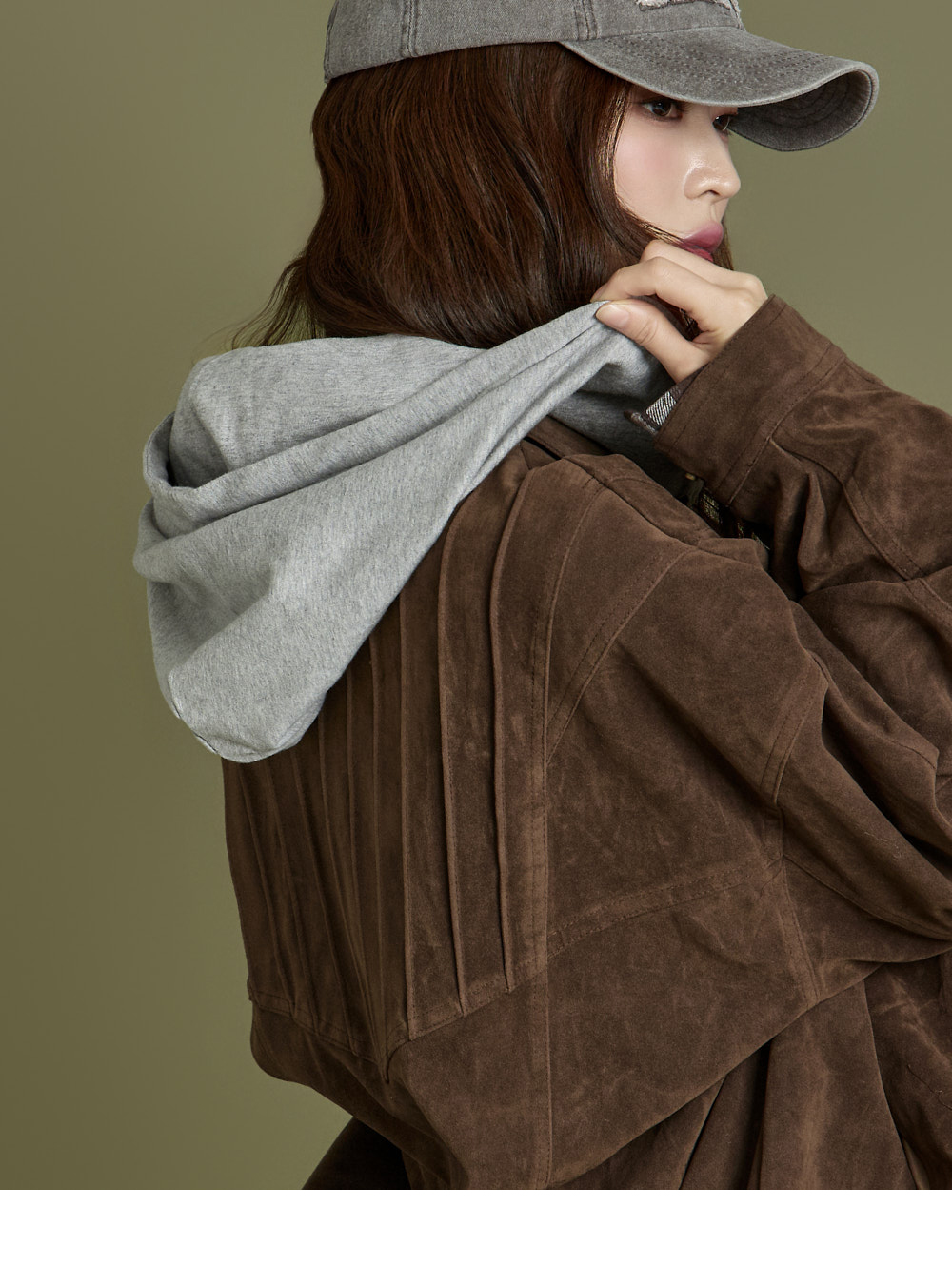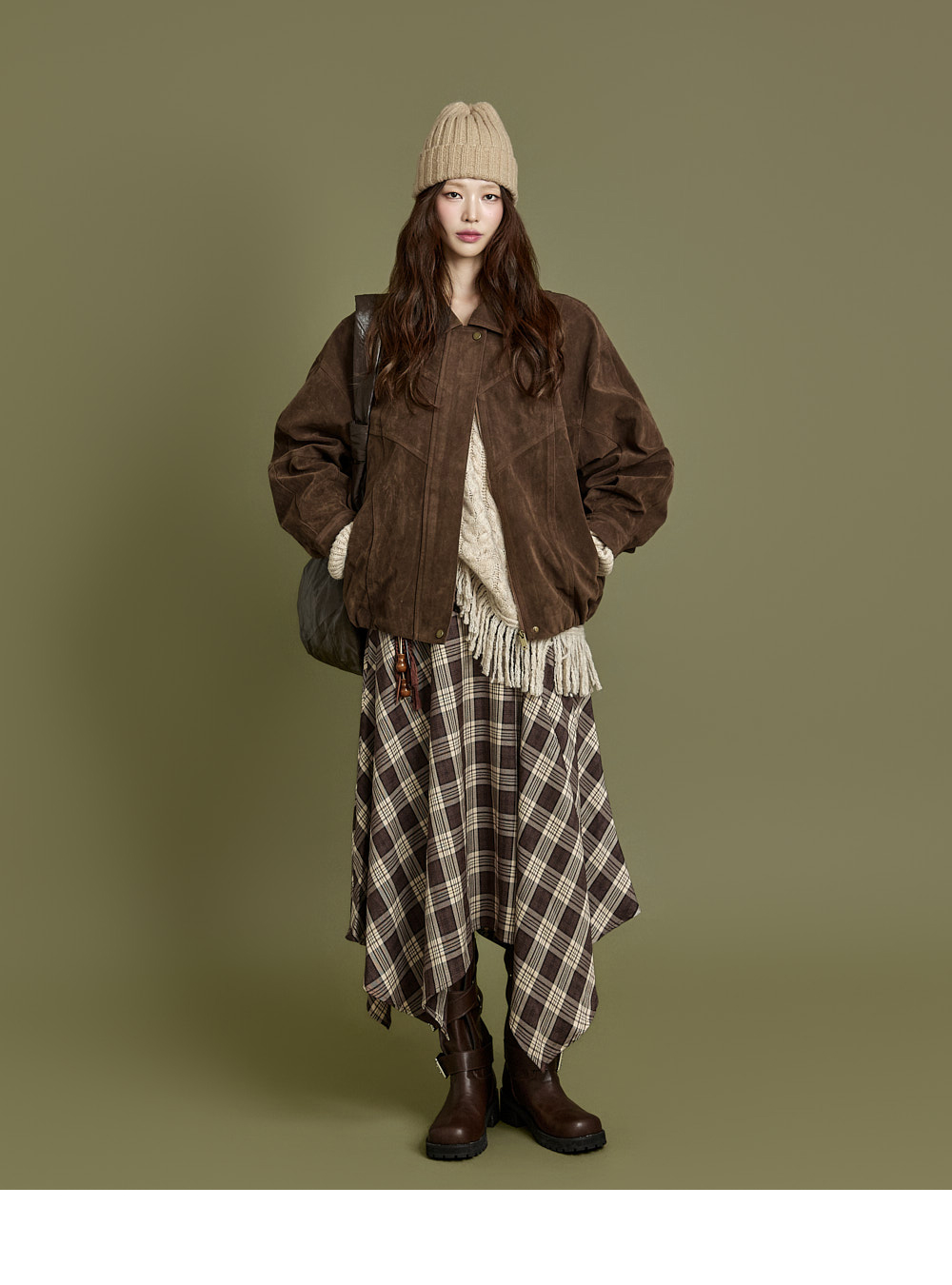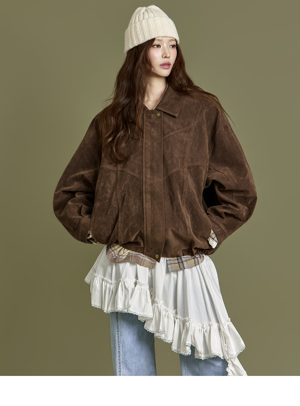 这是一款以麂皮质感为亮点的休闲风格夹克。 采用聚酯纤维材质制成,轻盈柔软,穿着舒适,整体内衬设计,非常适合作为换季外套使用。 拼接线条与麂皮表面感相结合,营造出时尚的轮廓,拉链与按扣双重开合设计提升了实用性与保暖性。 两侧口袋与适度的肩垫设计,让整体轮廓更加稳固,是一款可轻松搭配休闲造型的外套单品。 171CM 模特穿着 ONE 尺码,BROWN 颜色。