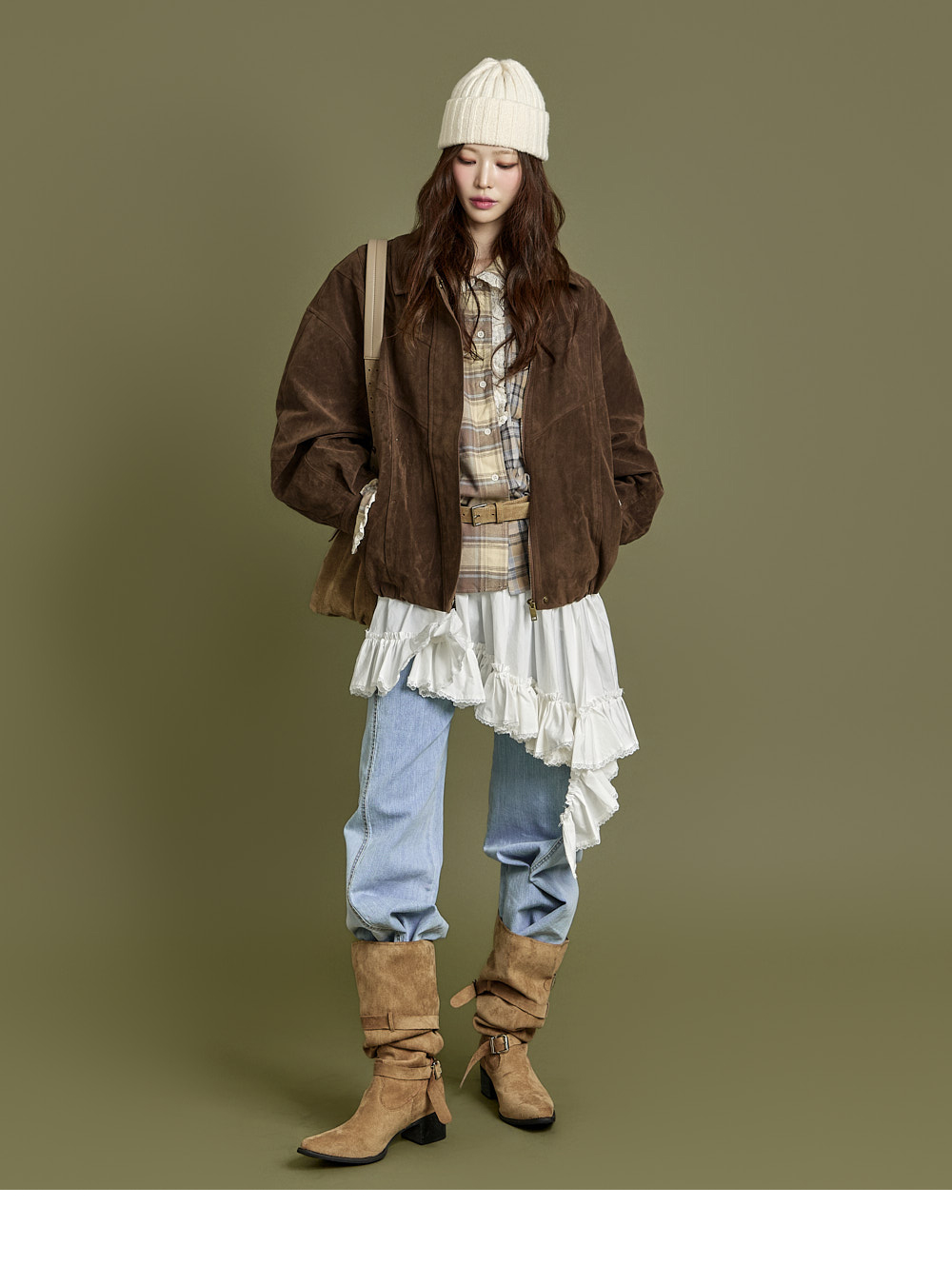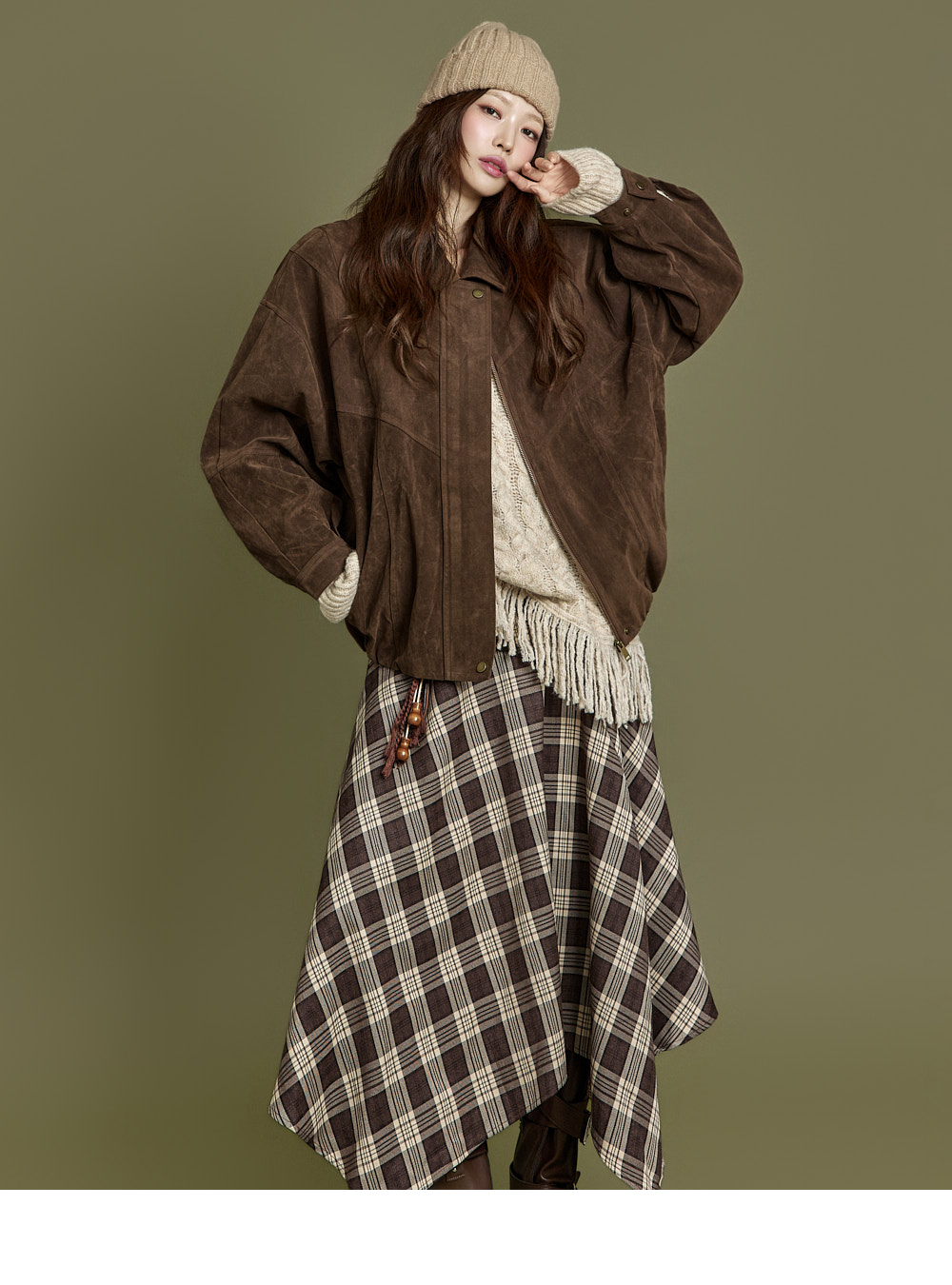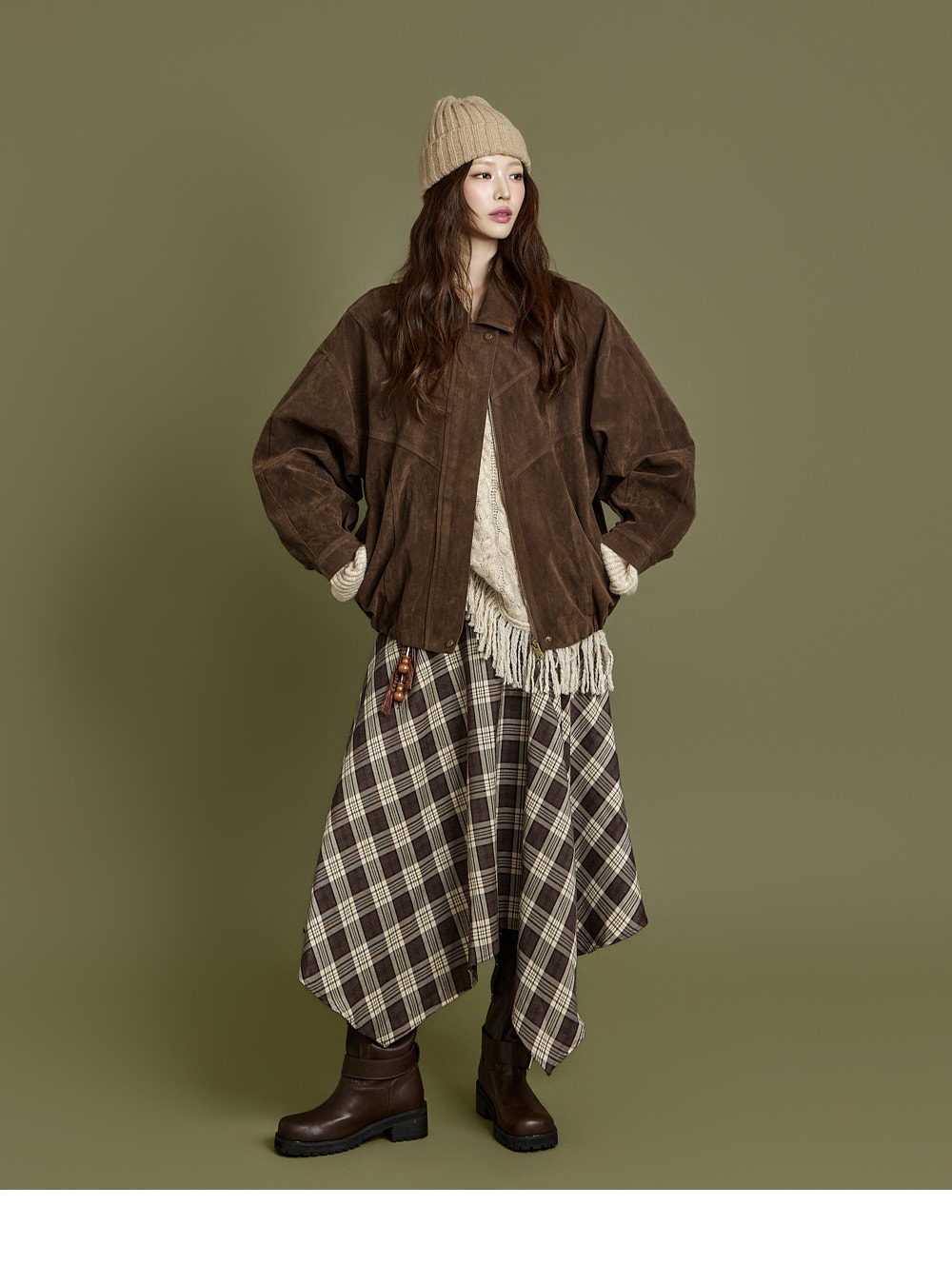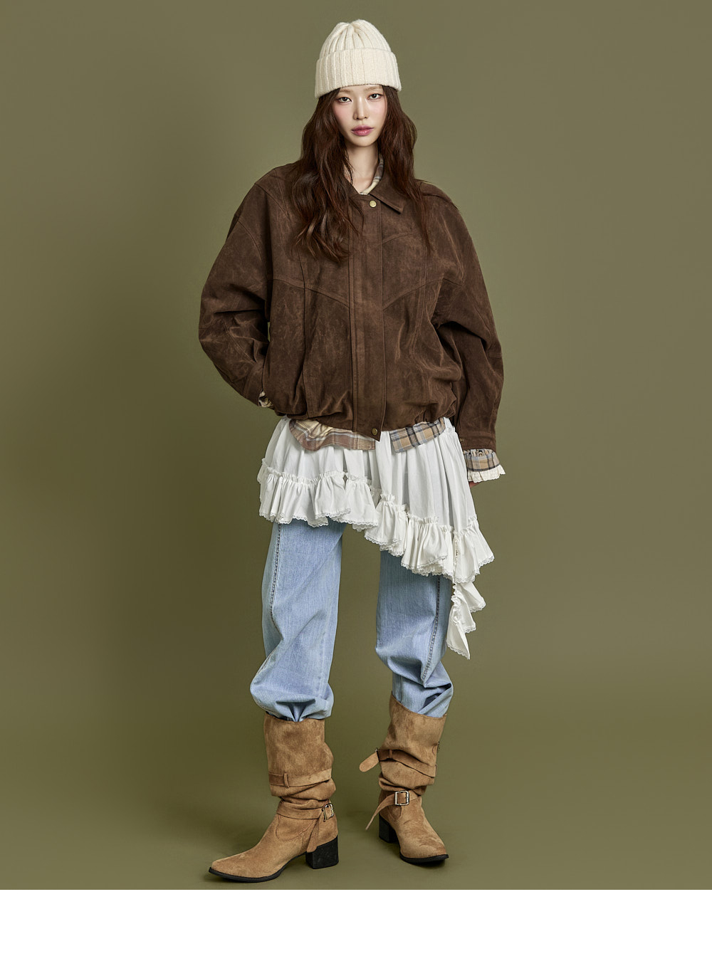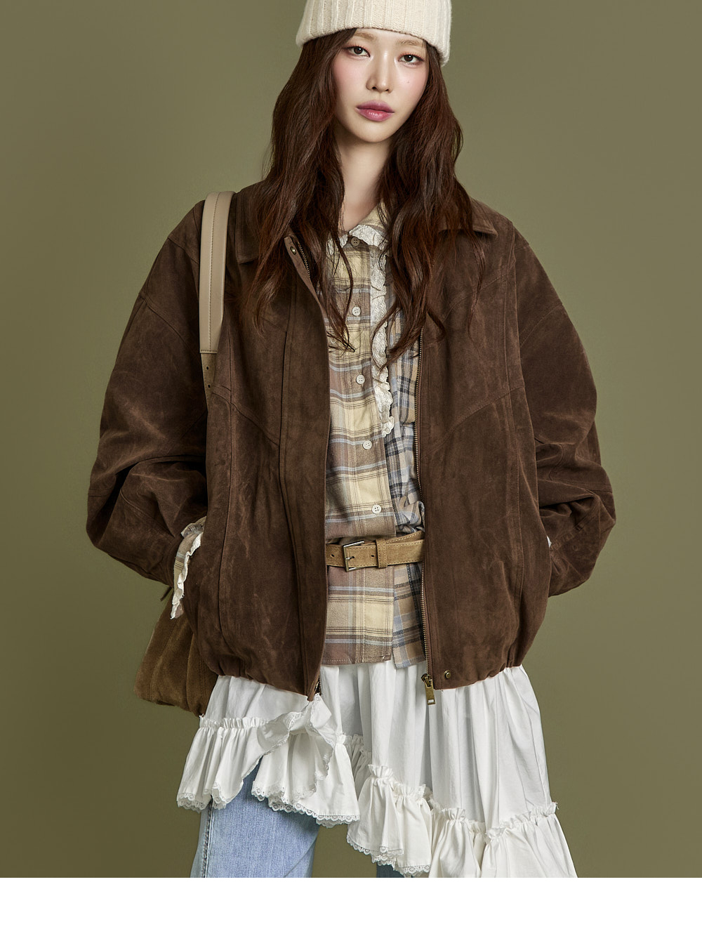 这是一款以麂皮质感为亮点的休闲风格夹克。 采用聚酯纤维材质制成,轻盈柔软,穿着舒适,整体内衬设计,非常适合作为换季外套使用。 拼接线条与麂皮表面感相结合,营造出时尚的轮廓,拉链与按扣双重开合设计提升了实用性与保暖性。 两侧口袋与适度的肩垫设计,让整体轮廓更加稳固,是一款可轻松搭配休闲造型的外套单品。 171CM 模特穿着 ONE 尺码,BROWN 颜色。