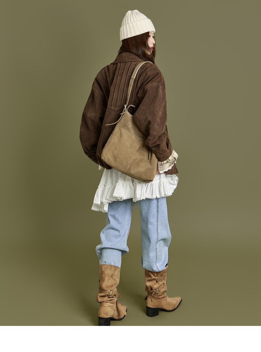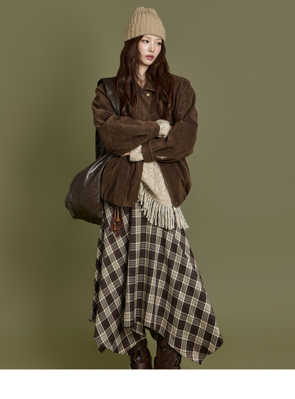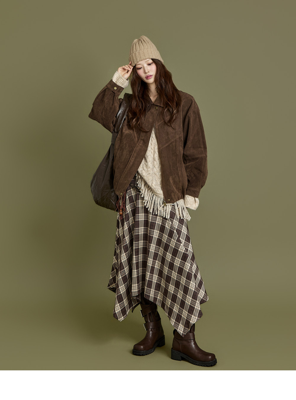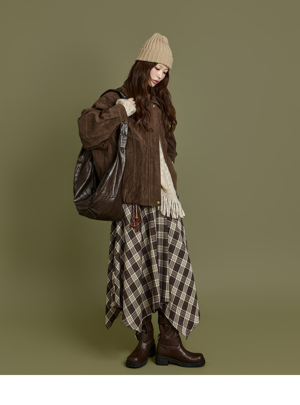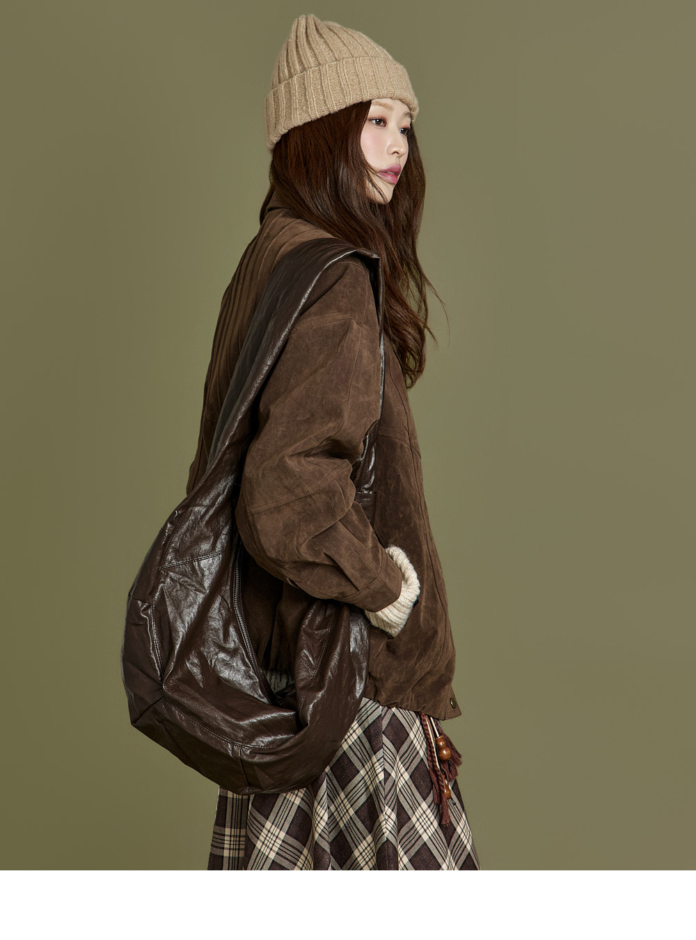 这是一款以麂皮质感为亮点的休闲风格夹克。 采用聚酯纤维材质制成,轻盈柔软,穿着舒适,整体内衬设计,非常适合作为换季外套使用。 拼接线条与麂皮表面感相结合,营造出时尚的轮廓,拉链与按扣双重开合设计提升了实用性与保暖性。 两侧口袋与适度的肩垫设计,让整体轮廓更加稳固,是一款可轻松搭配休闲造型的外套单品。 171CM 模特穿着 ONE 尺码,BROWN 颜色。