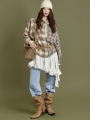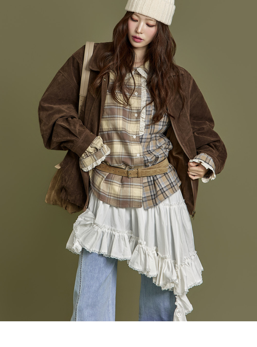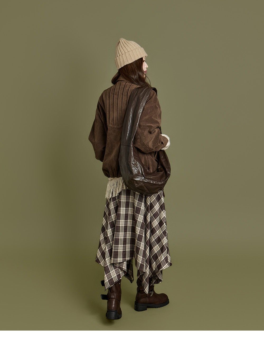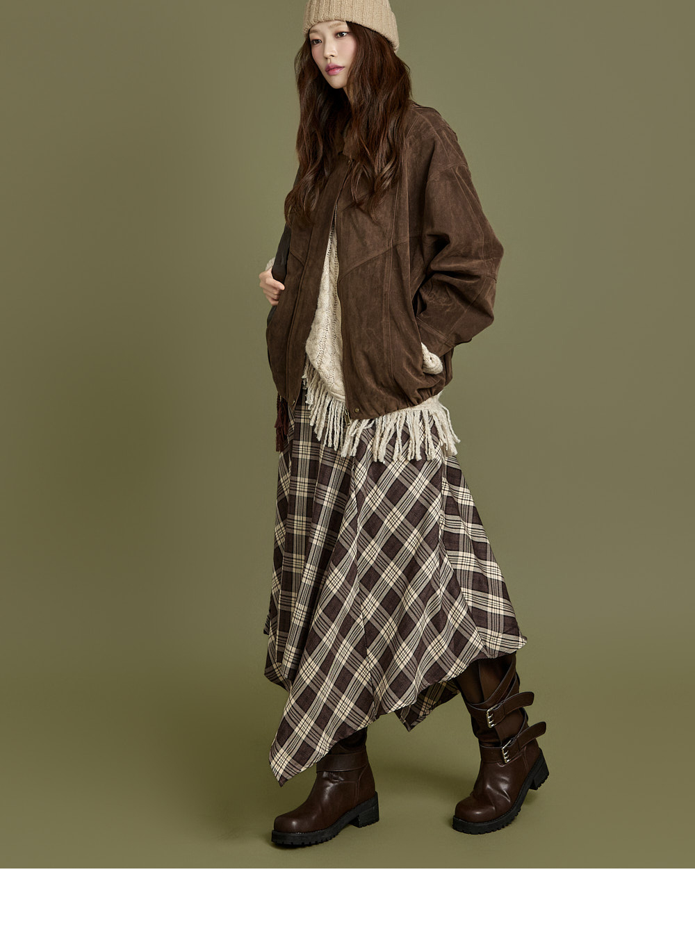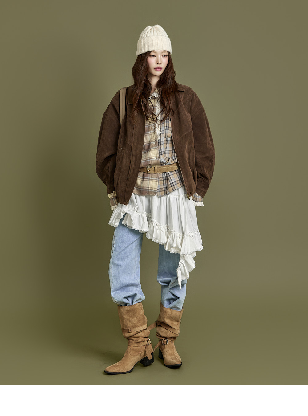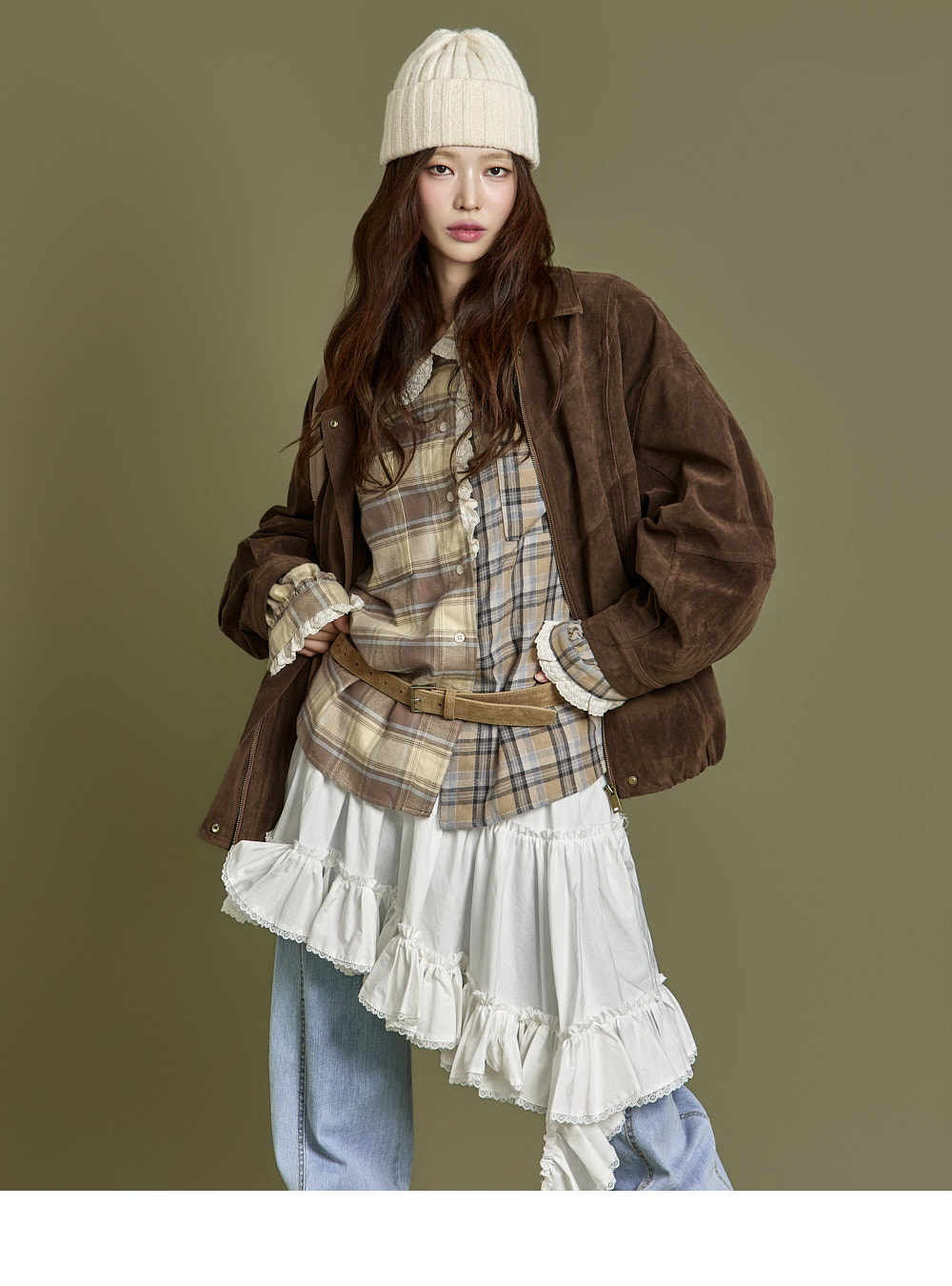 这是一款以麂皮质感为亮点的休闲风格夹克。 采用聚酯纤维材质制成,轻盈柔软,穿着舒适,整体内衬设计,非常适合作为换季外套使用。 拼接线条与麂皮表面感相结合,营造出时尚的轮廓,拉链与按扣双重开合设计提升了实用性与保暖性。 两侧口袋与适度的肩垫设计,让整体轮廓更加稳固,是一款可轻松搭配休闲造型的外套单品。 171CM 模特穿着 ONE 尺码,BROWN 颜色。