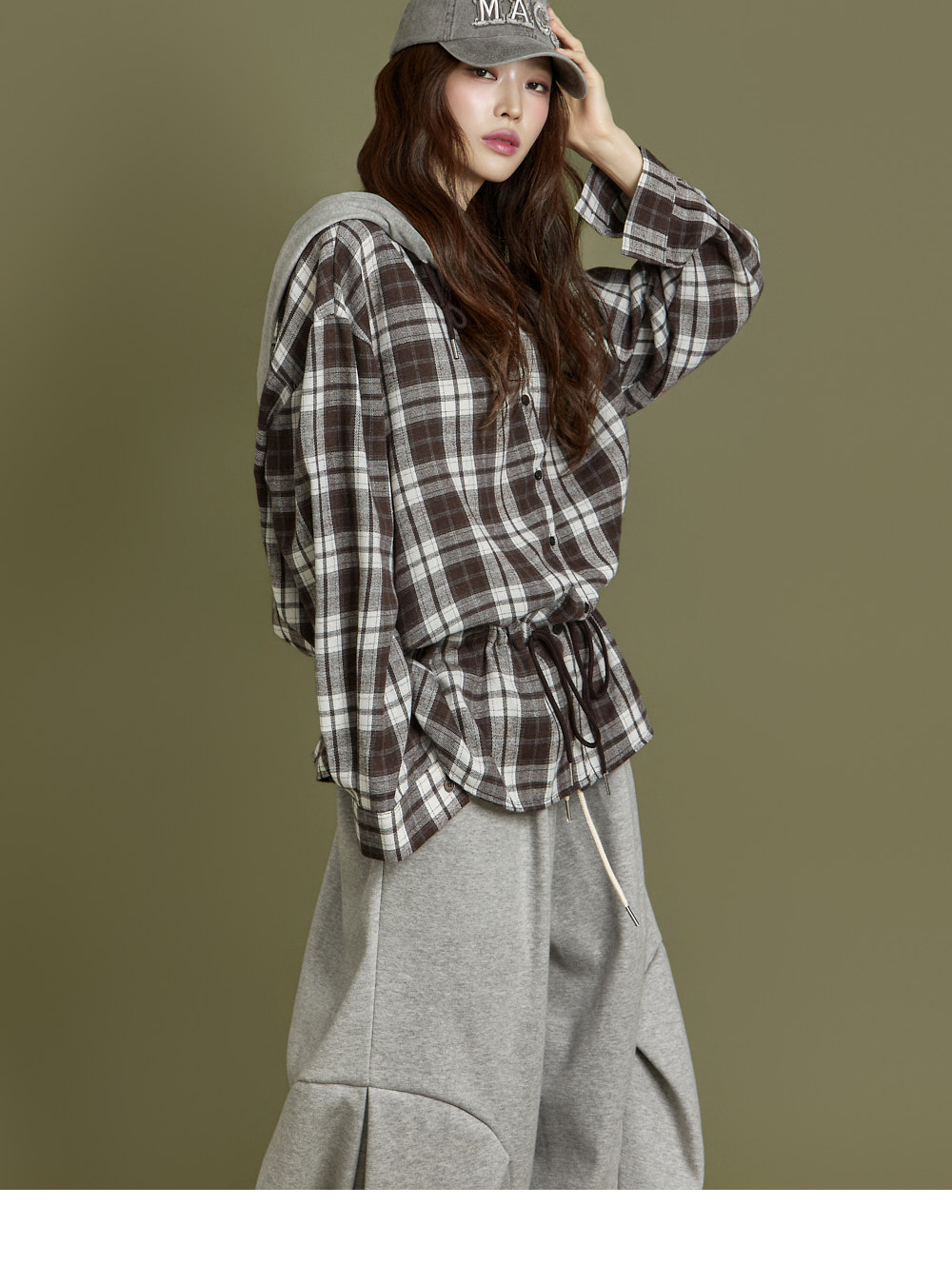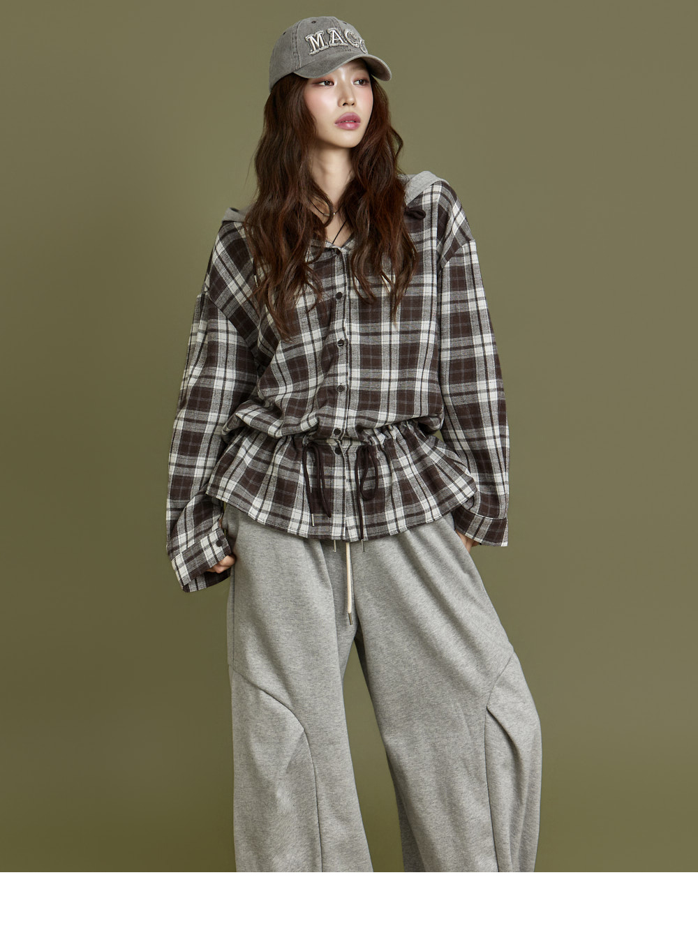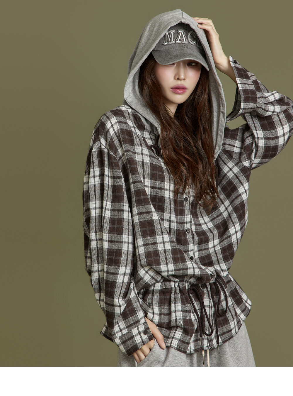 这是一款休闲风格的格纹连帽衬衫。 采用100%棉面料制作,柔软舒适,贴合穿着感。 整体宽松版型,搭配连帽设计,增添休闲氛围;自然下垂的下摆曲线让轮廓更柔和。 前襟纽扣设计与胸前口袋细节,配合低调的格纹图案,增添亮点;适度肩垫设计,使线条干净利落。 既可单穿,也可作为外套搭配,轻松搭配牛仔裤或半身裙,日常造型轻松完成。 171CM 模特穿着 ONE 尺码,BROWN 颜色。