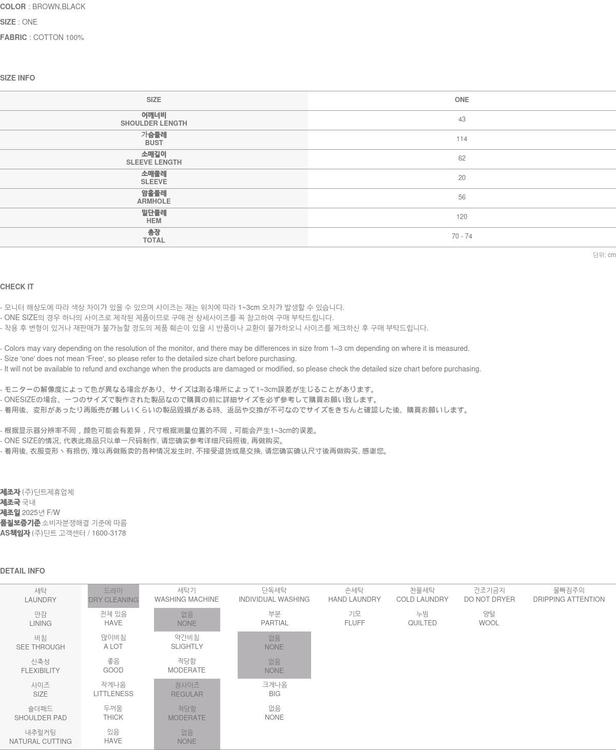換貨 與 退貨 收到商品後, 7日內能在我的頁面申請交換或退貨, 申請後請將商品寄回DINT. 申請後, 請填寫包裹裡一同寄去的撤回申請書, 再將包裹包裝成一開始您收到時的狀態(包裝袋、衣架、贈品皆要一起寄送回來)發送至DINT即可. 因爲顧客變心所申請的換貨與退貨, 運費將由顧客負擔;誤送或是商品瑕疵的部分, 將由DINT負擔運費. 退貨住所爲:首爾市 衿川區 加山洞 459-8號 大韓通運 7樓 DINT股份有限公司 品質保證標準說明:符合電子商務等有關消費者保護法律規定的消費者可申請交換或是退貨.