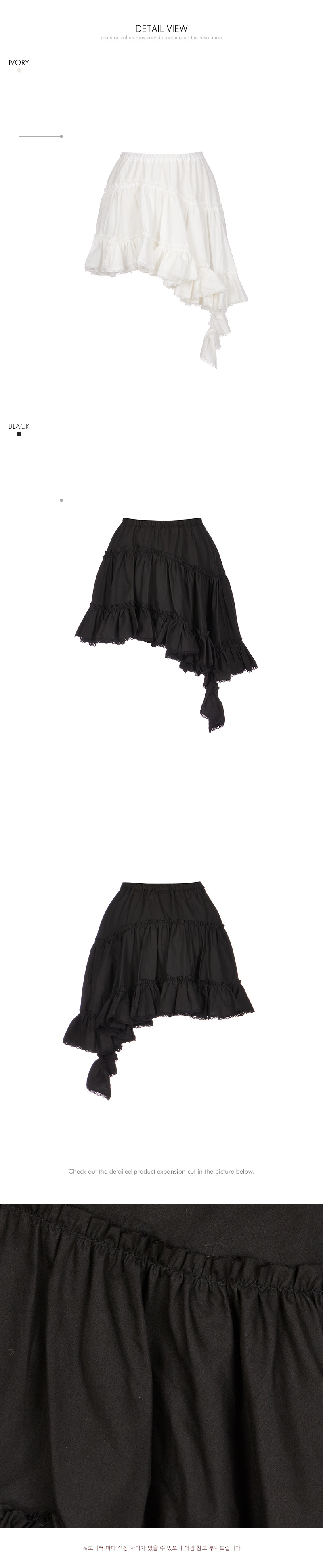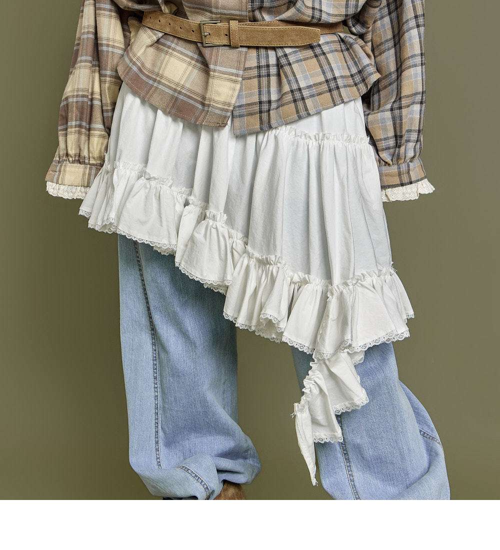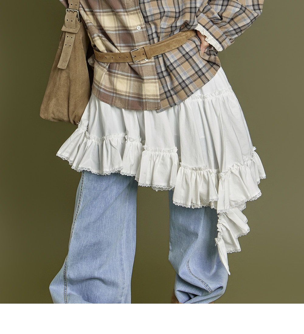 这是一款休闲风格的不对称荷叶边半身裙。