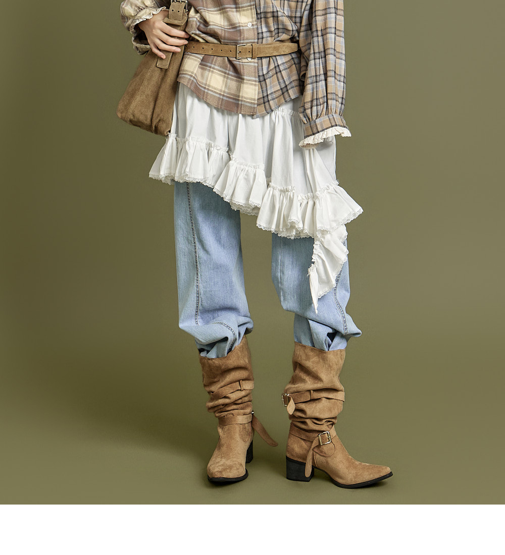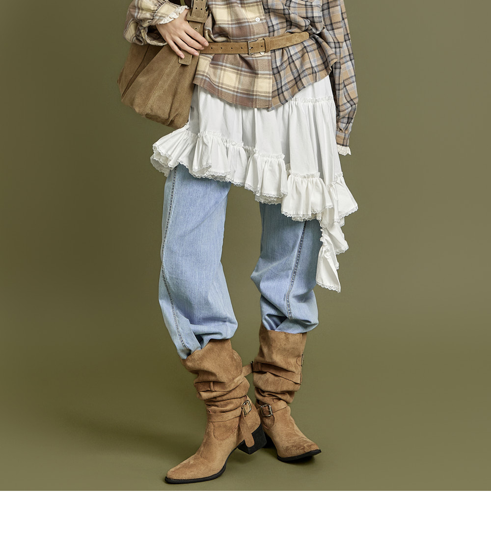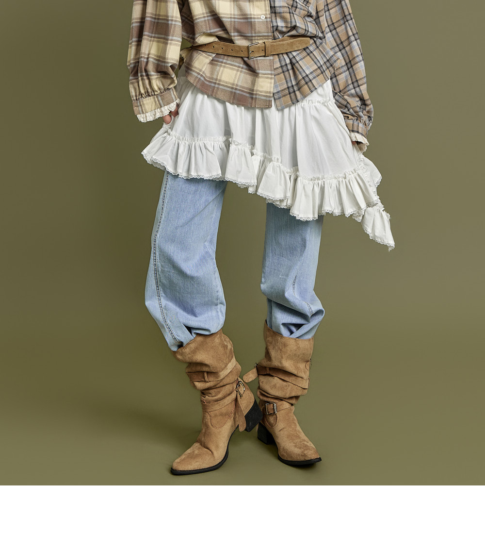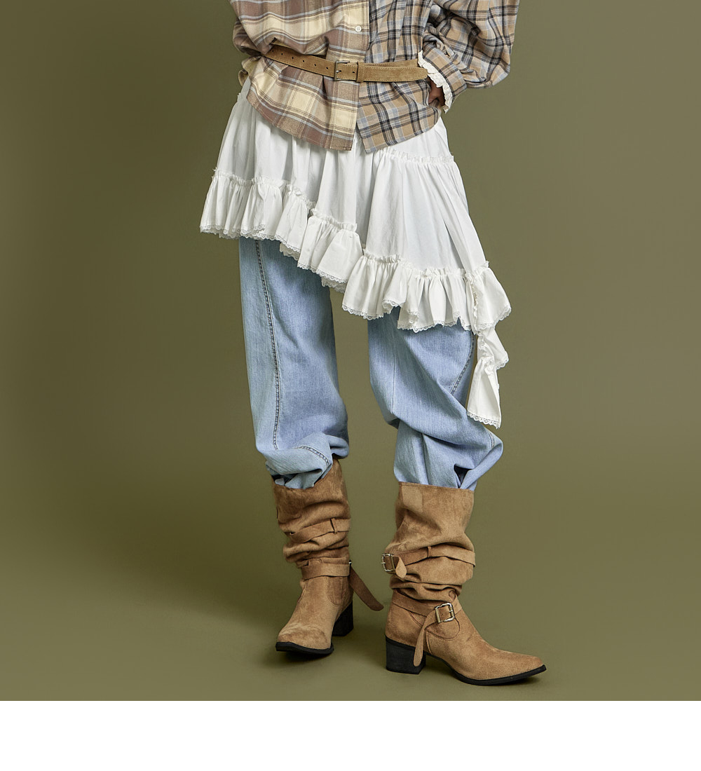 这是一款休闲风格的不对称荷叶边半身裙。