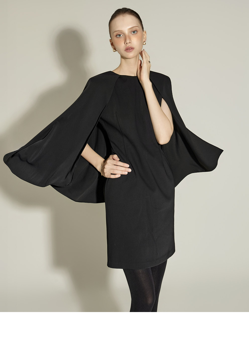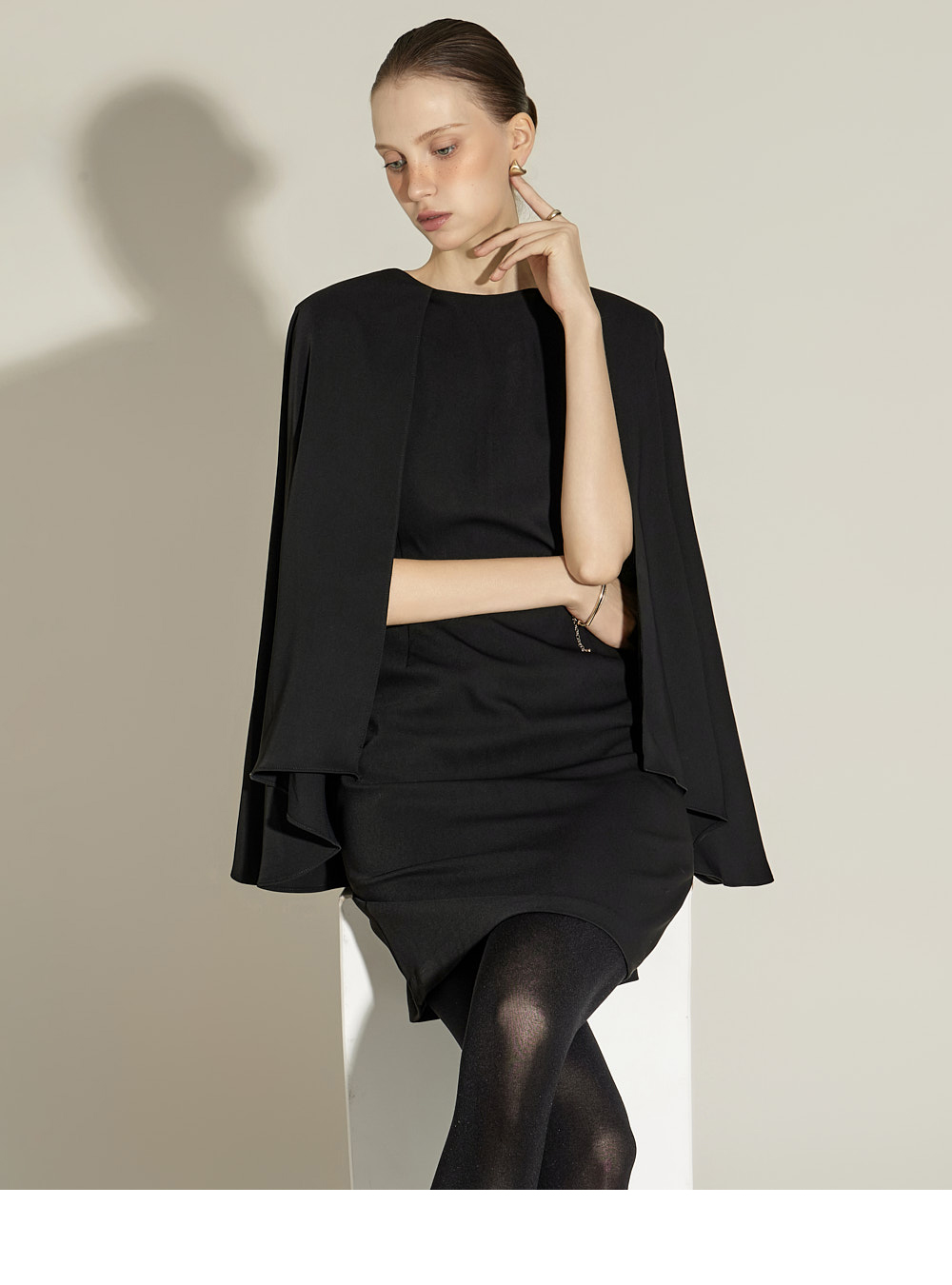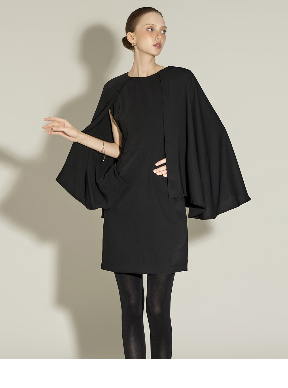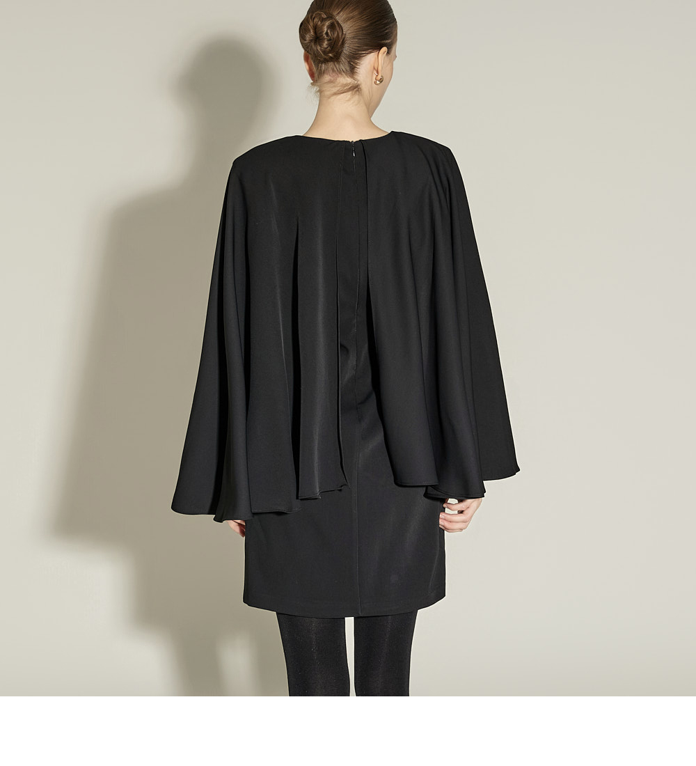 这是一款高级感十足的连衣裙。 采用聚酯纤维面料制作,质地光滑且挺括,S、M 两种尺码可根据身形选择。 无袖设计搭配披肩式袖片,展现优雅的轮廓,迷你长度增添精致气质,适度的肩垫修饰肩线,使整体更挺拔。 H型裙身剪裁,呈现干练修身线条,后背拉链设计便于穿脱,部分内衬增加穿着舒适感。 散发女性化且高级的气息,适合正式场合或特别日子穿着。 174CM 模特穿 S 尺码,示范黑色款。