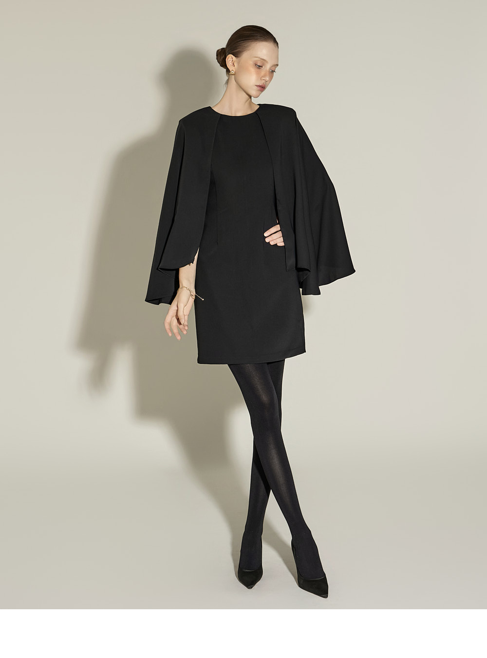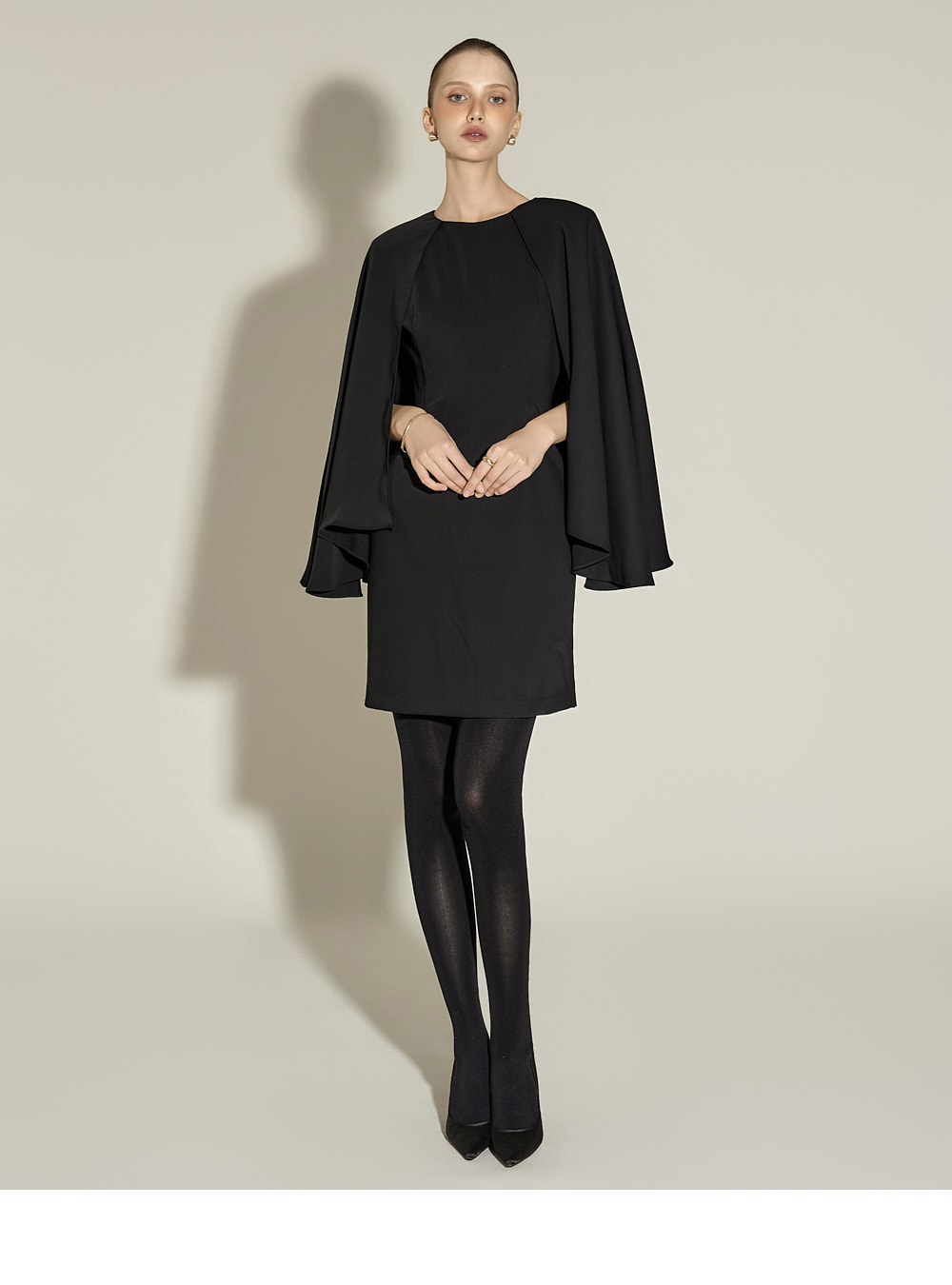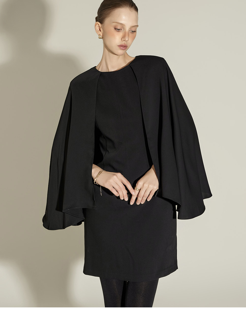 这是一款高级感十足的连衣裙。 采用聚酯纤维面料制作,质地光滑且挺括,S、M 两种尺码可根据身形选择。 无袖设计搭配披肩式袖片,展现优雅的轮廓,迷你长度增添精致气质,适度的肩垫修饰肩线,使整体更挺拔。 H型裙身剪裁,呈现干练修身线条,后背拉链设计便于穿脱,部分内衬增加穿着舒适感。 散发女性化且高级的气息,适合正式场合或特别日子穿着。 174CM 模特穿 S 尺码,示范黑色款。