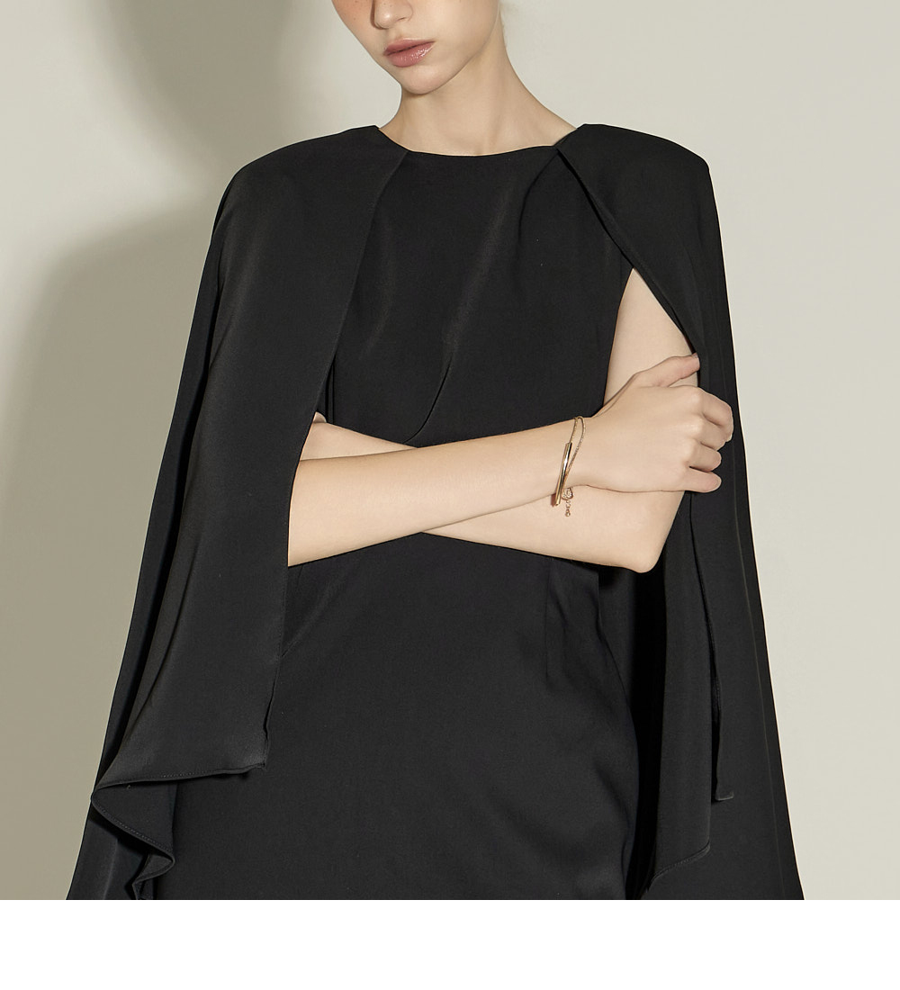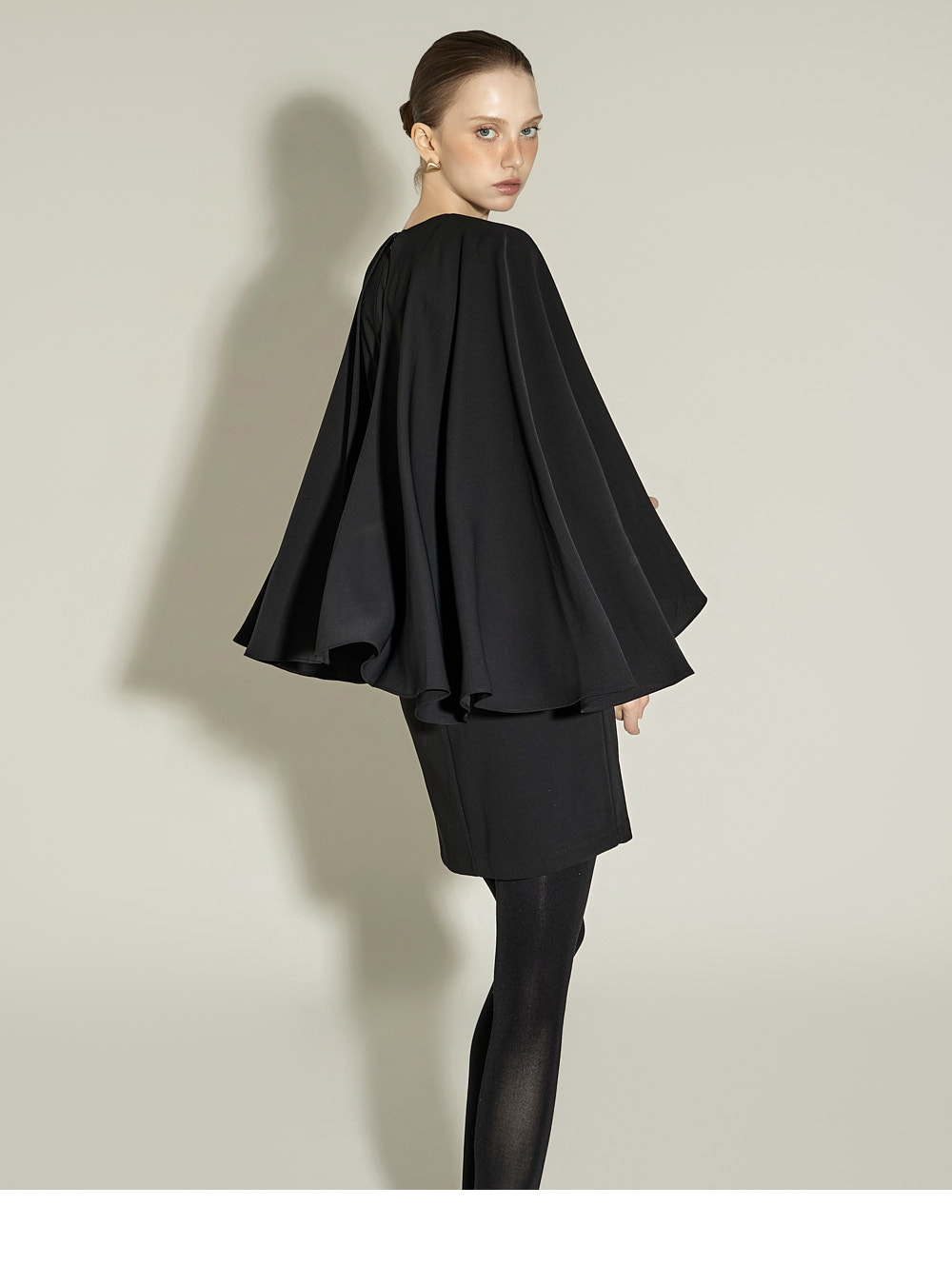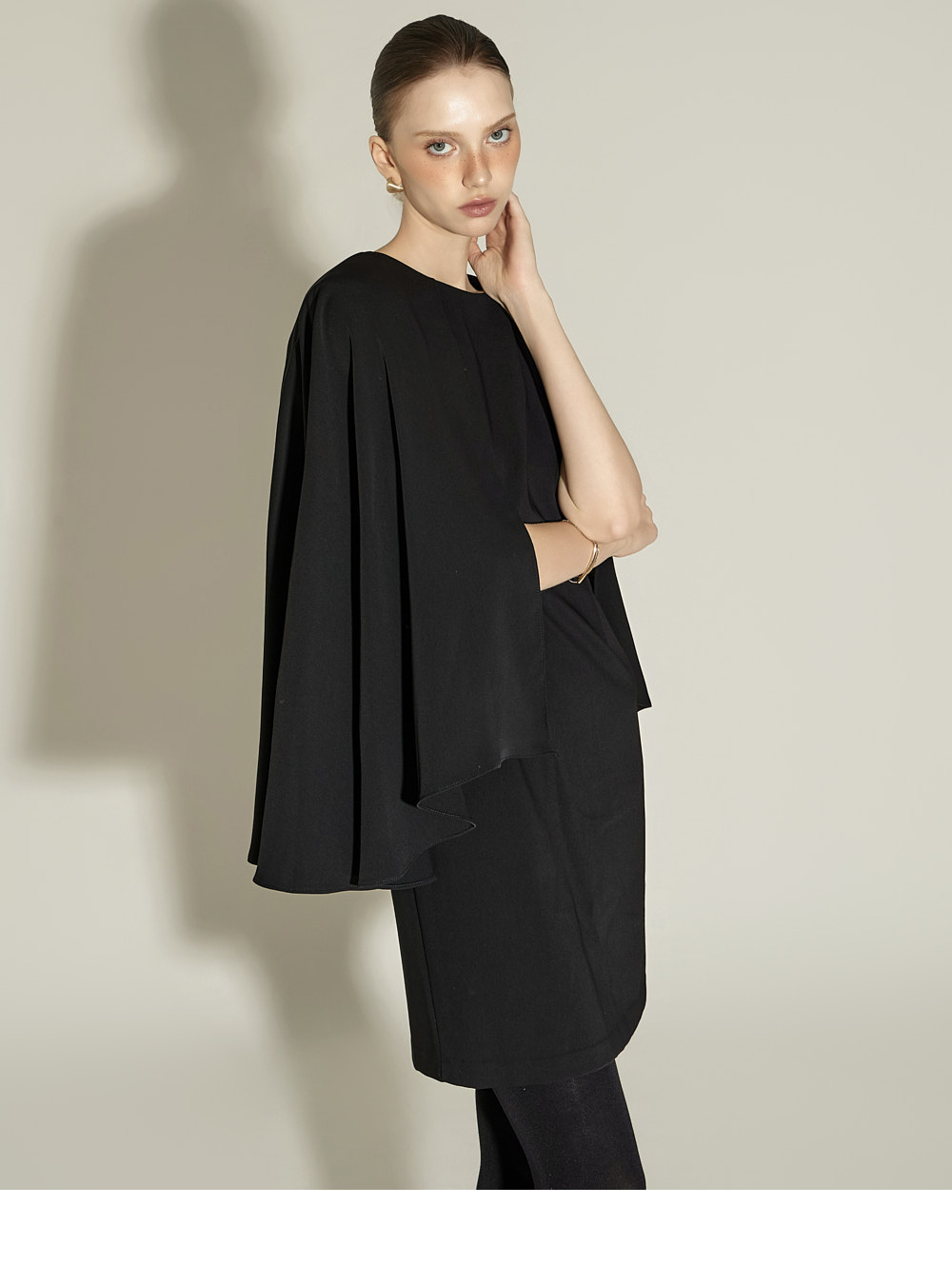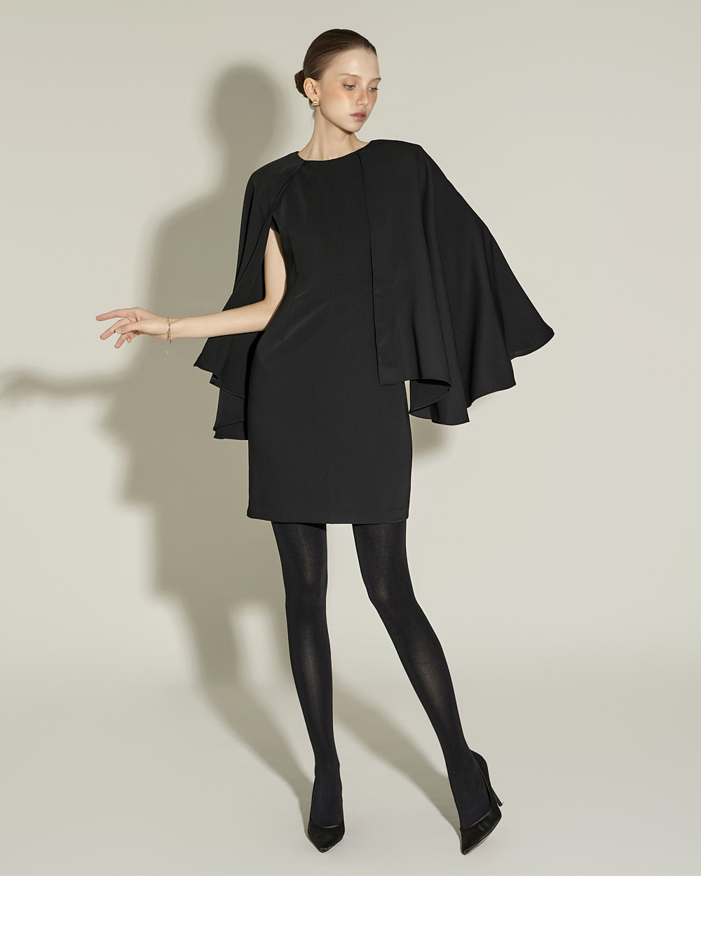 这是一款高级感十足的连衣裙。 采用聚酯纤维面料制作,质地光滑且挺括,S、M 两种尺码可根据身形选择。 无袖设计搭配披肩式袖片,展现优雅的轮廓,迷你长度增添精致气质,适度的肩垫修饰肩线,使整体更挺拔。 H型裙身剪裁,呈现干练修身线条,后背拉链设计便于穿脱,部分内衬增加穿着舒适感。 散发女性化且高级的气息,适合正式场合或特别日子穿着。 174CM 模特穿 S 尺码,示范黑色款。