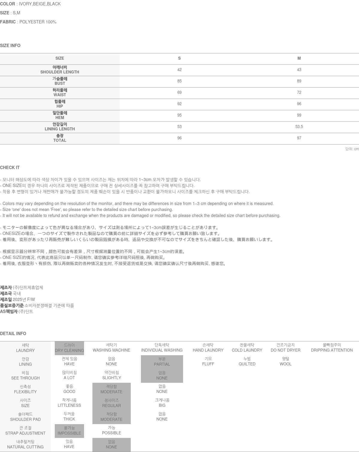 換貨 與 退貨 收到商品後, 7日內能在我的頁面申請交換或退貨, 申請後請將商品寄回DINT. 申請後, 請填寫包裹裡一同寄去的撤回申請書, 再將包裹包裝成一開始您收到時的狀態(包裝袋、衣架、贈品皆要一起寄送回來)發送至DINT即可. 因爲顧客變心所申請的換貨與退貨, 運費將由顧客負擔;誤送或是商品瑕疵的部分, 將由DINT負擔運費. 退貨住所爲:首爾市 衿川區 加山洞 459-8號 大韓通運 7樓 DINT股份有限公司 品質保證標準說明:符合電子商務等有關消費者保護法律規定的消費者可申請交換或是退貨.