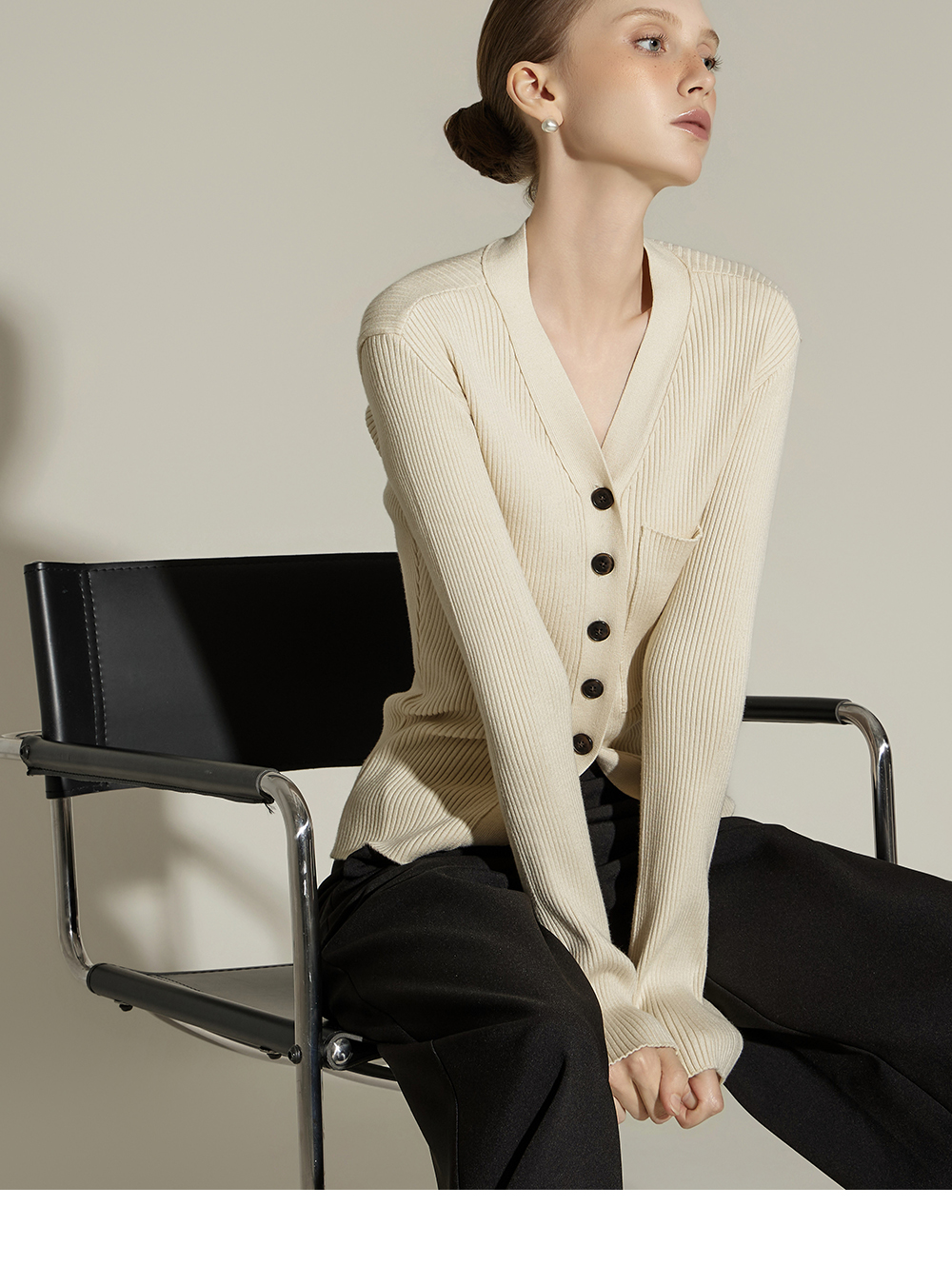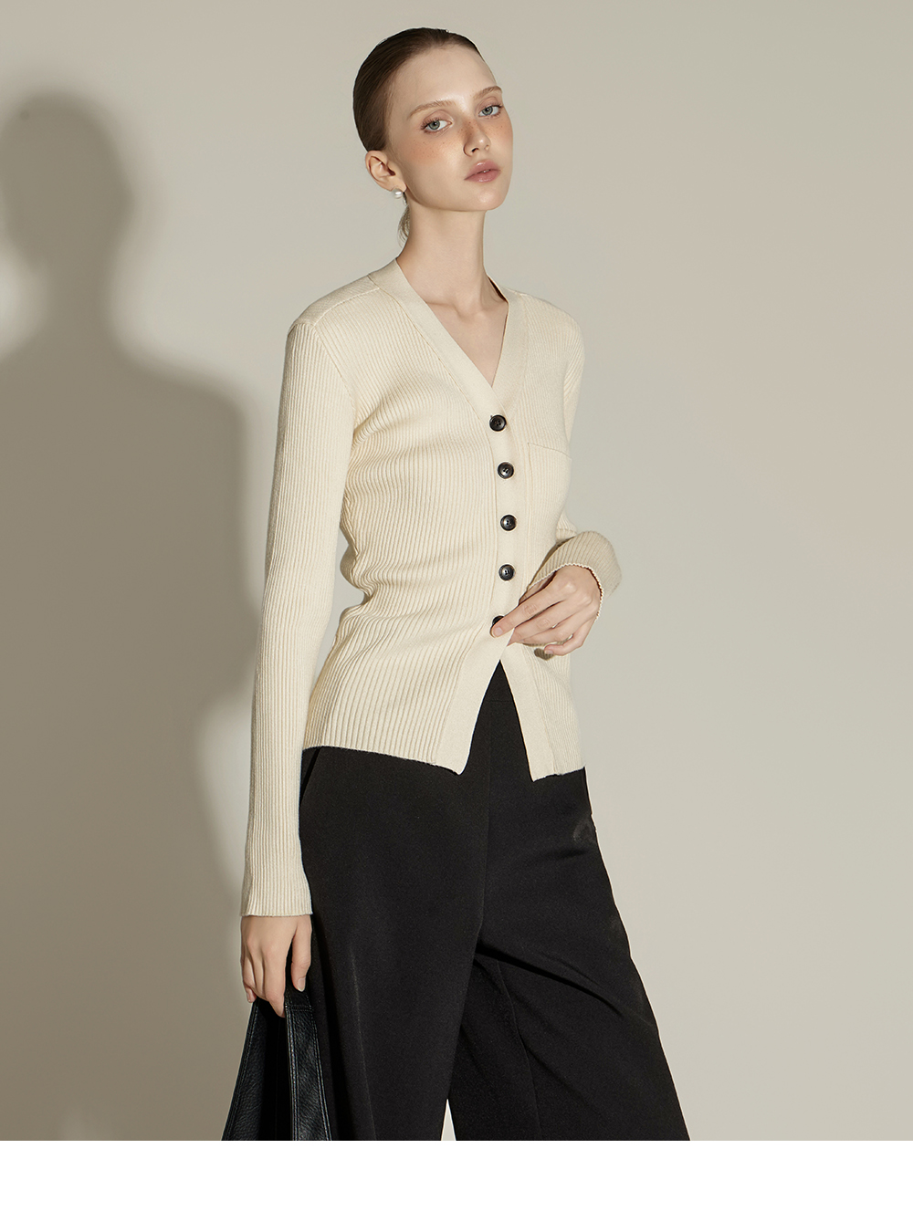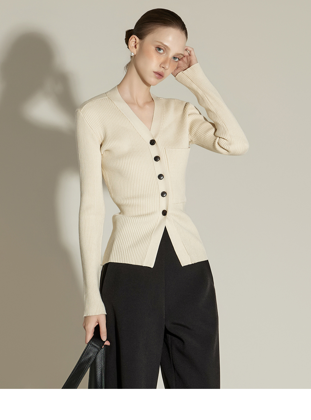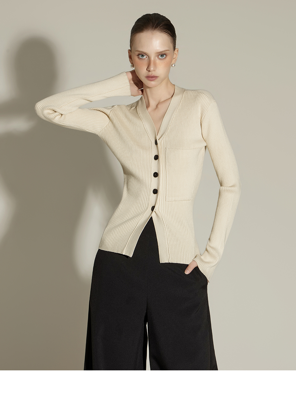 这是一款日常风格的开衫。 采用人造丝与聚酯纤维混纺面料,手感柔软且富有弹性,ONE 尺码设计可自然贴合身体线条,呈现流畅的剪裁轮廓。 罗纹针织凸显修身效果,面料富有弹性,穿着舒适。 前襟纽扣设计收边整洁,胸前口袋细节增添低调亮点,散发女性化又日常的氛围,是换季时期实用单品。 可单穿,也可与多种内搭组合,轻松打造时尚造型。 174CM 模特穿着 ONE 尺码,示范米色款。