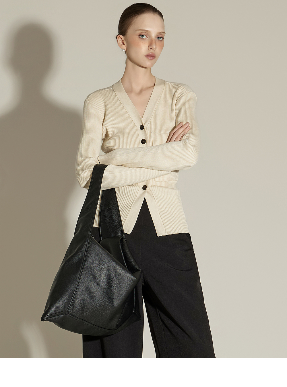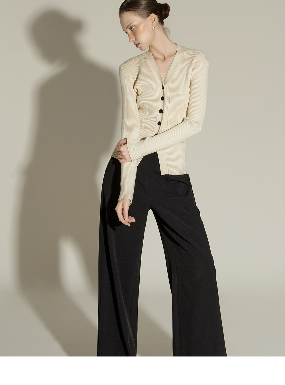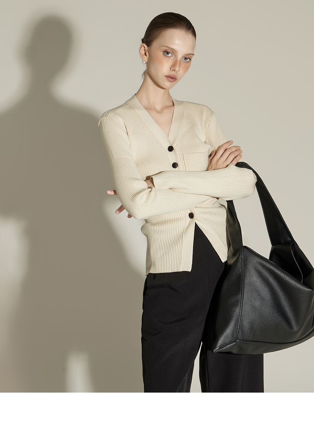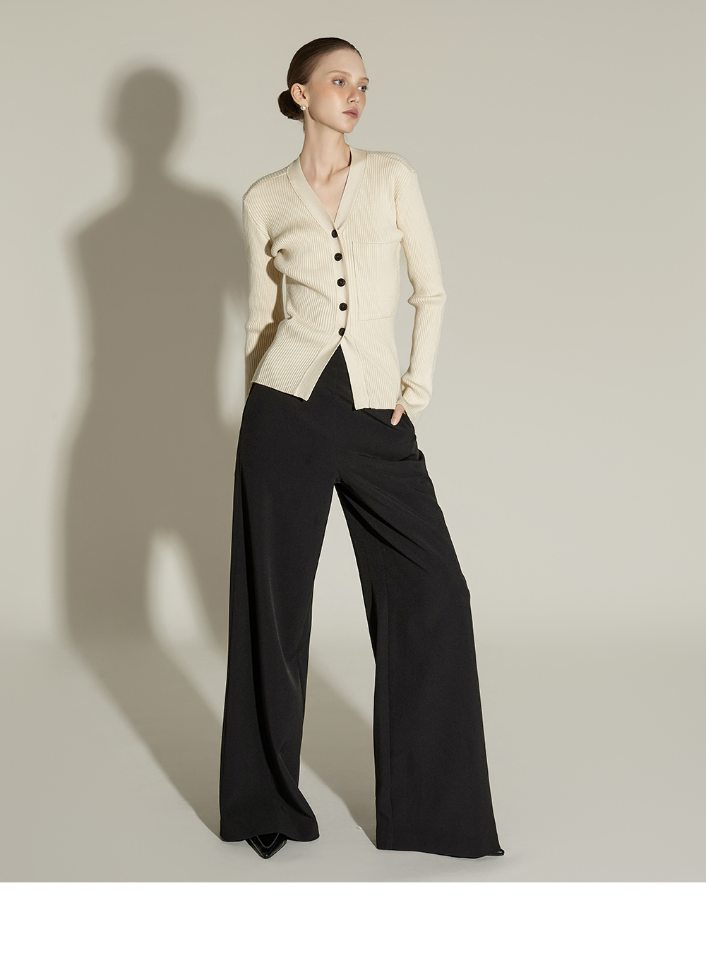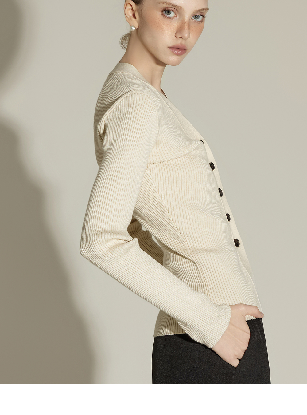 这是一款日常风格的开衫。 采用人造丝与聚酯纤维混纺面料,手感柔软且富有弹性,ONE 尺码设计可自然贴合身体线条,呈现流畅的剪裁轮廓。 罗纹针织凸显修身效果,面料富有弹性,穿着舒适。 前襟纽扣设计收边整洁,胸前口袋细节增添低调亮点,散发女性化又日常的氛围,是换季时期实用单品。 可单穿,也可与多种内搭组合,轻松打造时尚造型。 174CM 模特穿着 ONE 尺码,示范米色款。