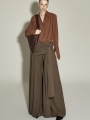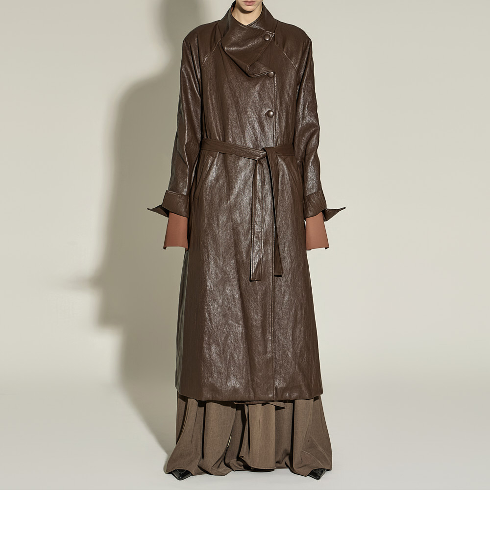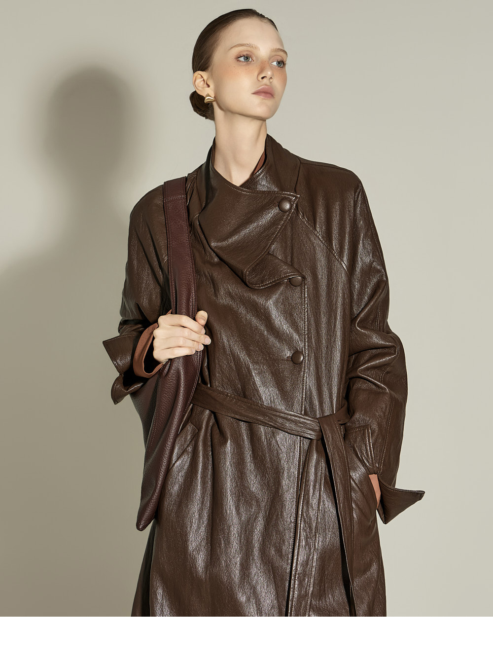 酷感风格的皮革外套。采用聚氨酯面料制作,质感坚挺且带有低调光泽,ONE 码设计呈现宽松而精致的廓形。在极简线条中突显结构化细节,营造强烈的个性氛围;前襟的垂褶设计增添独特感,腰部配套腰带可灵活调节整体轮廓。凭借面料本身的挺度与结构感展现存在感,塑造高贵而精致的视觉印象,并辅以全内衬提升整体品质。前襟纽扣闭合与双侧口袋增加实用性,非常适合作为早秋或晚春外套,打造硬朗有型的穿搭效果。174CM 模特,ONE 码,深棕色。