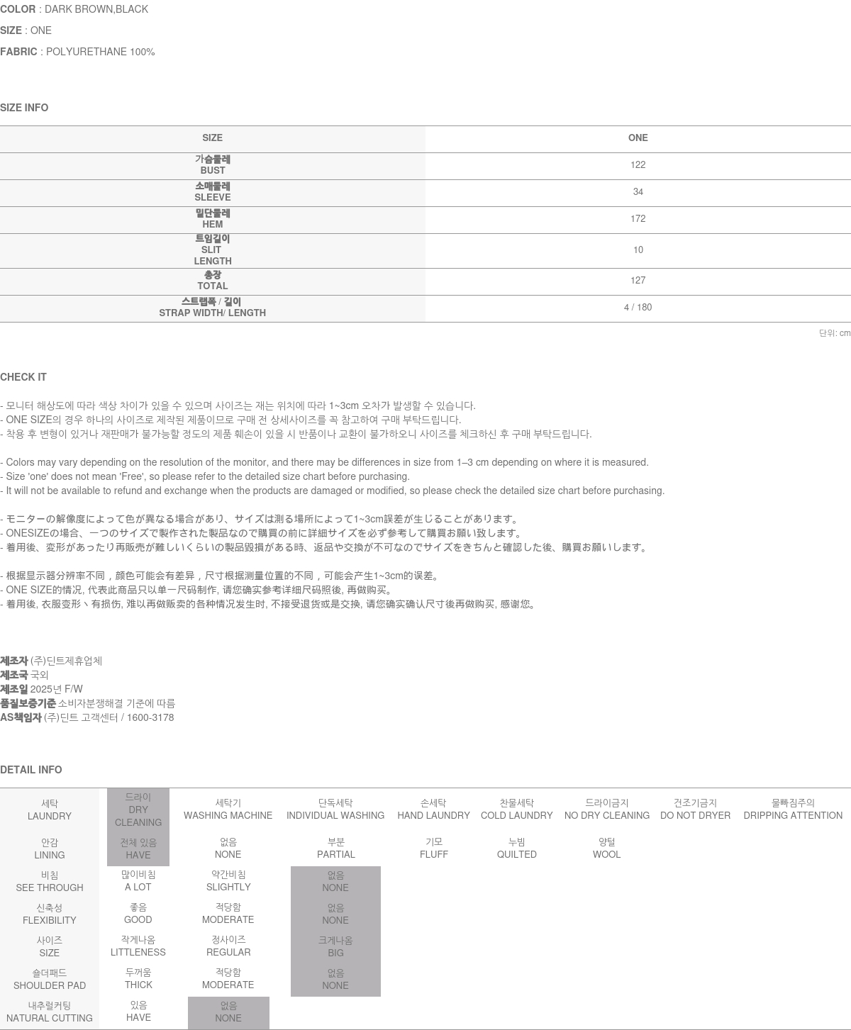 換貨 與 退貨 收到商品後, 7日內能在我的頁面申請交換或退貨, 申請後請將商品寄回DINT. 申請後, 請填寫包裹裡一同寄去的撤回申請書, 再將包裹包裝成一開始您收到時的狀態(包裝袋、衣架、贈品皆要一起寄送回來)發送至DINT即可. 因爲顧客變心所申請的換貨與退貨, 運費將由顧客負擔;誤送或是商品瑕疵的部分, 將由DINT負擔運費. 退貨住所爲:首爾市 衿川區 加山洞 459-8號 大韓通運 7樓 DINT股份有限公司 品質保證標準說明:符合電子商務等有關消費者保護法律規定的消費者可申請交換或是退貨.