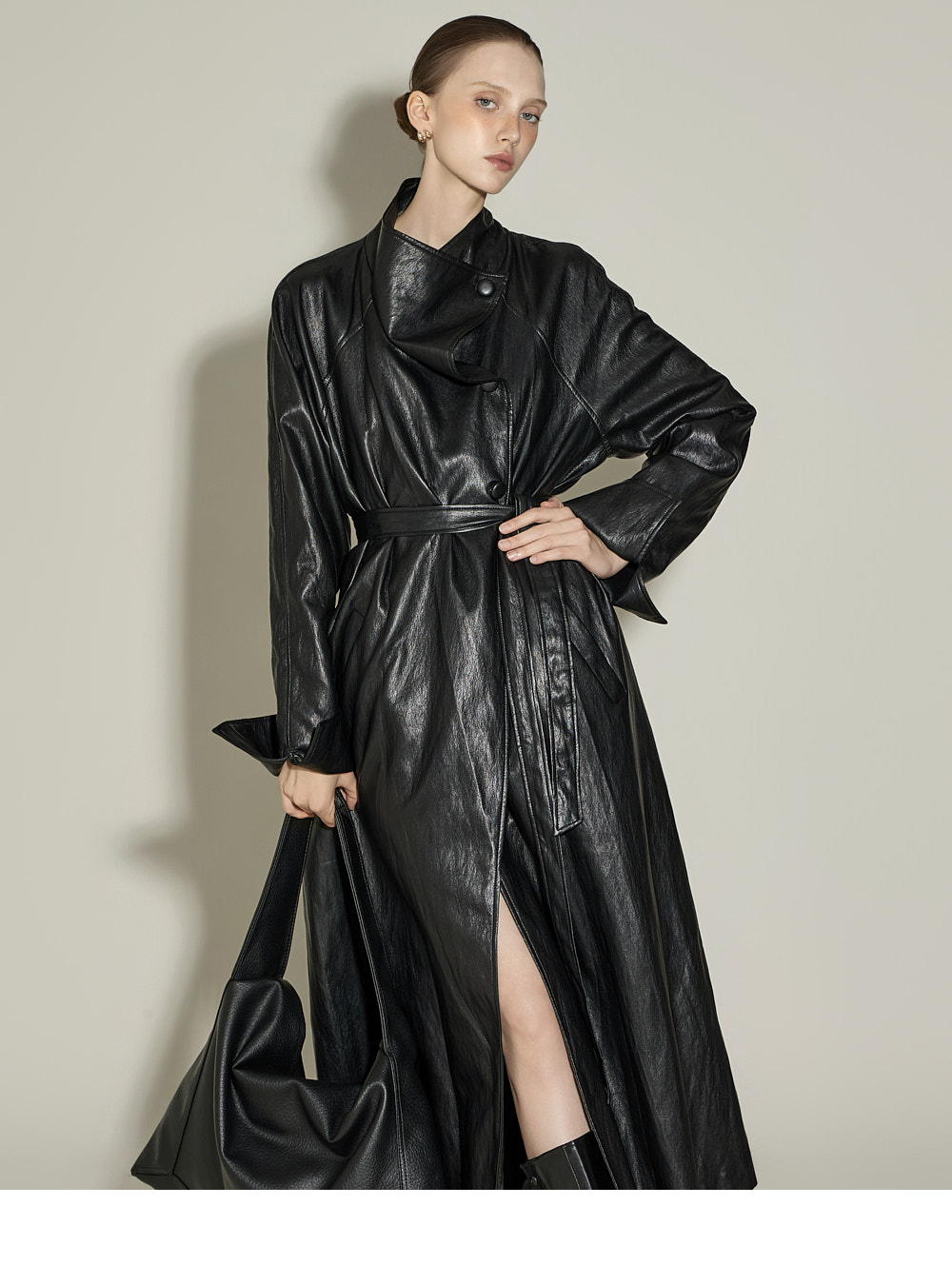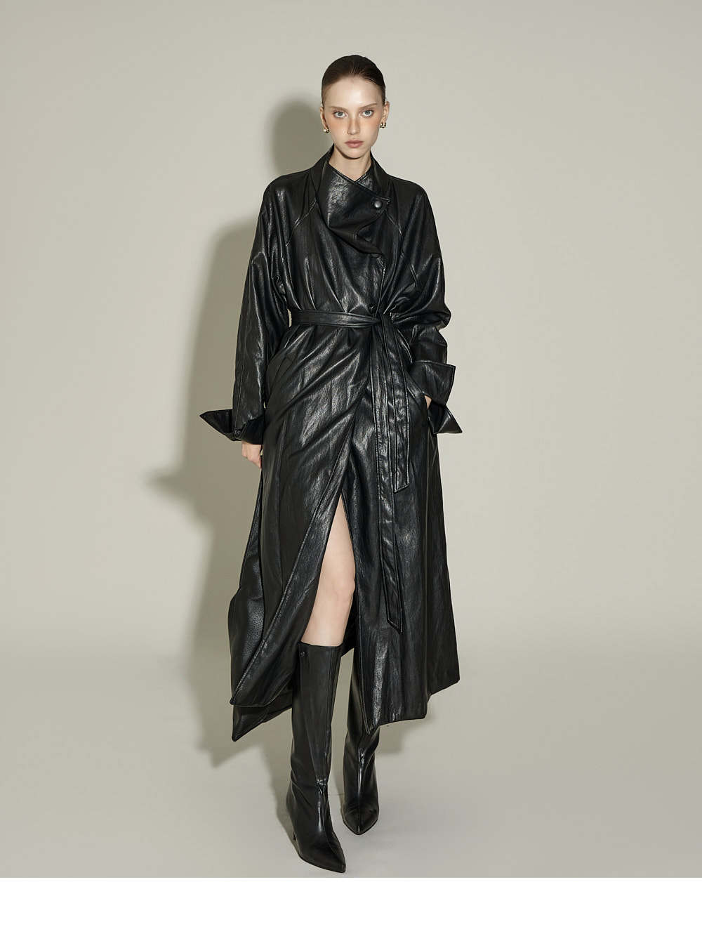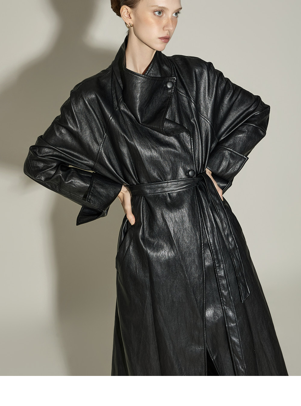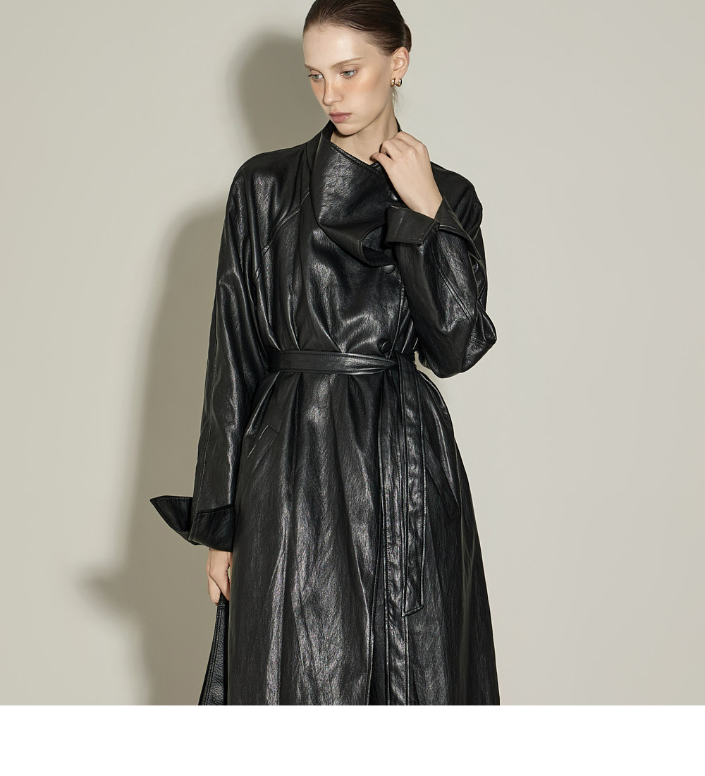 酷感风格的皮革外套。 采用聚氨酯面料制作,质感坚挺且带有低调光泽,ONE 码设计呈现宽松而精致的廓形。 在极简线条中突显结构化细节,营造强烈的个性氛围;前襟的垂褶设计增添独特感,腰部配套腰带可灵活调节整体轮廓。 凭借面料本身的挺度与结构感展现存在感,塑造高贵而精致的视觉印象,并辅以全内衬提升整体品质。 前襟纽扣闭合与双侧口袋增加实用性,非常适合作为早秋或晚春外套,打造硬朗有型的穿搭效果。 174CM 模特,ONE 码,BLACK 色。
