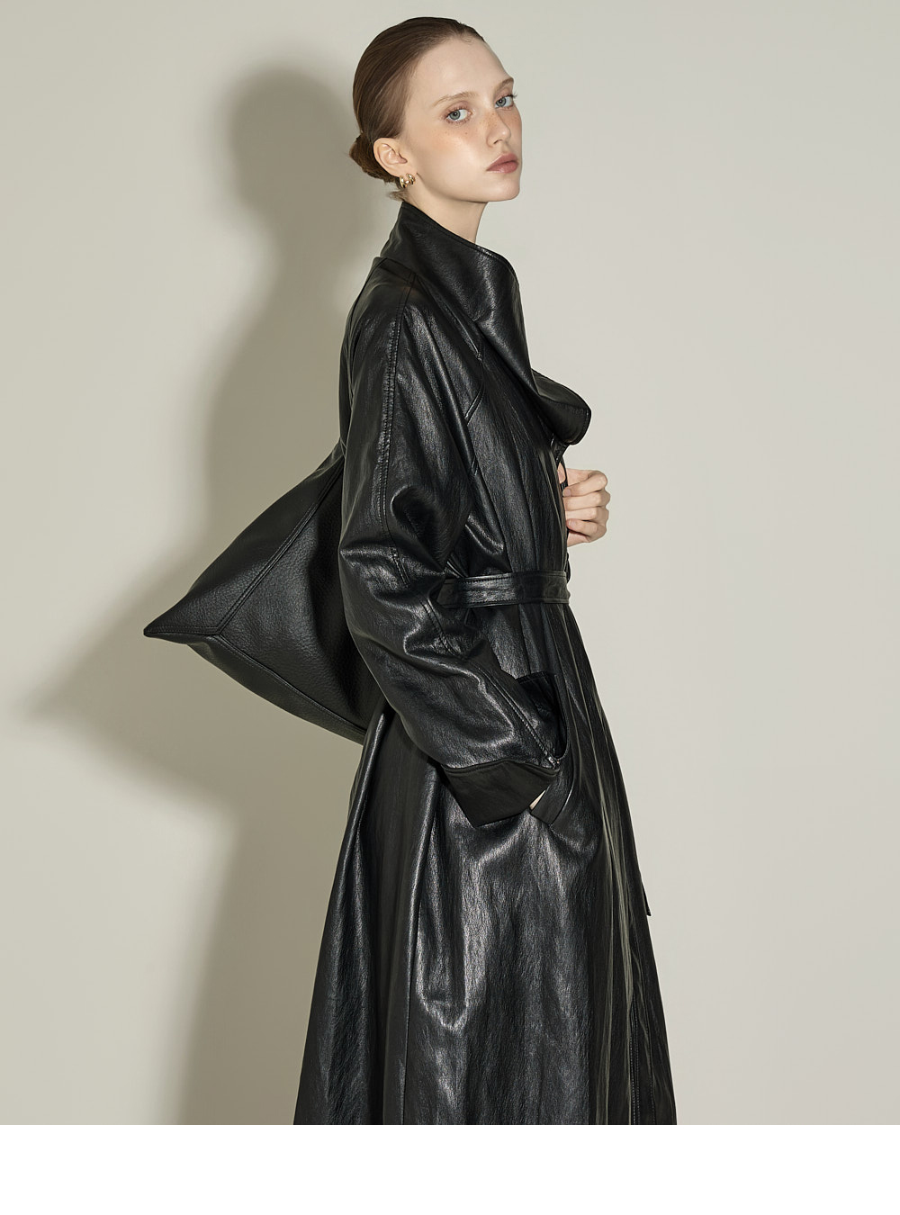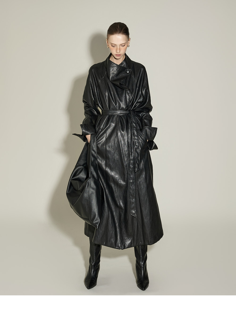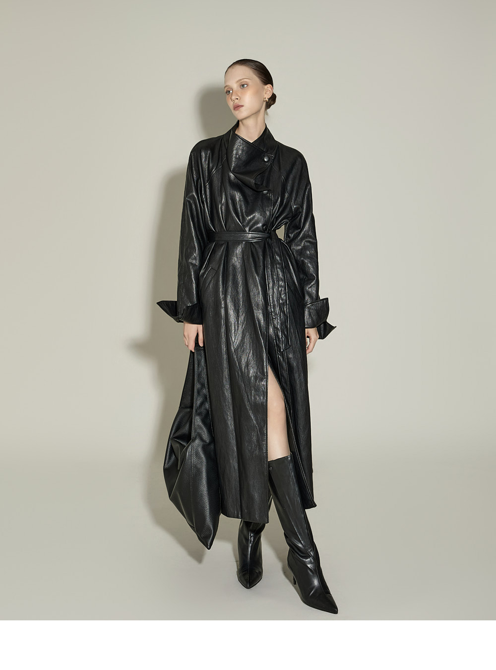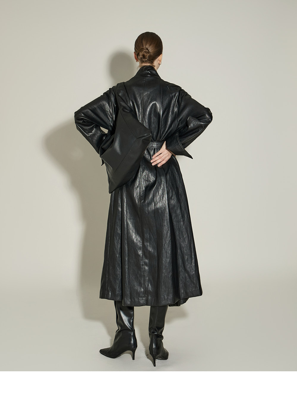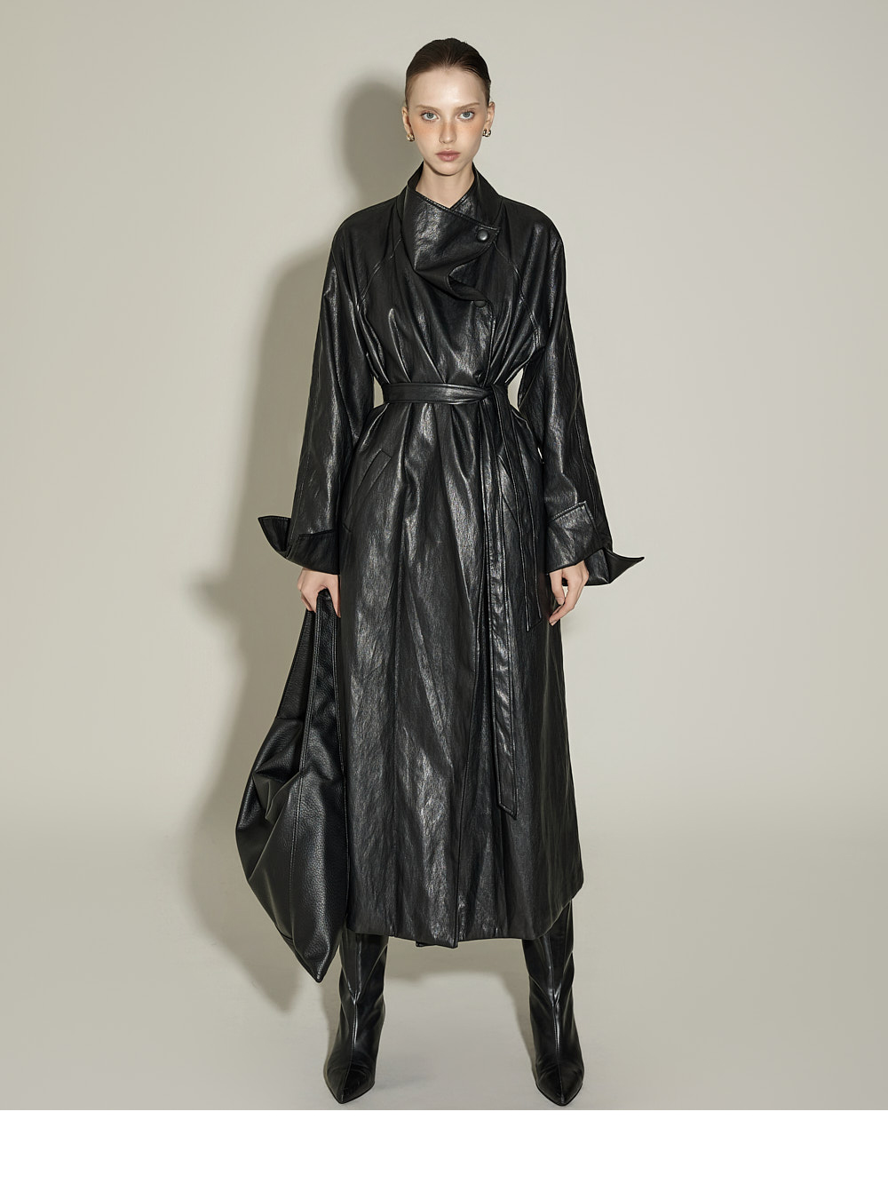 酷感风格的皮革外套。 采用聚氨酯面料制作,质感坚挺且带有低调光泽,ONE 码设计呈现宽松而精致的廓形。 在极简线条中突显结构化细节,营造强烈的个性氛围;前襟的垂褶设计增添独特感,腰部配套腰带可灵活调节整体轮廓。 凭借面料本身的挺度与结构感展现存在感,塑造高贵而精致的视觉印象,并辅以全内衬提升整体品质。 前襟纽扣闭合与双侧口袋增加实用性,非常适合作为早秋或晚春外套,打造硬朗有型的穿搭效果。 174CM 模特,ONE 码,BLACK 色。