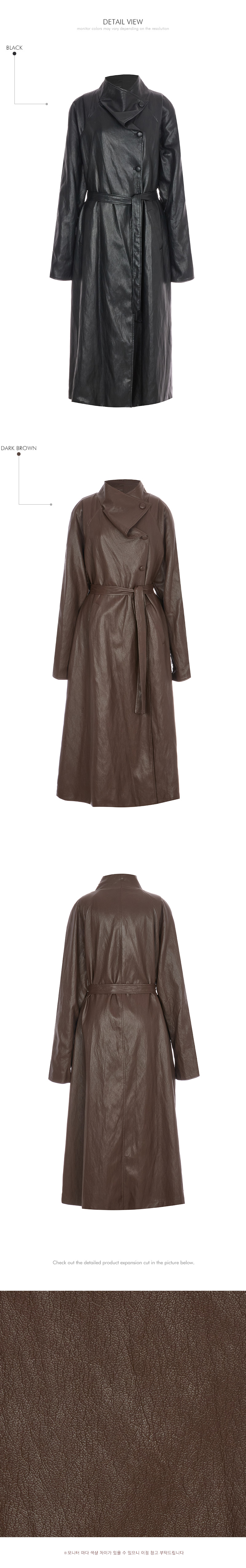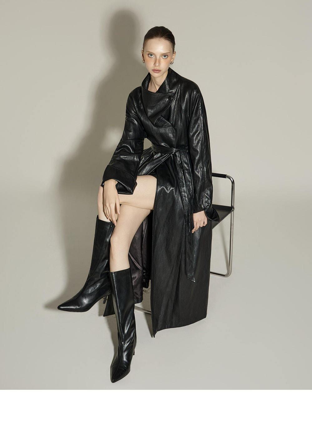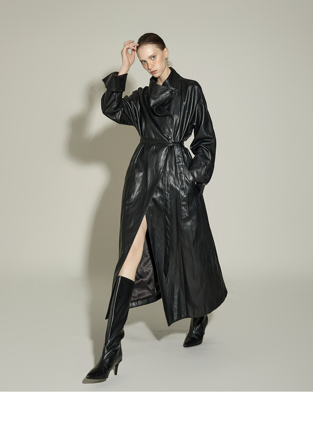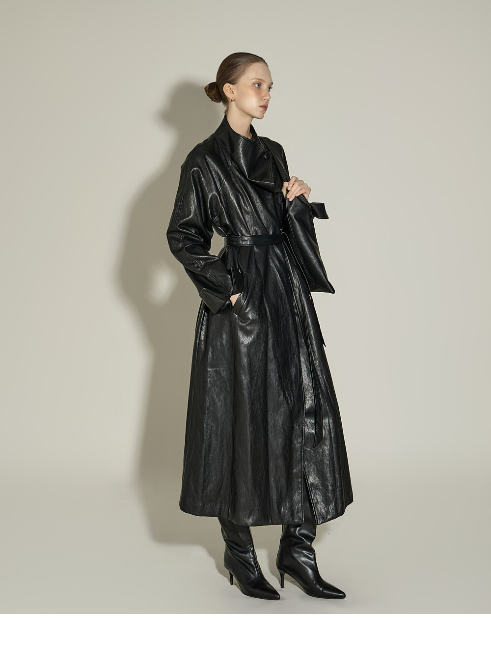 酷感风格的皮革外套。 采用聚氨酯面料制作,质感坚挺且带有低调光泽,ONE 码设计呈现宽松而精致的廓形。 在极简线条中突显结构化细节,营造强烈的个性氛围;前襟的垂褶设计增添独特感,腰部配套腰带可灵活调节整体轮廓。 凭借面料本身的挺度与结构感展现存在感,塑造高贵而精致的视觉印象,并辅以全内衬提升整体品质。 前襟纽扣闭合与双侧口袋增加实用性,非常适合作为早秋或晚春外套,打造硬朗有型的穿搭效果。 174CM 模特,ONE 码,BLACK 色。