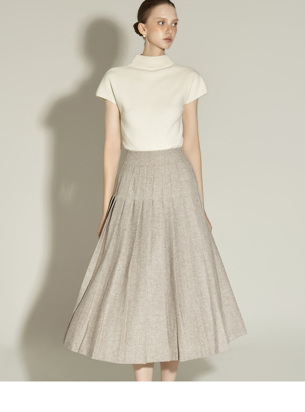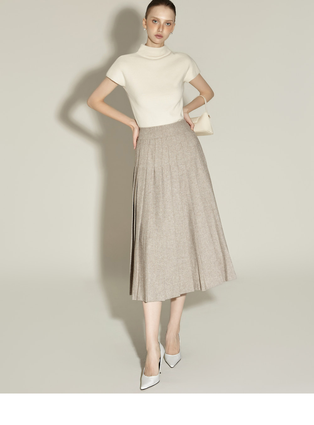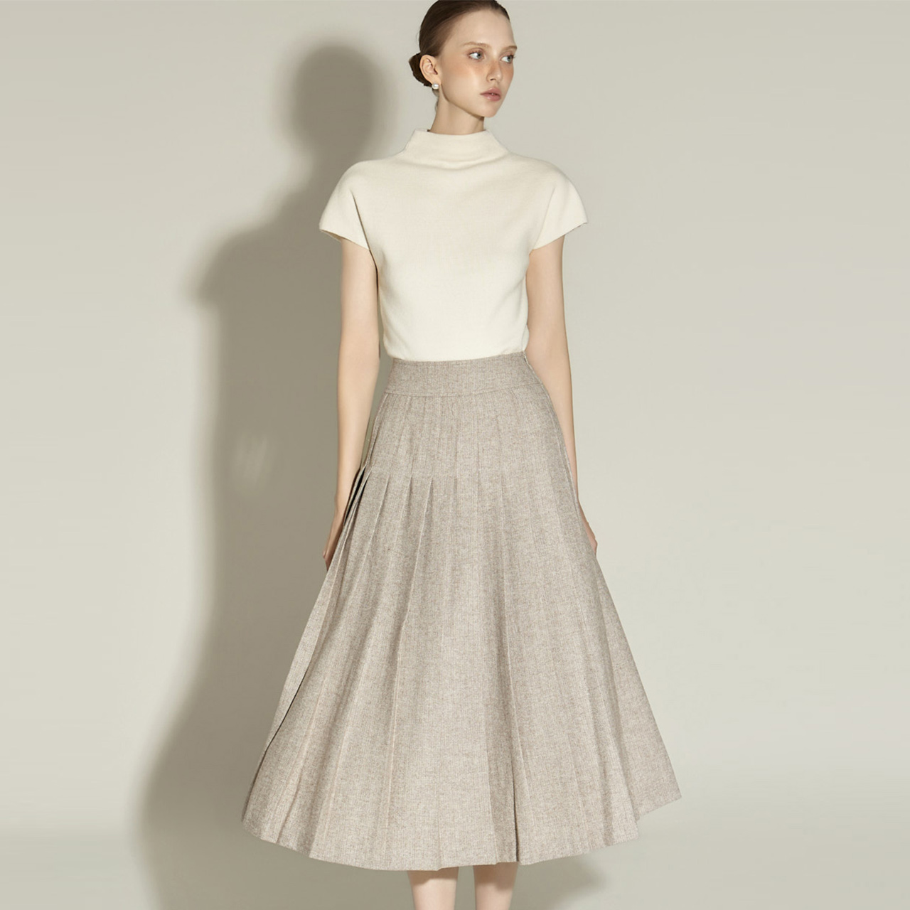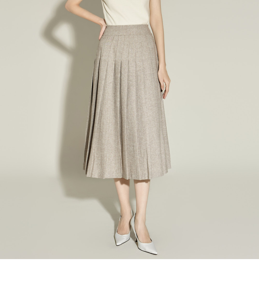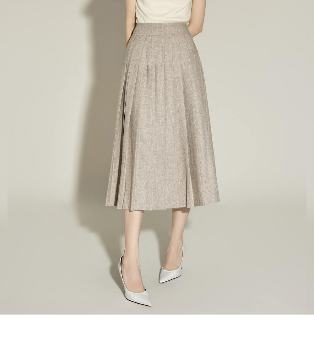 休闲风格的毛呢羊毛半身裙。 由羊毛与聚酯混纺面料制成,带来温暖的穿着感,同时增添经典气质。 长款剪裁与自然散开的 A 字版型,既能修饰身形,又展现女性优雅的氛围,微妙的百褶设计为造型增添不单调的精致感。 与同材质夹克搭配成套穿着,能打造更整洁且有品味的日常造型,单独穿着时也可轻松与毛衣、衬衫等多种上衣搭配。 174CM 模特,穿 S 码,BEIGE 色。
