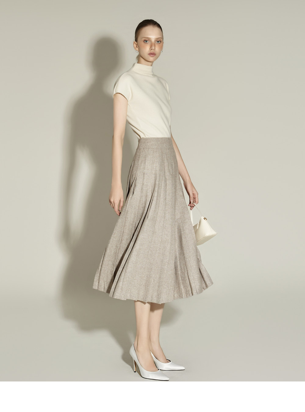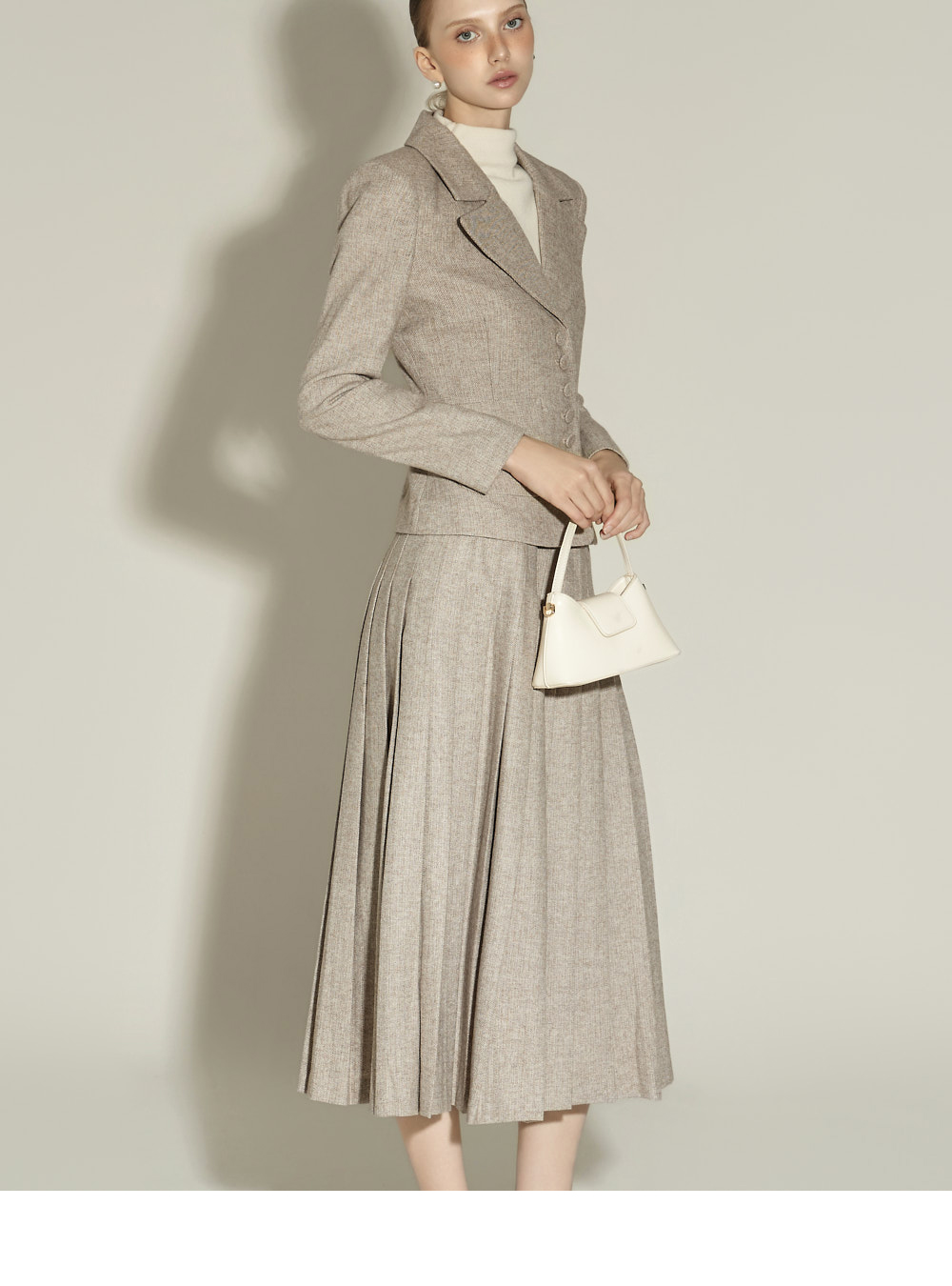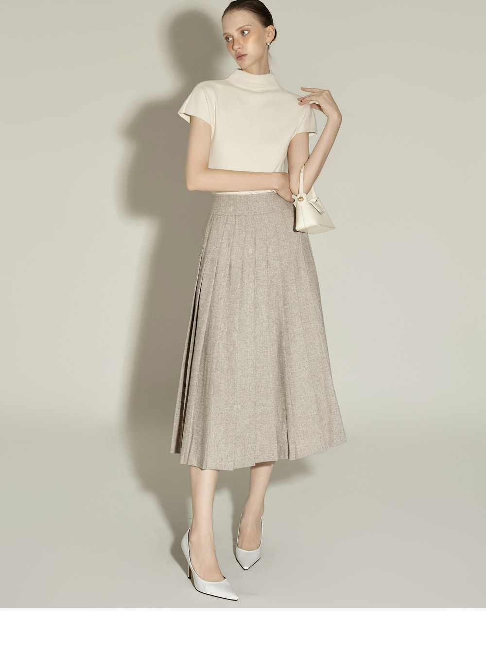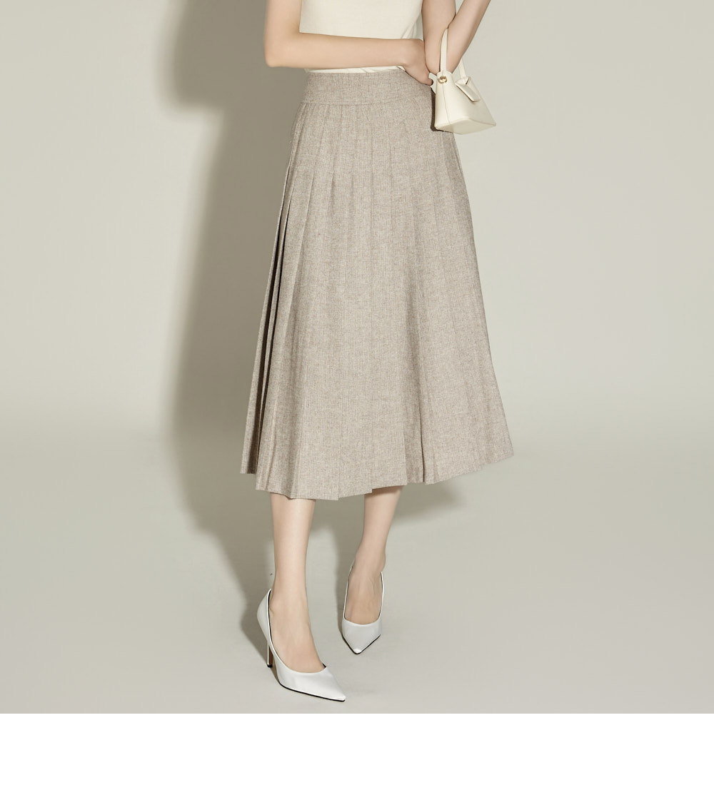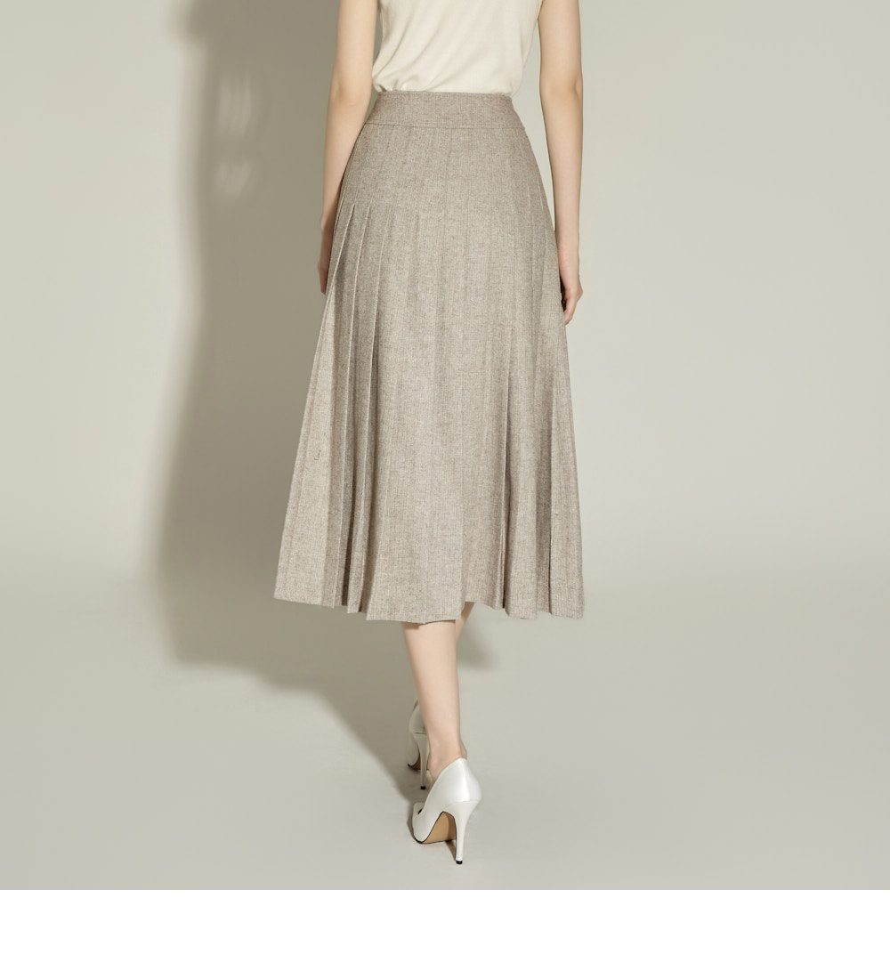 休闲风格的毛呢羊毛半身裙。 由羊毛与聚酯混纺面料制成,带来温暖的穿着感,同时增添经典气质。 长款剪裁与自然散开的 A 字版型,既能修饰身形,又展现女性优雅的氛围,微妙的百褶设计为造型增添不单调的精致感。 与同材质夹克搭配成套穿着,能打造更整洁且有品味的日常造型,单独穿着时也可轻松与毛衣、衬衫等多种上衣搭配。 174CM 模特,穿 S 码,BEIGE 色。